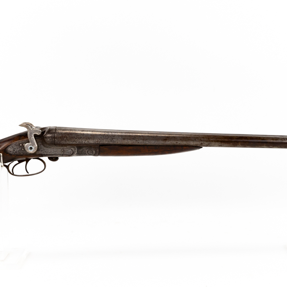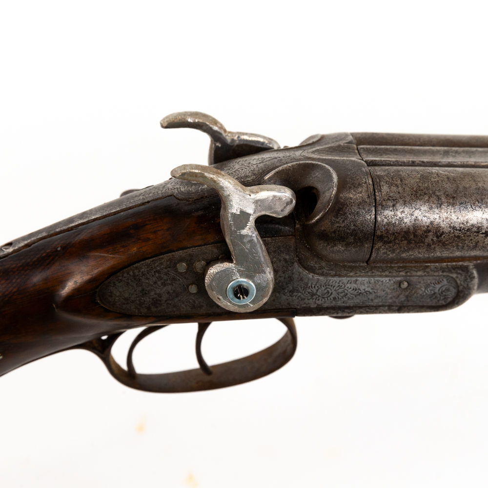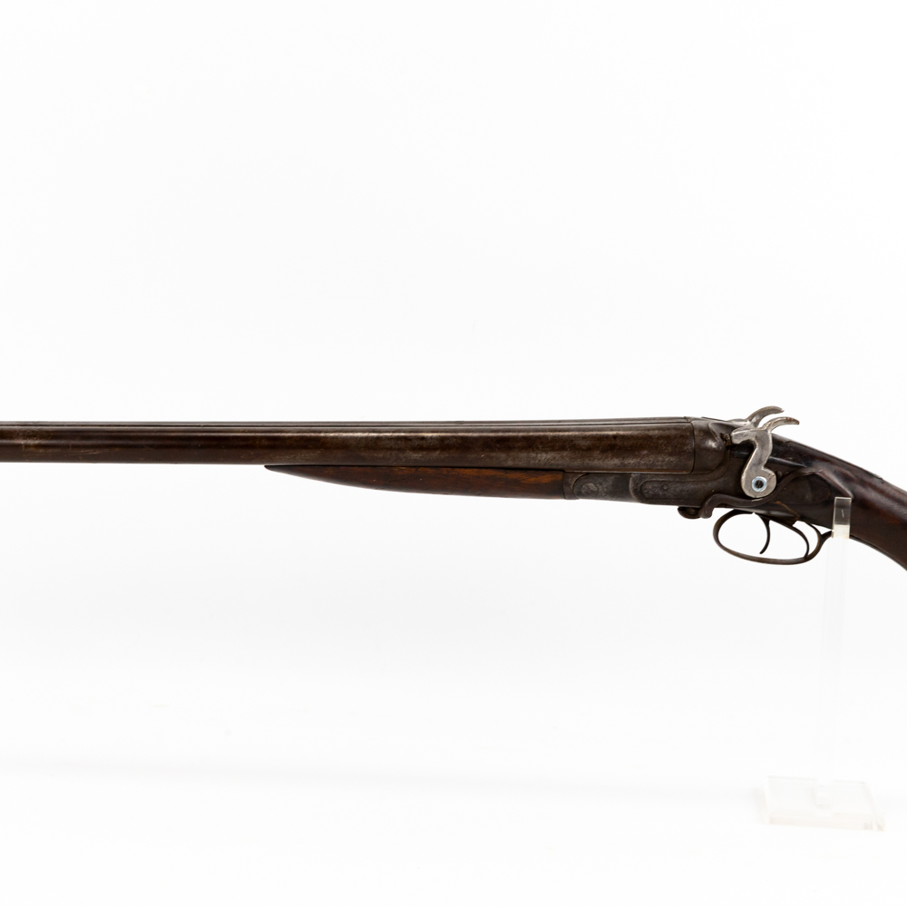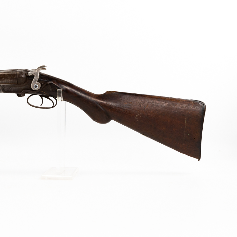 Hollis & Son SxS 12g 32″ Side Lever Shotgun in fair condition with wear and oxidation. Hammers are painted. Minute wiggle in lock up. Bores have oxidation. There’s a chip in the toe of the stock. C&R Eligible S/N:27123