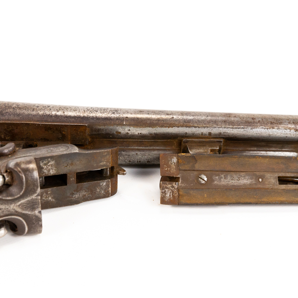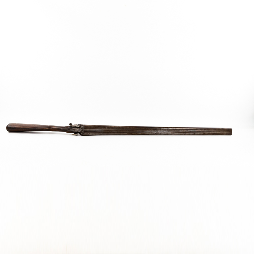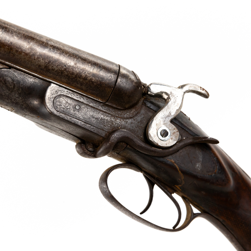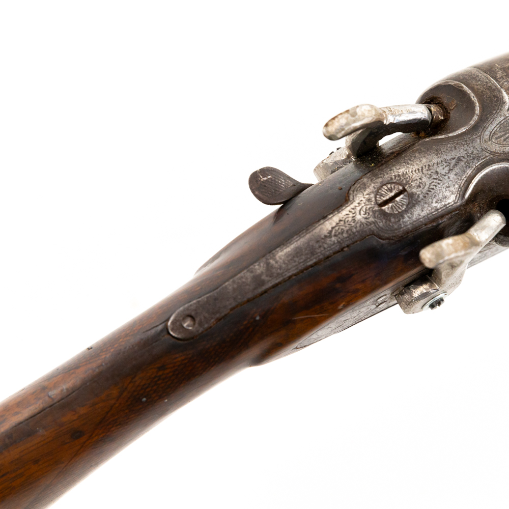 Hollis & Son SxS 12g 32″ Side Lever Shotgun in fair condition with wear and oxidation. Hammers are painted. Minute wiggle in lock up. Bores have oxidation. There’s a chip in the toe of the stock. C&R Eligible S/N:27123
