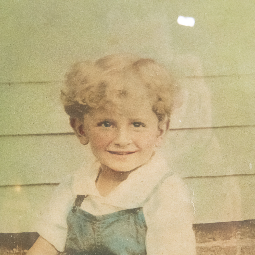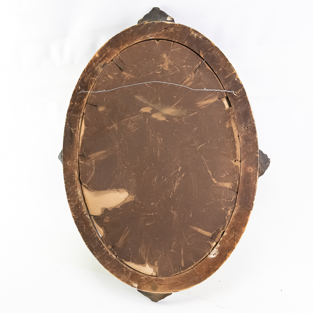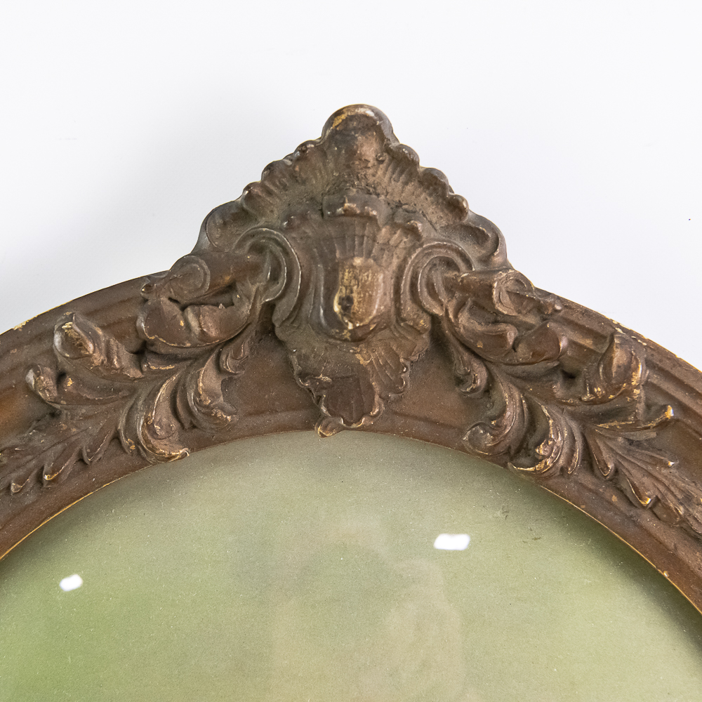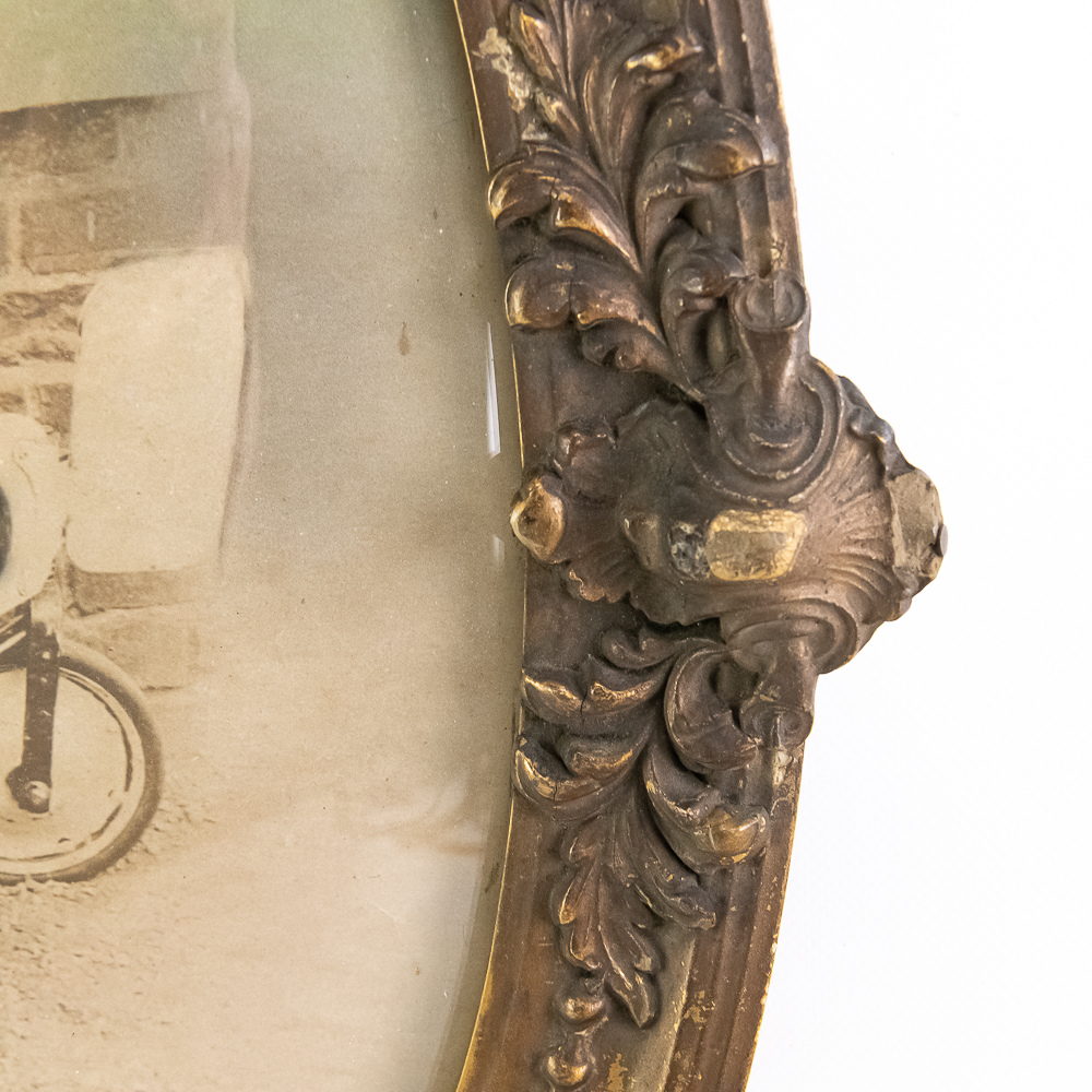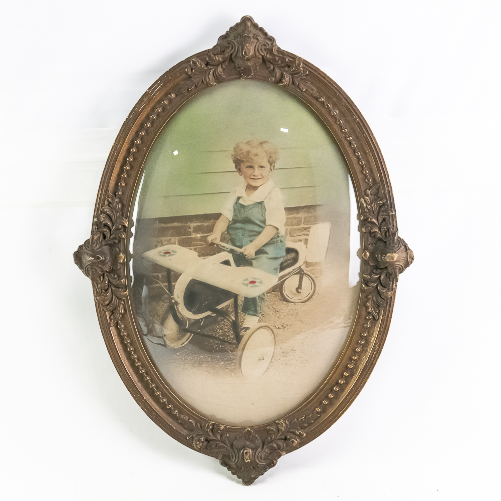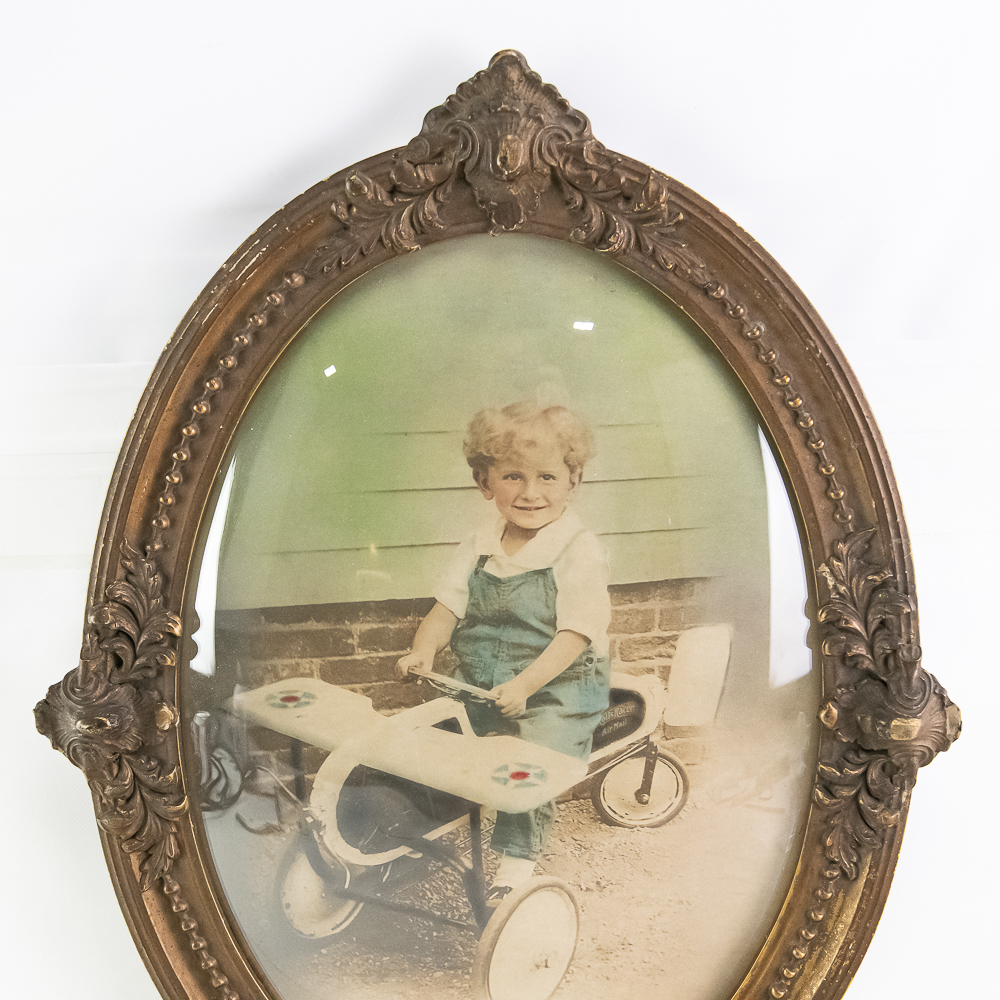 Hand colored photograph of a young boy sitting in a Rolls Racer Air Mail pedal airplane mounted in a decorated gold oval frame with convex glass. In VG condition. Measures 25.5″ tall, 18.5″ wide.