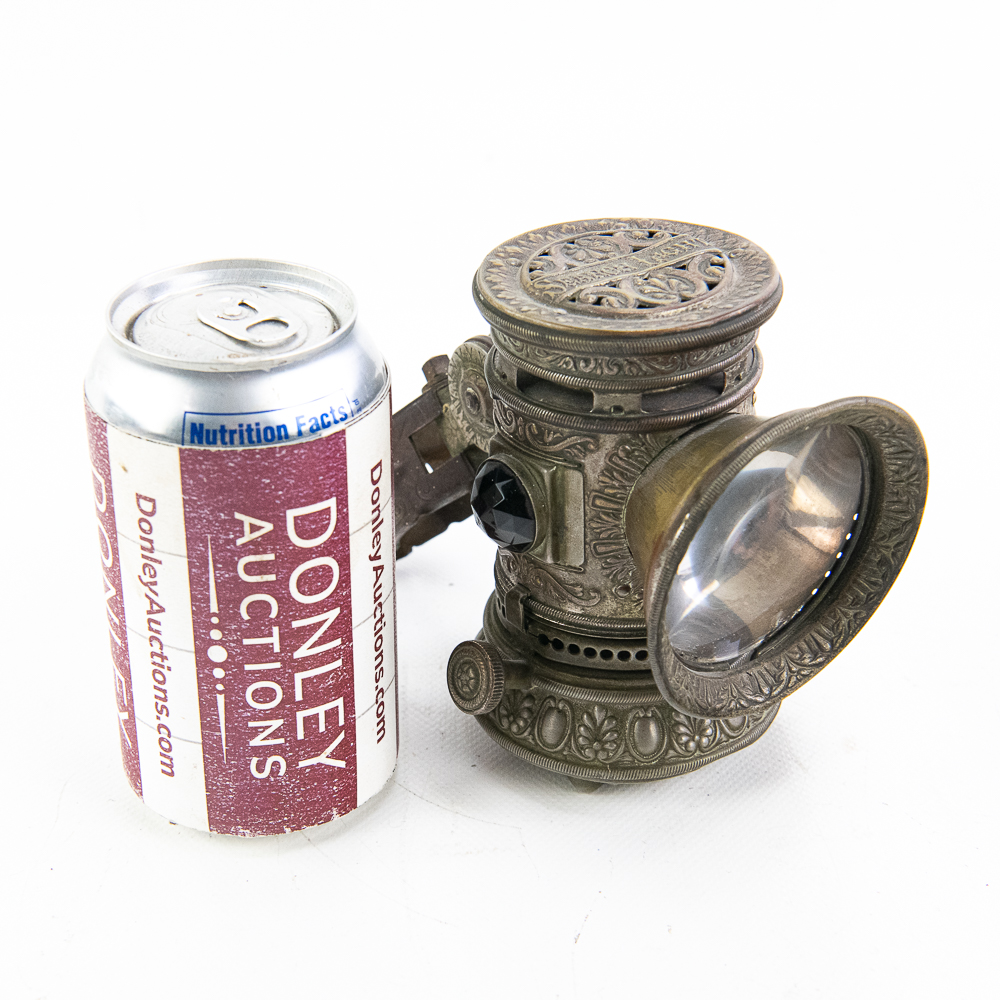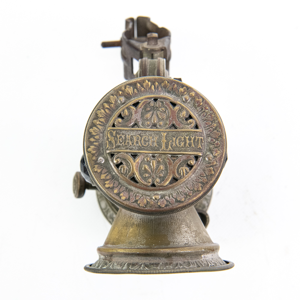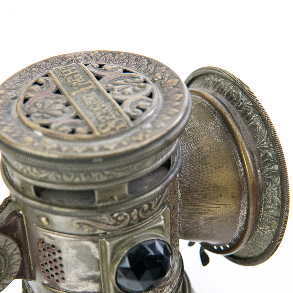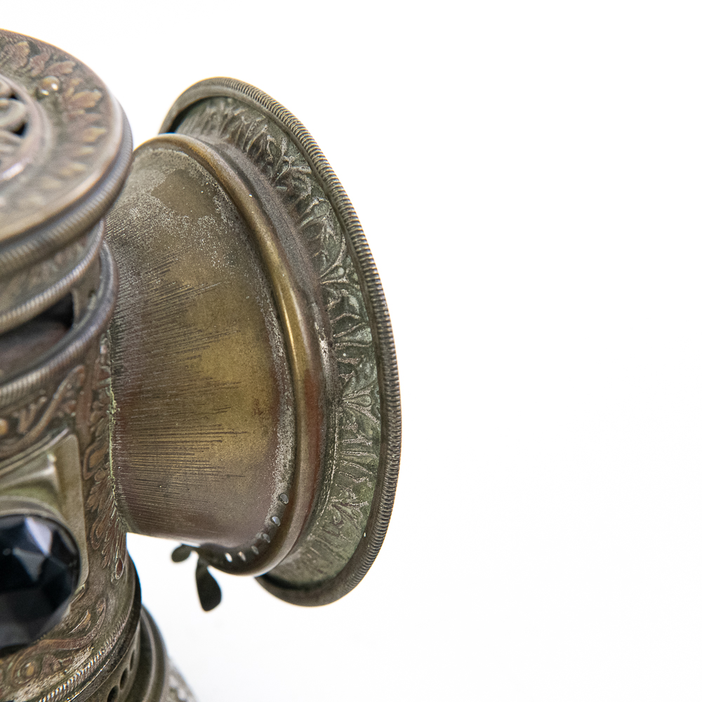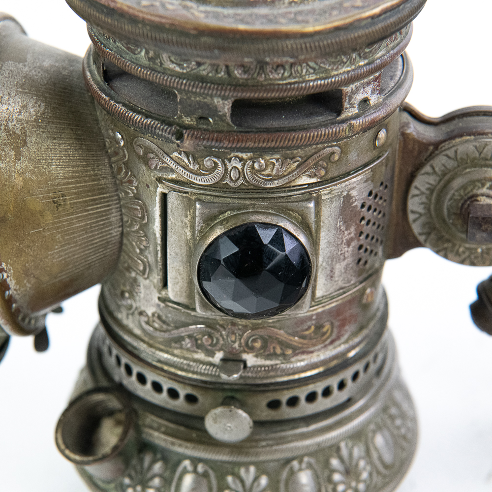 Highly desirable “Search Light” Bicycle Lamp, manufactured by the Bridgeport Brass Company in Bridgeport, Connecticut, USA. This top-of-the-line kerosene oil lamp dates to the peak of the bicycle lamp era, circa 1897-1900, based on Louis Hornberger’s design patent. Constructed from nickel-plated brass, this model features exceptionally ornate, cast metalwork on the top (“SEARCH LIGHT”), the lens bezel, and the oil fount base. It retains its rare and important components, including the adjustable fork/fender clamp with its articulating arm, the front glass lens, and the striking red/green faceted side jewel reflector (two are visible in the photos). The oil burner apparatus is present inside the lamp’s cavity, which is a key completeness factor often missing. The lamp is in overall good, unpolished, antique condition. The original nickel plating shows a charming, aged finish with heavy patina, oxidation, and brass bleed-through, which collectors often prefer over polishing. There is minor surface wear consistent with over a century of age and use. The front lens appears intact, and the side jewels are securely mounted. The wick adjuster knob (on the right side) is present but there is no wick. H 5″, W 3.5″, D 7″ (including mount).