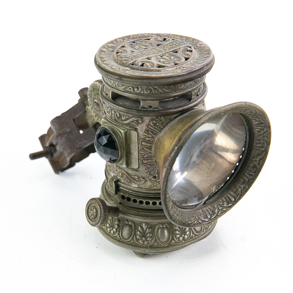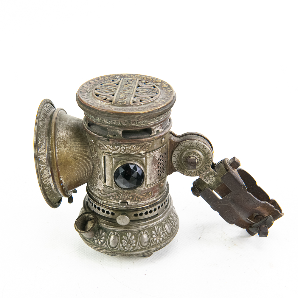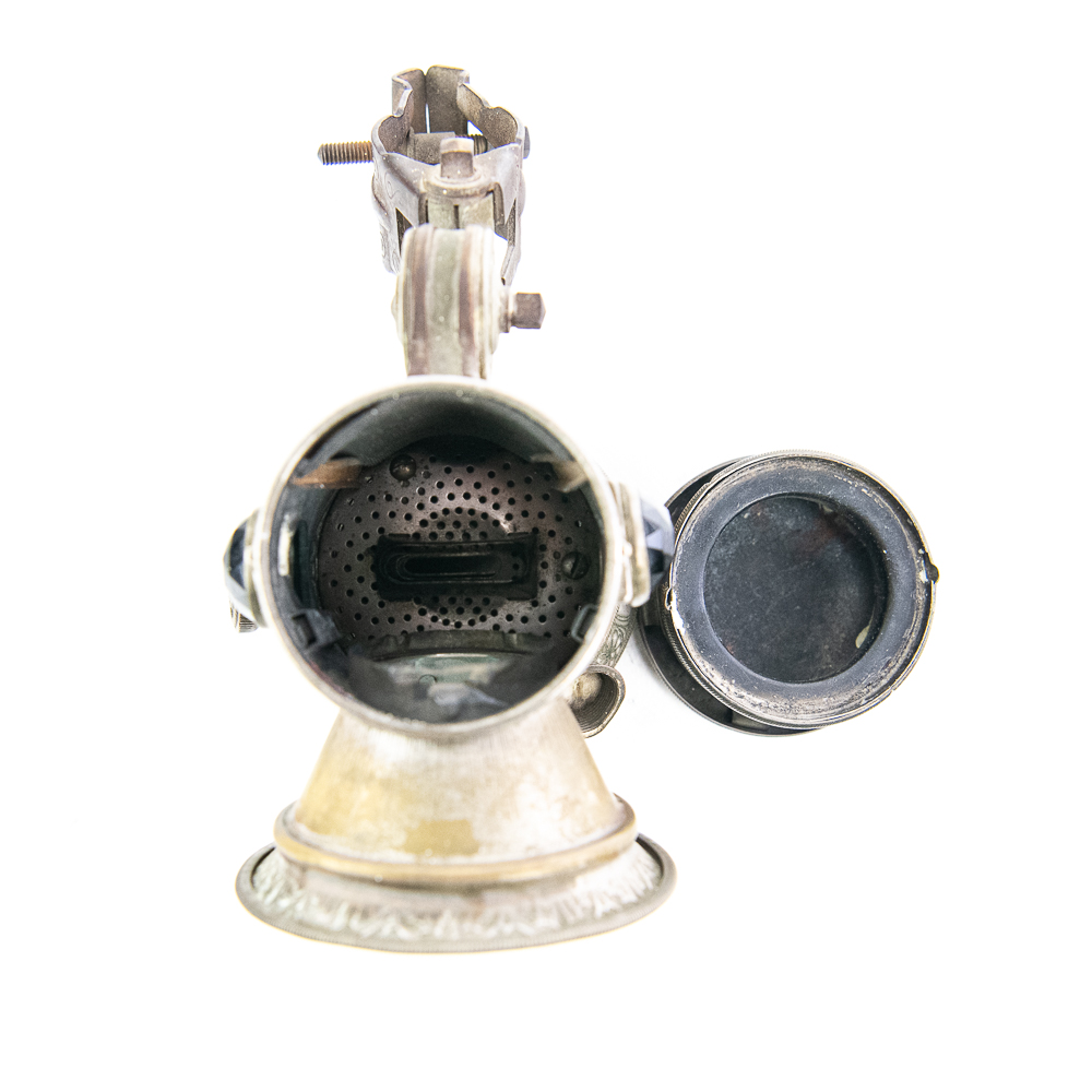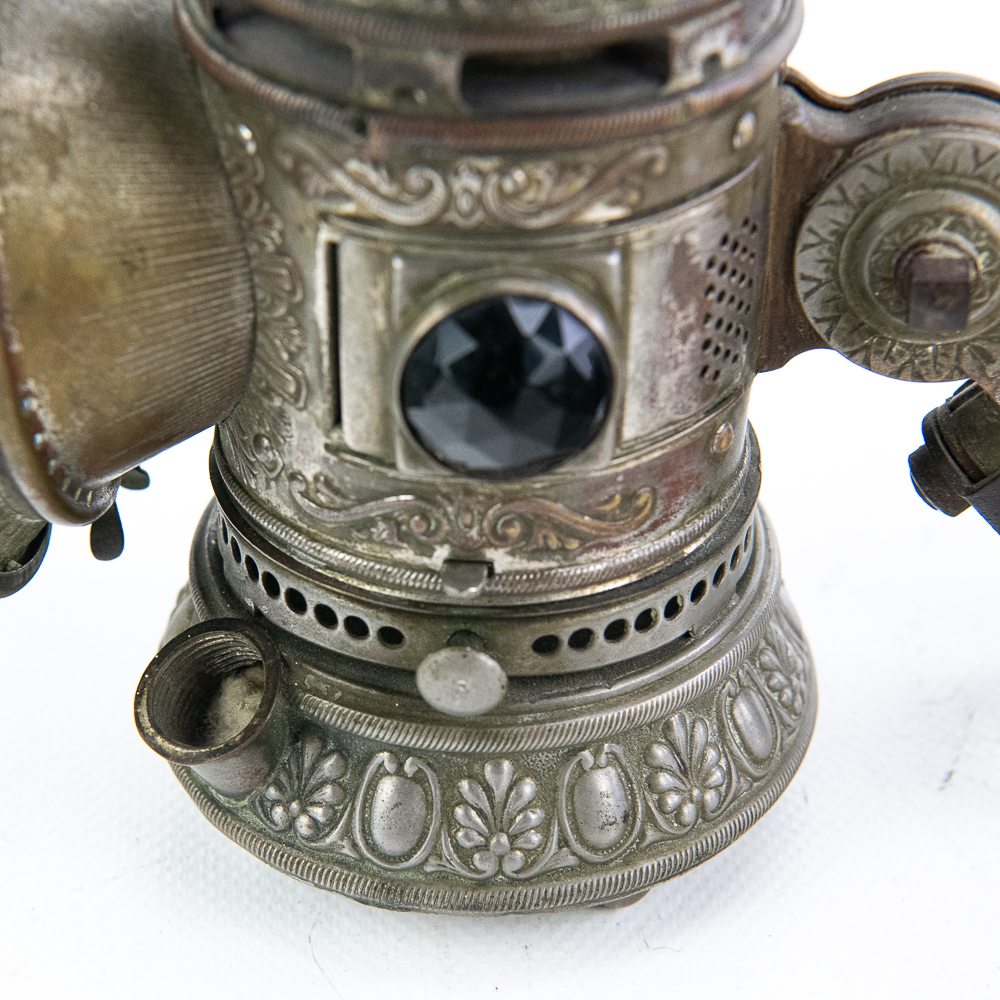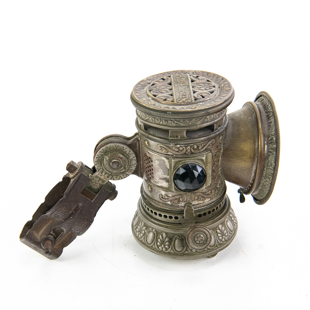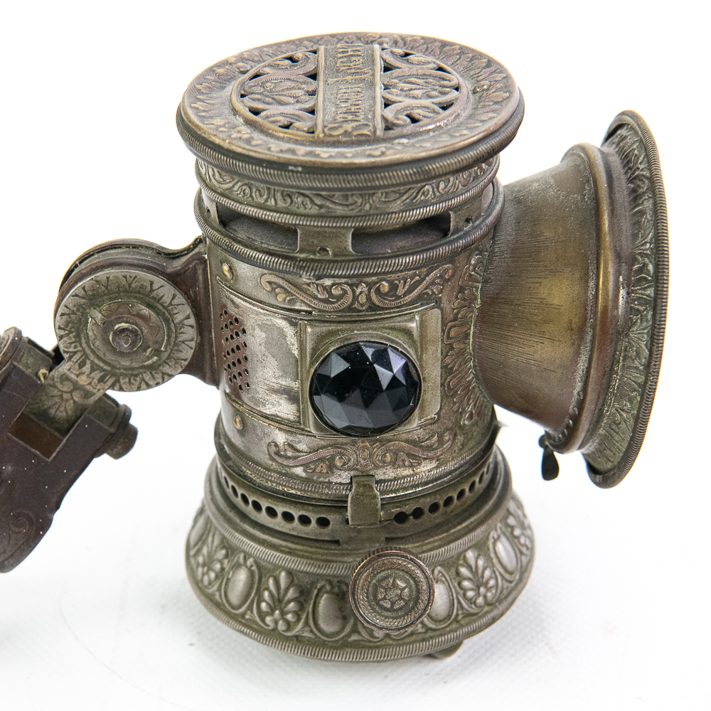 Highly desirable “Search Light” Bicycle Lamp, manufactured by the Bridgeport Brass Company in Bridgeport, Connecticut, USA. This top-of-the-line kerosene oil lamp dates to the peak of the bicycle lamp era, circa 1897-1900, based on Louis Hornberger’s design patent. Constructed from nickel-plated brass, this model features exceptionally ornate, cast metalwork on the top (“SEARCH LIGHT”), the lens bezel, and the oil fount base. It retains its rare and important components, including the adjustable fork/fender clamp with its articulating arm, the front glass lens, and the striking red/green faceted side jewel reflector (two are visible in the photos). The oil burner apparatus is present inside the lamp’s cavity, which is a key completeness factor often missing. The lamp is in overall good, unpolished, antique condition. The original nickel plating shows a charming, aged finish with heavy patina, oxidation, and brass bleed-through, which collectors often prefer over polishing. There is minor surface wear consistent with over a century of age and use. The front lens appears intact, and the side jewels are securely mounted. The wick adjuster knob (on the right side) is present but there is no wick. H 5″, W 3.5″, D 7″ (including mount).