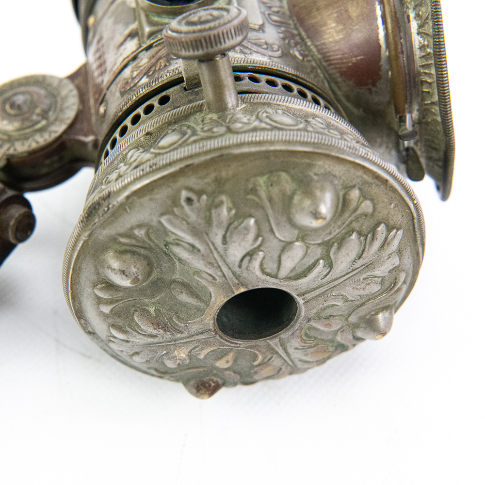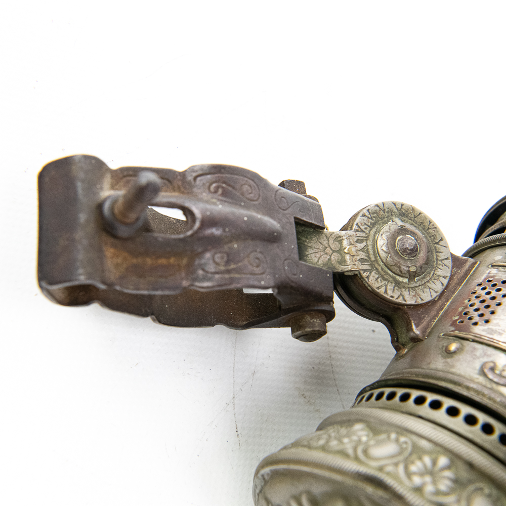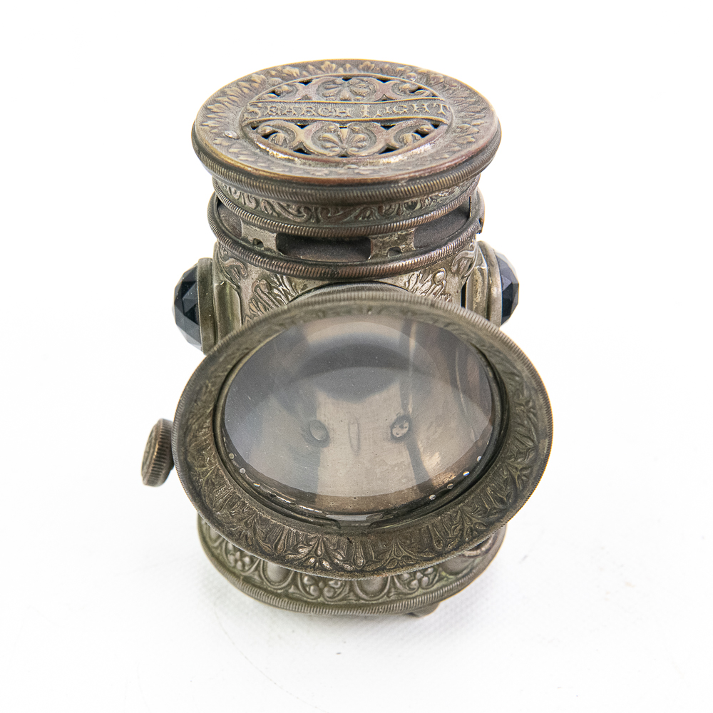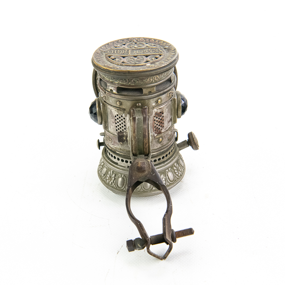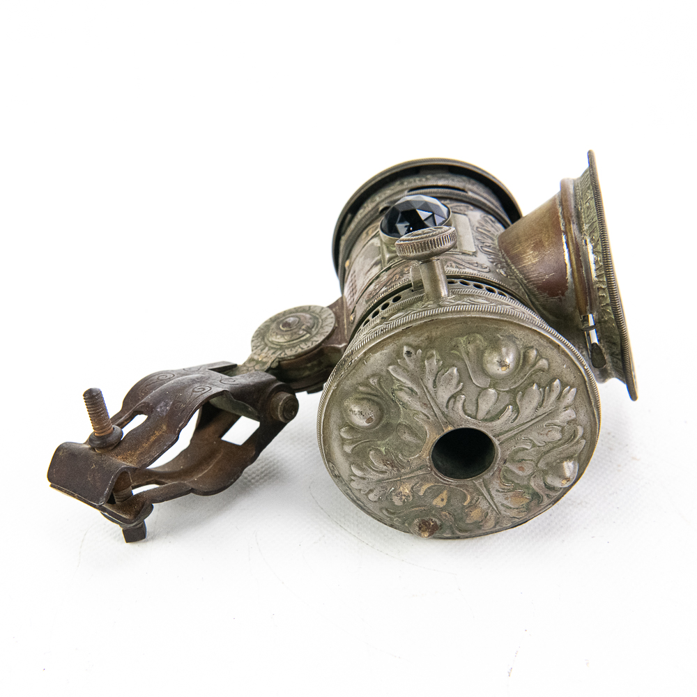 Highly desirable “Search Light” Bicycle Lamp, manufactured by the Bridgeport Brass Company in Bridgeport, Connecticut, USA. This top-of-the-line kerosene oil lamp dates to the peak of the bicycle lamp era, circa 1897-1900, based on Louis Hornberger’s design patent. Constructed from nickel-plated brass, this model features exceptionally ornate, cast metalwork on the top (“SEARCH LIGHT”), the lens bezel, and the oil fount base. It retains its rare and important components, including the adjustable fork/fender clamp with its articulating arm, the front glass lens, and the striking red/green faceted side jewel reflector (two are visible in the photos). The oil burner apparatus is present inside the lamp’s cavity, which is a key completeness factor often missing. The lamp is in overall good, unpolished, antique condition. The original nickel plating shows a charming, aged finish with heavy patina, oxidation, and brass bleed-through, which collectors often prefer over polishing. There is minor surface wear consistent with over a century of age and use. The front lens appears intact, and the side jewels are securely mounted. The wick adjuster knob (on the right side) is present but there is no wick. H 5″, W 3.5″, D 7″ (including mount).