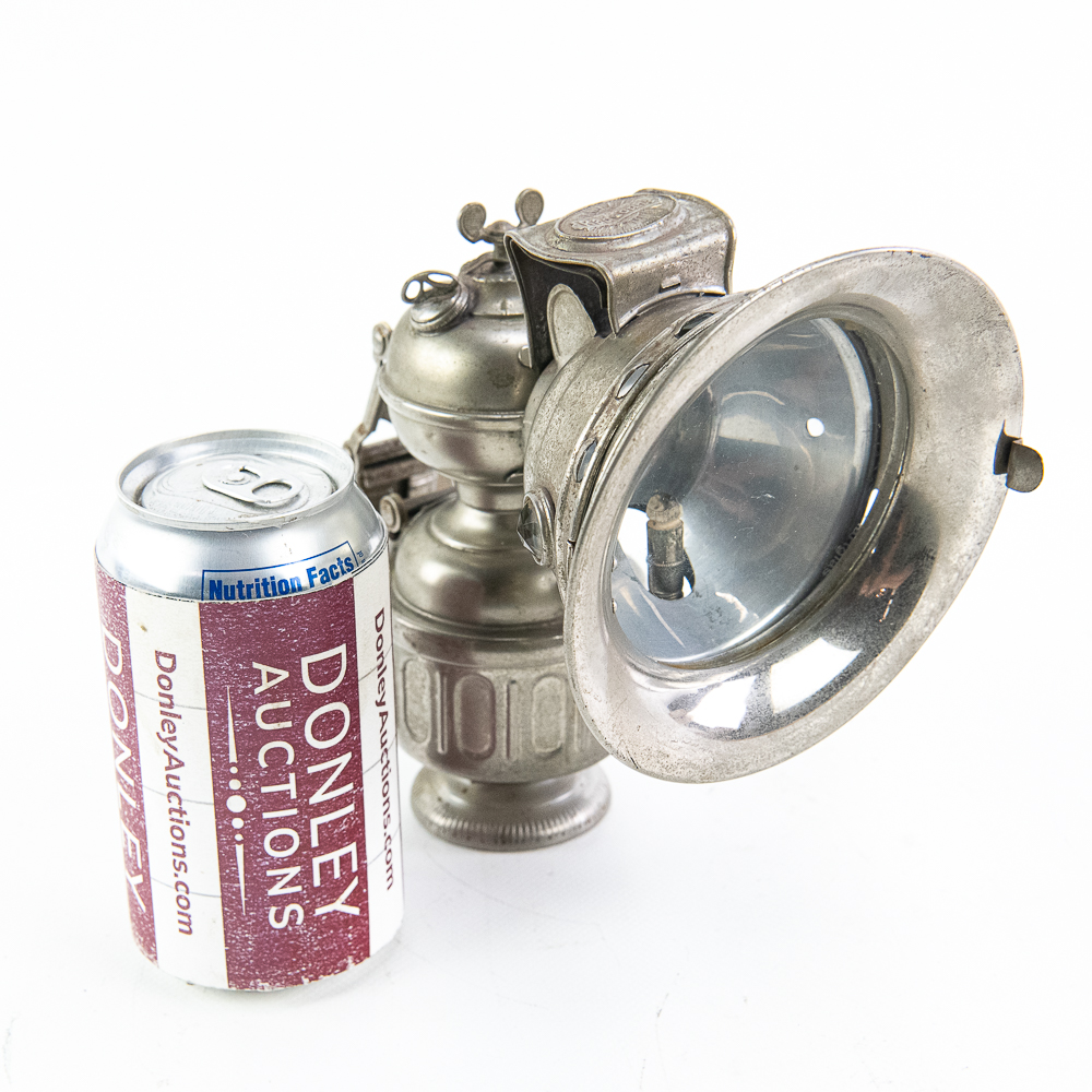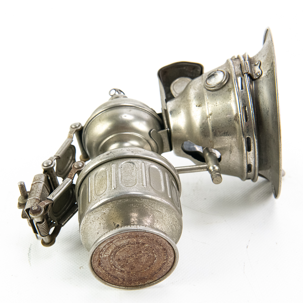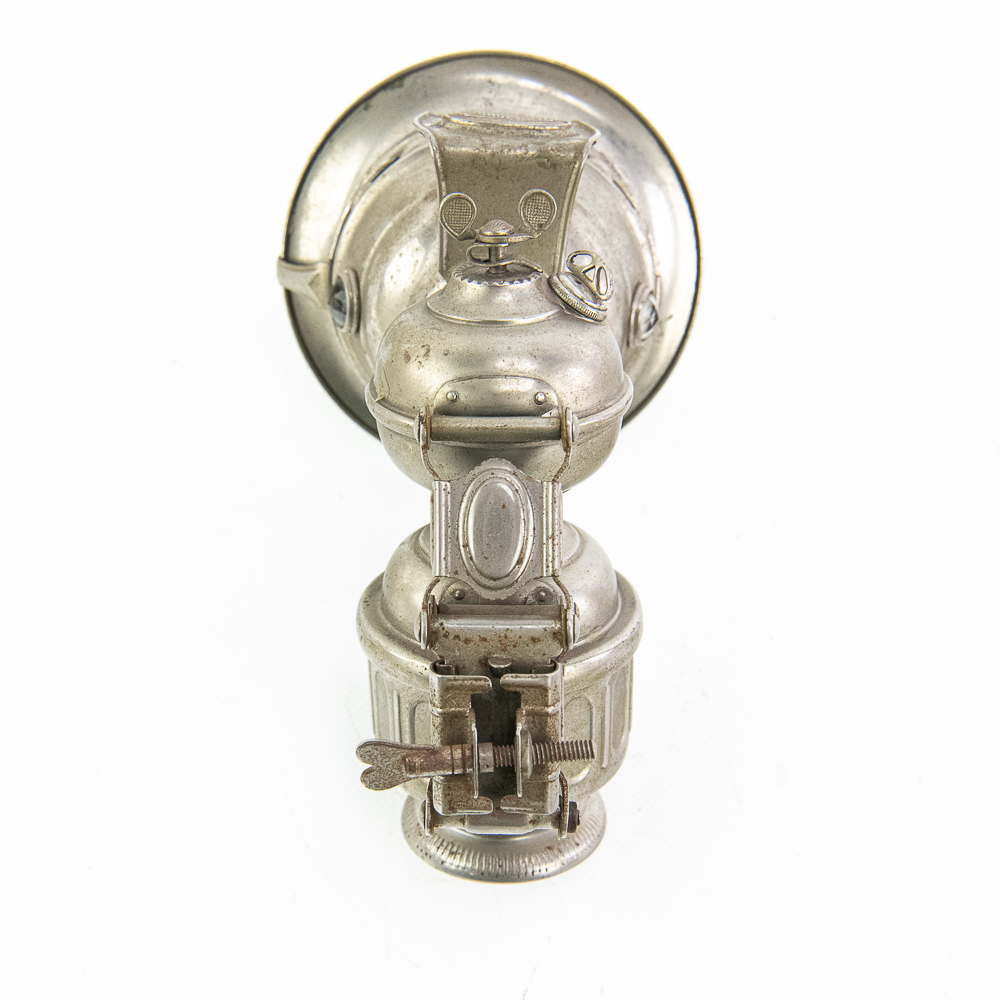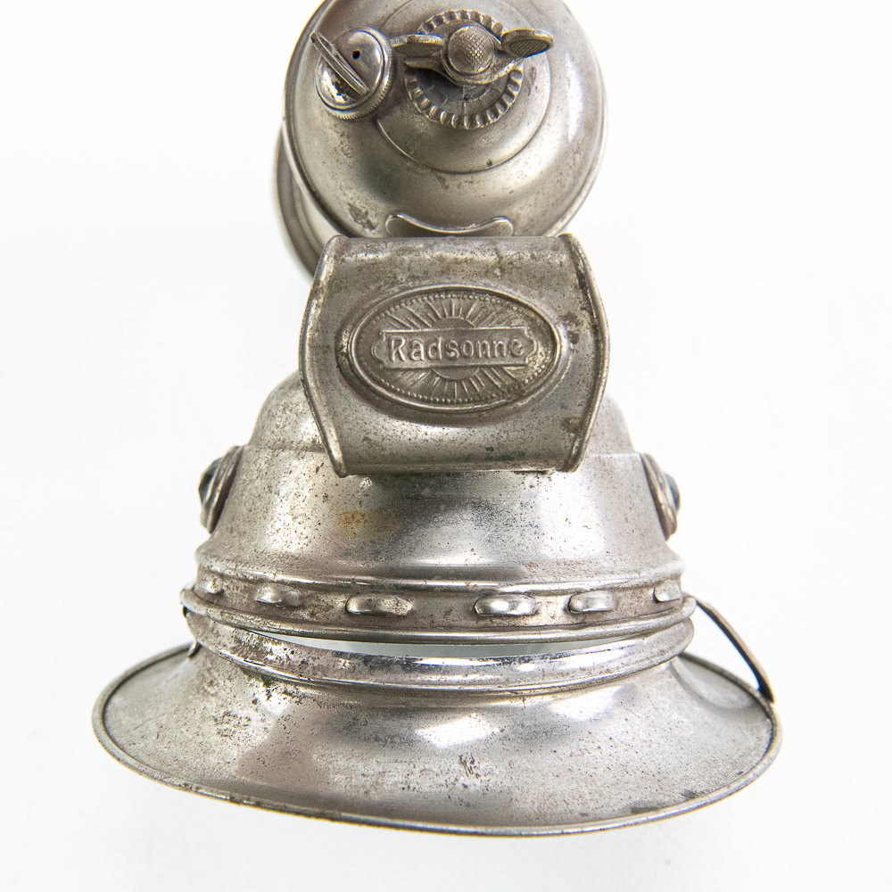 This is a great, authentic example of early transportation lighting! This is a vintage Radsonne carbide bicycle lamp from the early 20th century. These lamps were a significant advancement in bicycle lighting technology, using a chemical reaction between calcium carbide and water to produce acetylene gas, which was then ignited to create a bright, reliable flame. This lamp is constructed of a nickel-plated brass or steel body. The front reflector is hinged and opens, and there is a legible “Radsonne” mark on the top of the lamp. The piece has a great patina with overall tarnish, minor surface scratches, and some areas of pitting and rust, consistent with its age and use. Its working condition is unknown and it is being offered as-is. The lamp measures approximately 5 inches wide by 8 inches deep including bracket and 7.5 inches tall.