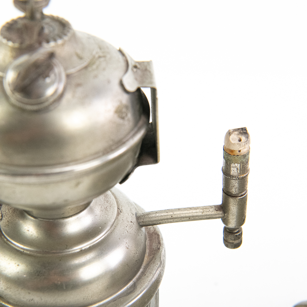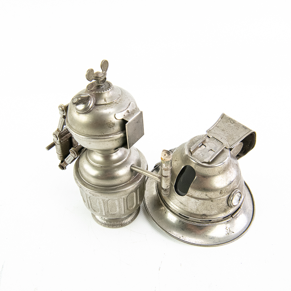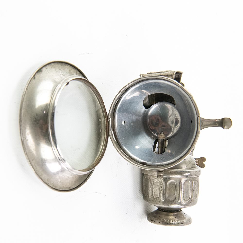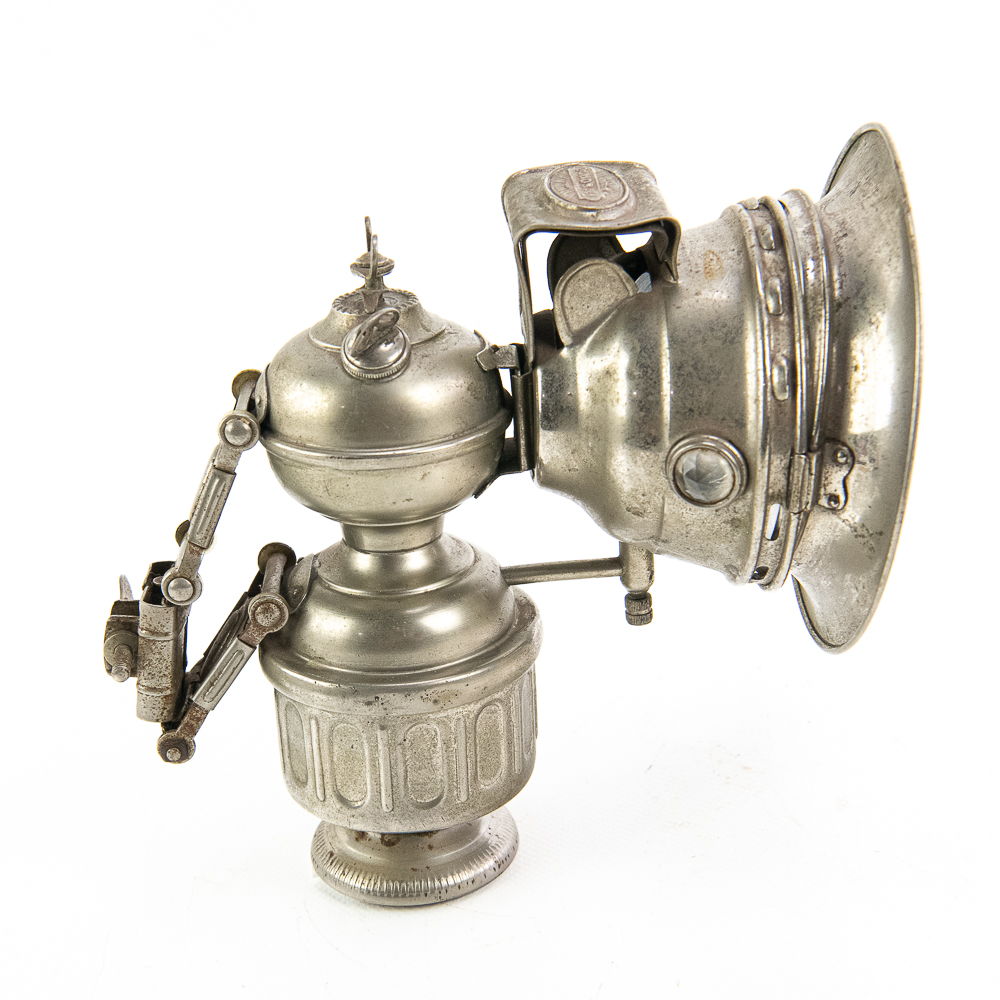 This is a great, authentic example of early transportation lighting! This is a vintage Radsonne carbide bicycle lamp from the early 20th century. These lamps were a significant advancement in bicycle lighting technology, using a chemical reaction between calcium carbide and water to produce acetylene gas, which was then ignited to create a bright, reliable flame. This lamp is constructed of a nickel-plated brass or steel body. The front reflector is hinged and opens, and there is a legible “Radsonne” mark on the top of the lamp. The piece has a great patina with overall tarnish, minor surface scratches, and some areas of pitting and rust, consistent with its age and use. Its working condition is unknown and it is being offered as-is. The lamp measures approximately 5 inches wide by 8 inches deep including bracket and 7.5 inches tall.