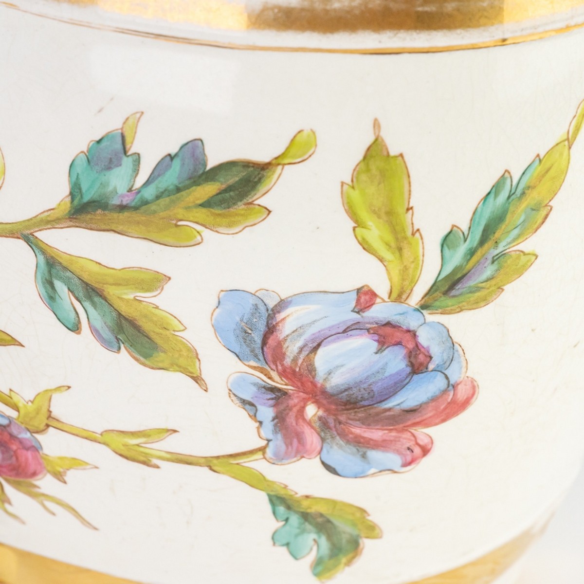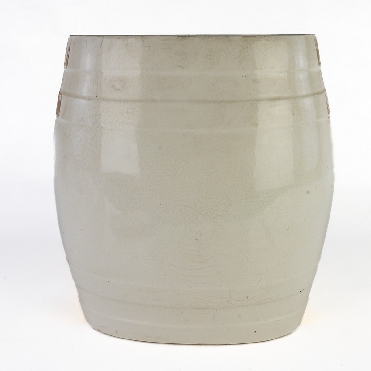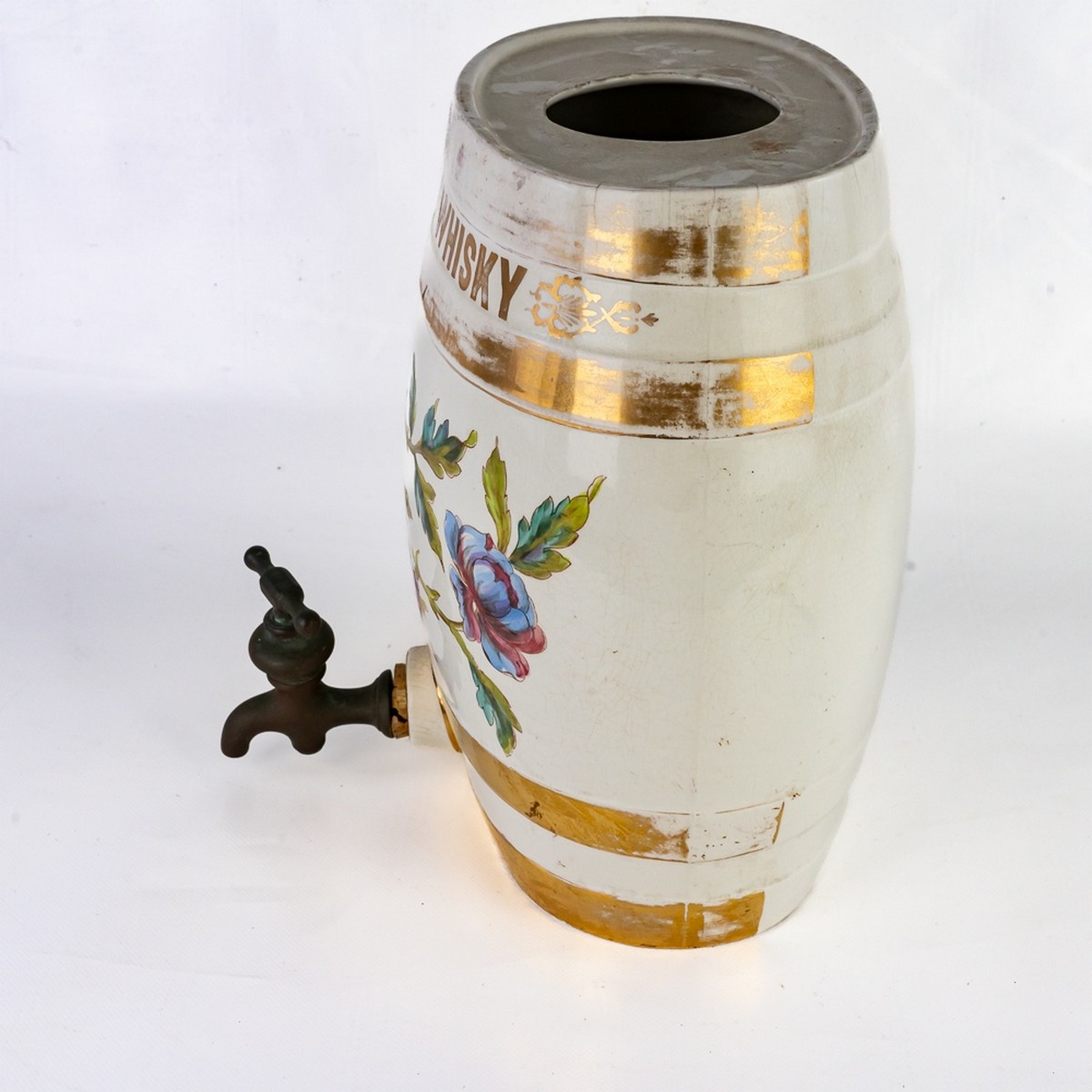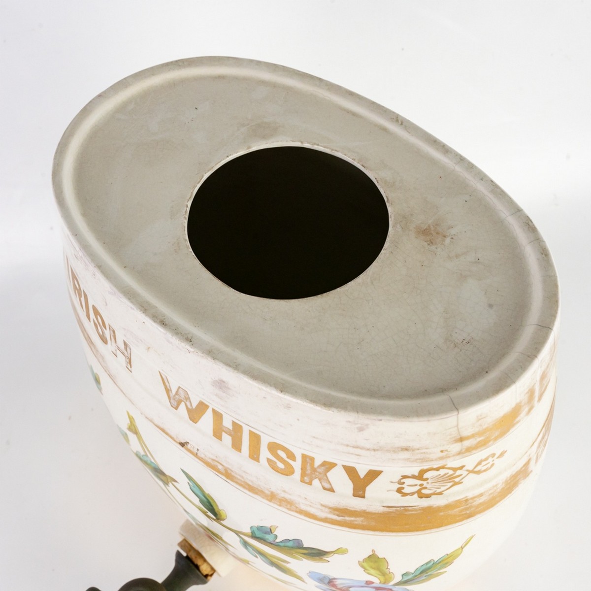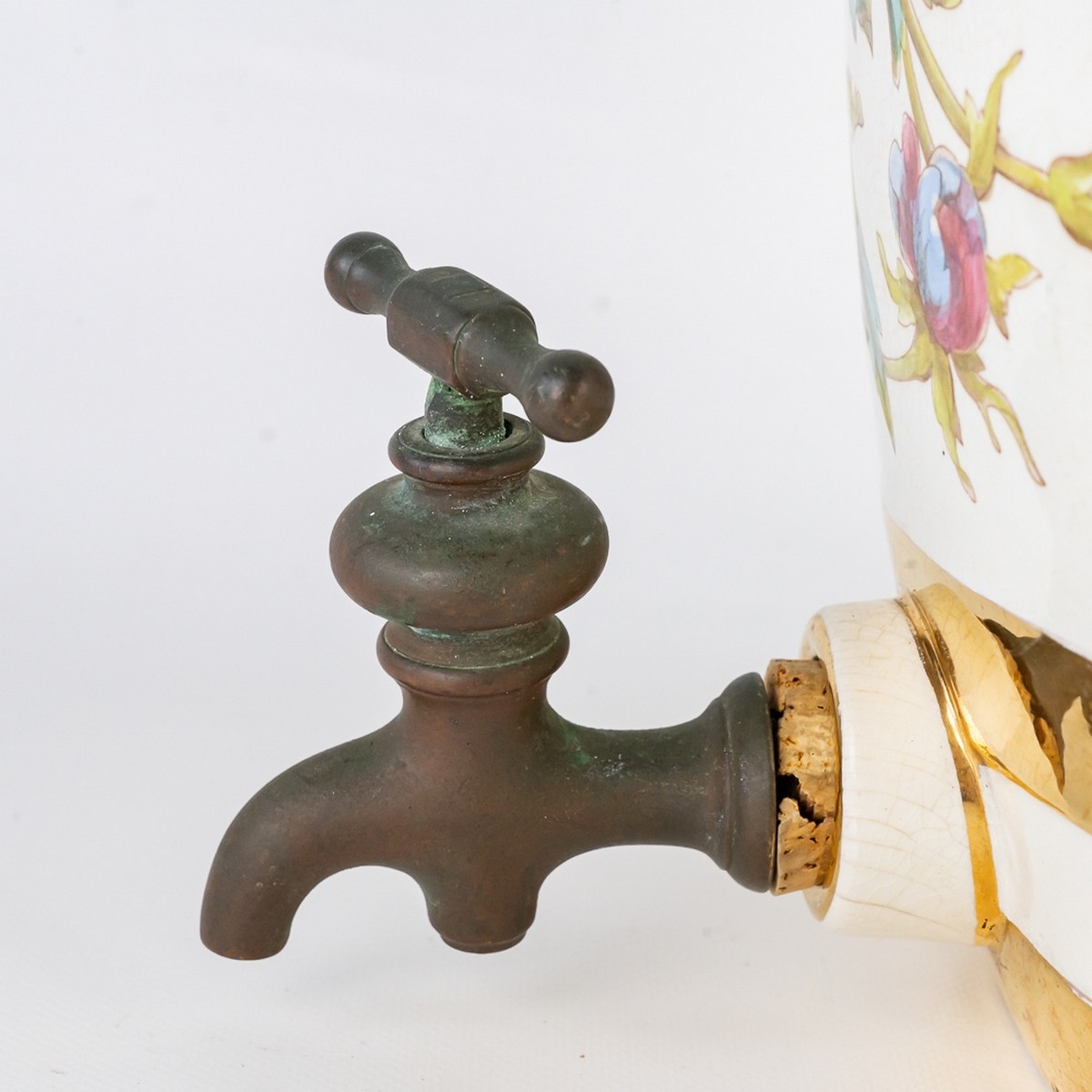 Ceramic dispenser with original metal spigot. Showing some wear but no cracks minor chips. Missing lid. Some are crazing. Overall fair to good condition. 11-1/2″ W x 12-1/4″ T X 13″ D
