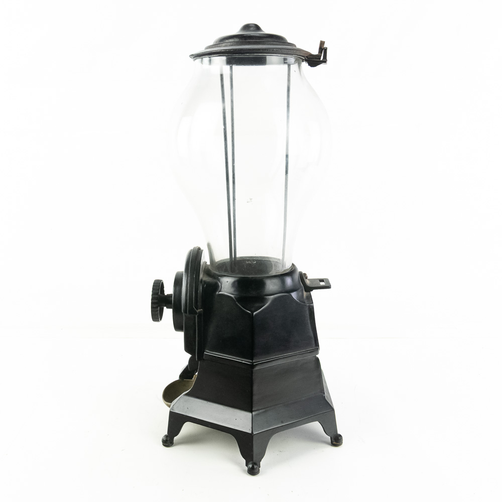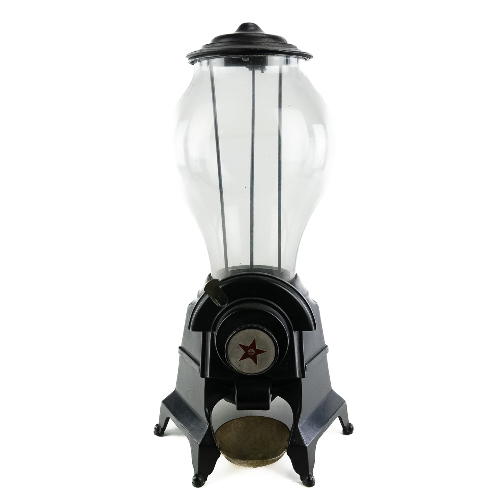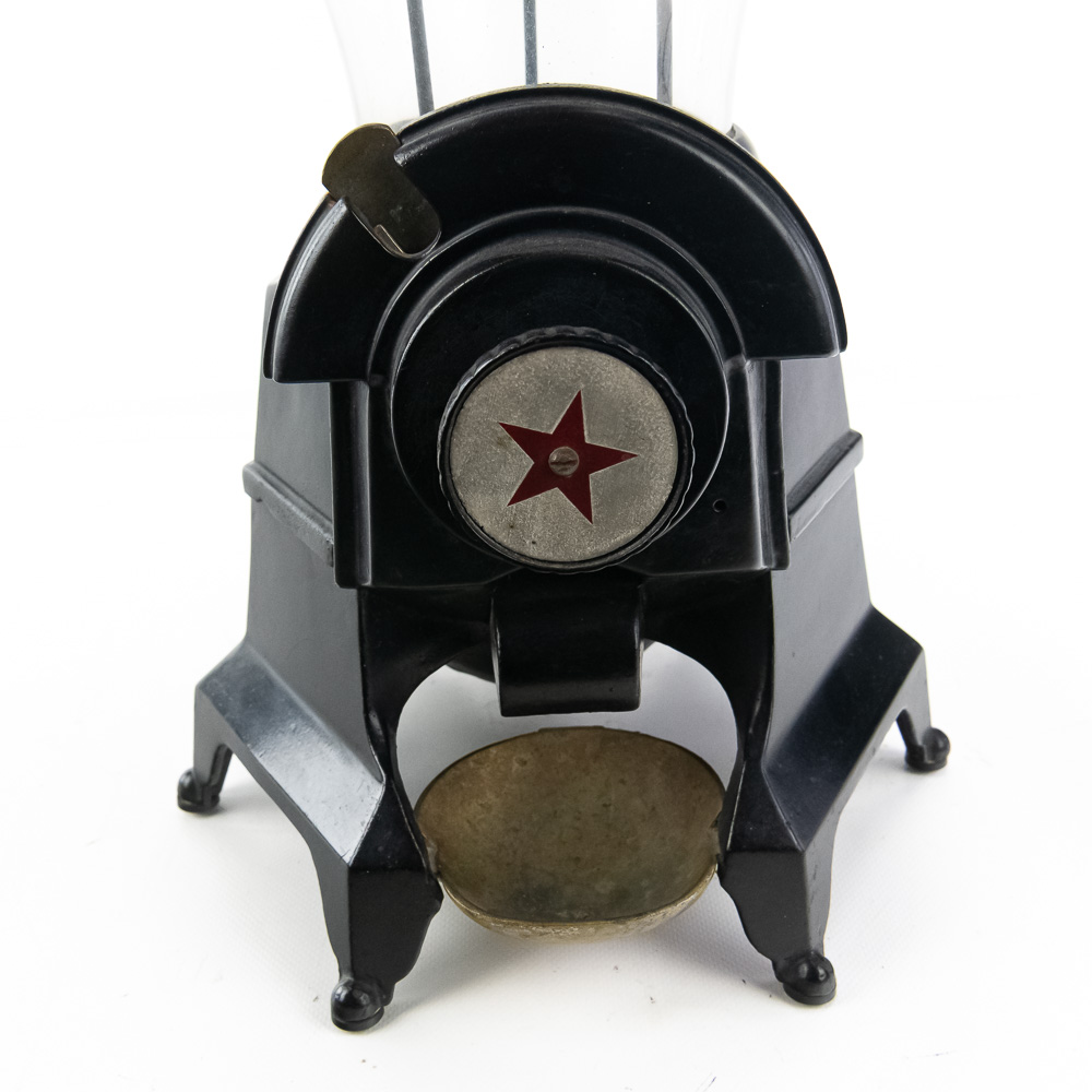 Early coin op peanut machine made by the Griswold Mfg. Co. for the Red Star Sanitary Vending Machine Co. of Davenport Iowa, circa 1914. Hexagon cast-iron base on feet with original flared globe, aluminum tray, and 1 cent dial operated coin slot. Accepts coins and vends. Missing back door. This example is in VG condition with original paint with all original parts. Pictured in “Silent Salesman” by Bill Enes, page 39. Measures 20″ tall.