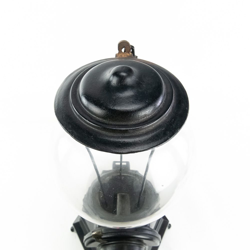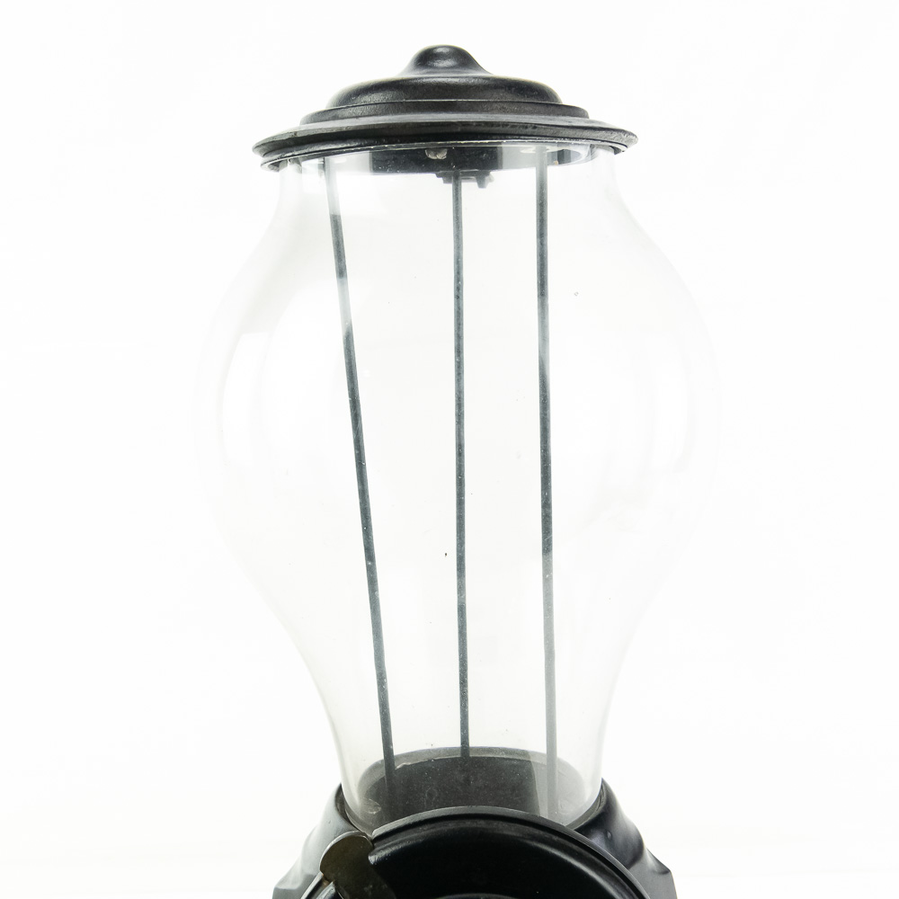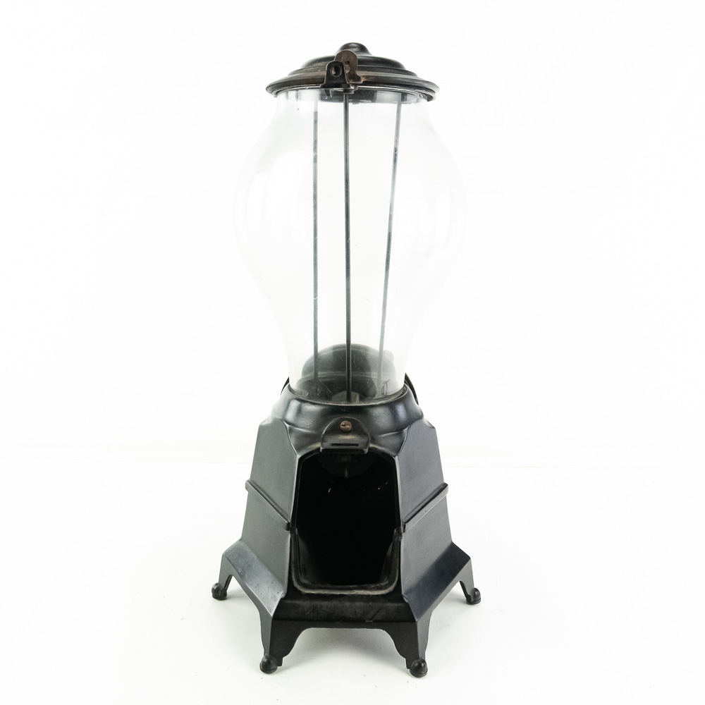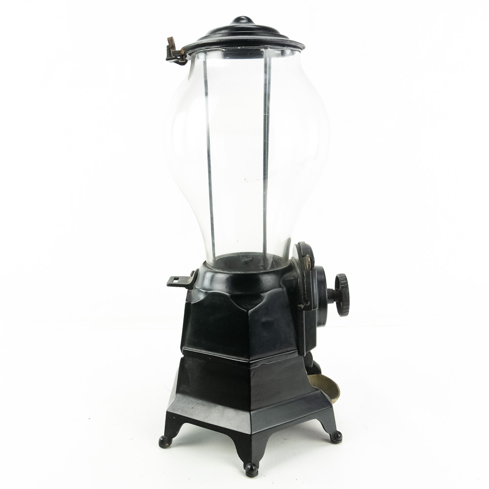 Early coin op peanut machine made by the Griswold Mfg. Co. for the Red Star Sanitary Vending Machine Co. of Davenport Iowa, circa 1914. Hexagon cast-iron base on feet with original flared globe, aluminum tray, and 1 cent dial operated coin slot. Accepts coins and vends. Missing back door. This example is in VG condition with original paint with all original parts. Pictured in “Silent Salesman” by Bill Enes, page 39. Measures 20″ tall.