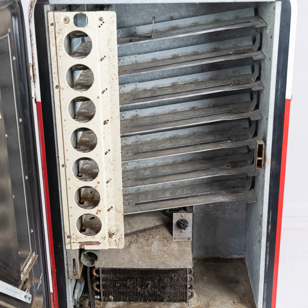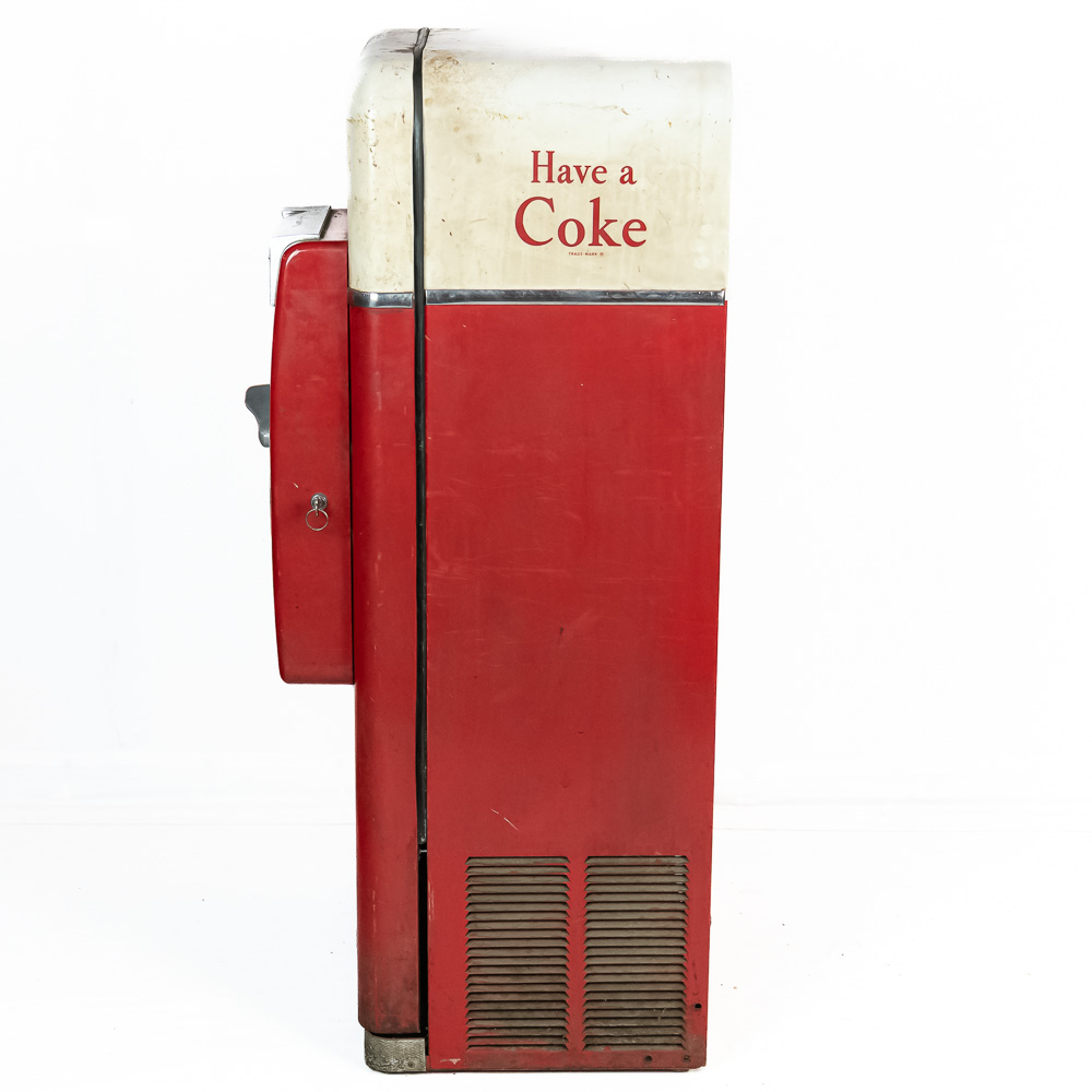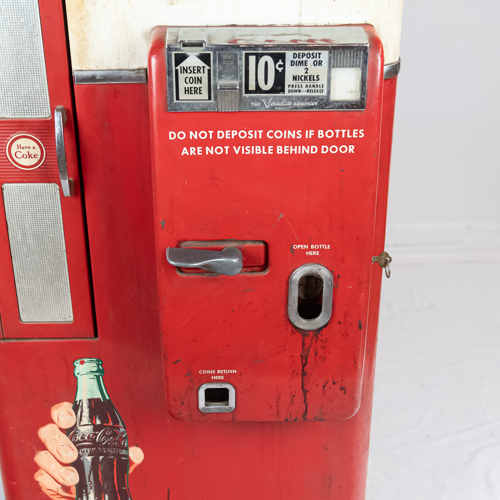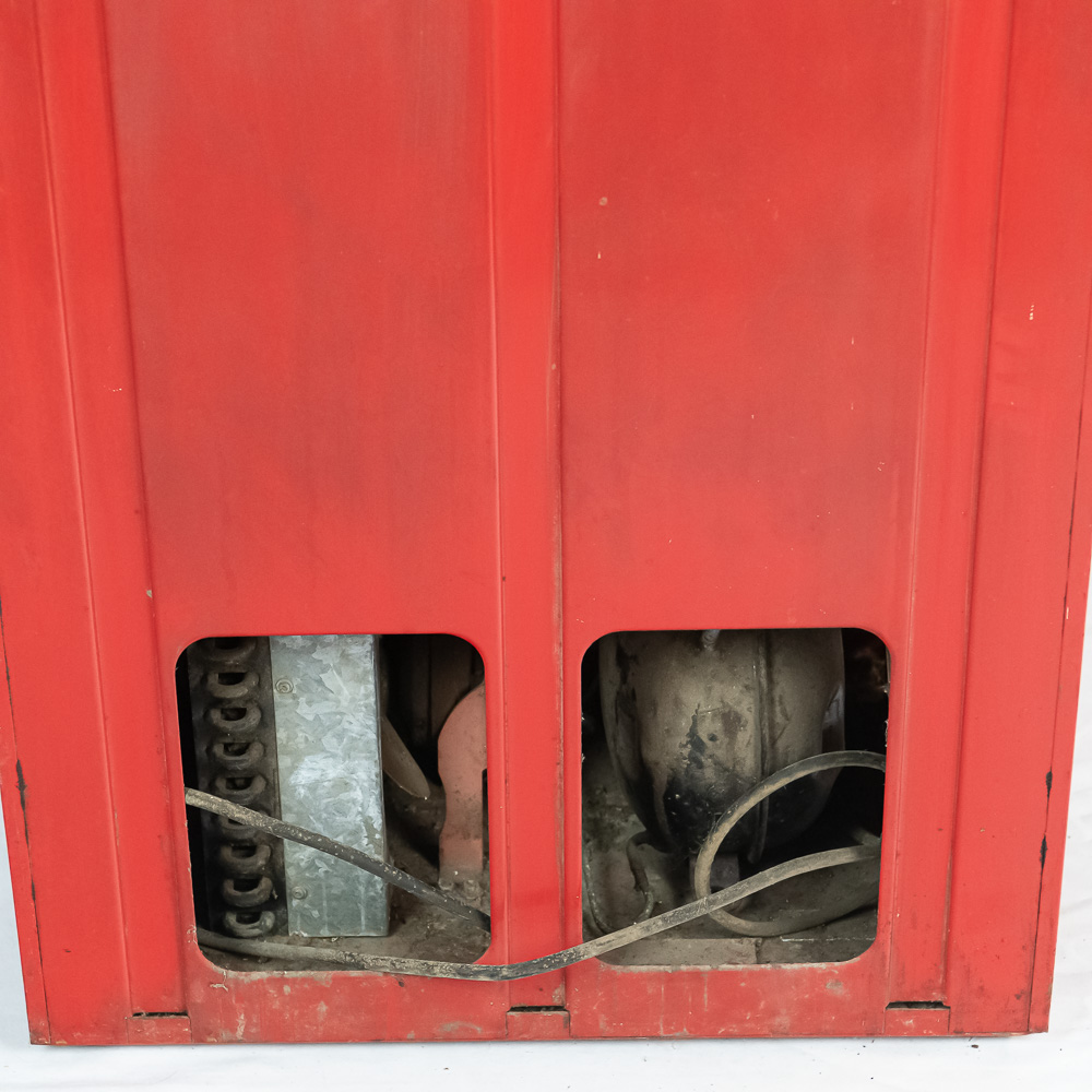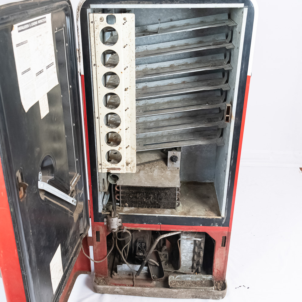 Coin mech, compressor (untested), and interior bottle mech intact. Comes with key for lock. Measures 52″ tall, 26″ wide, 23″ deep.