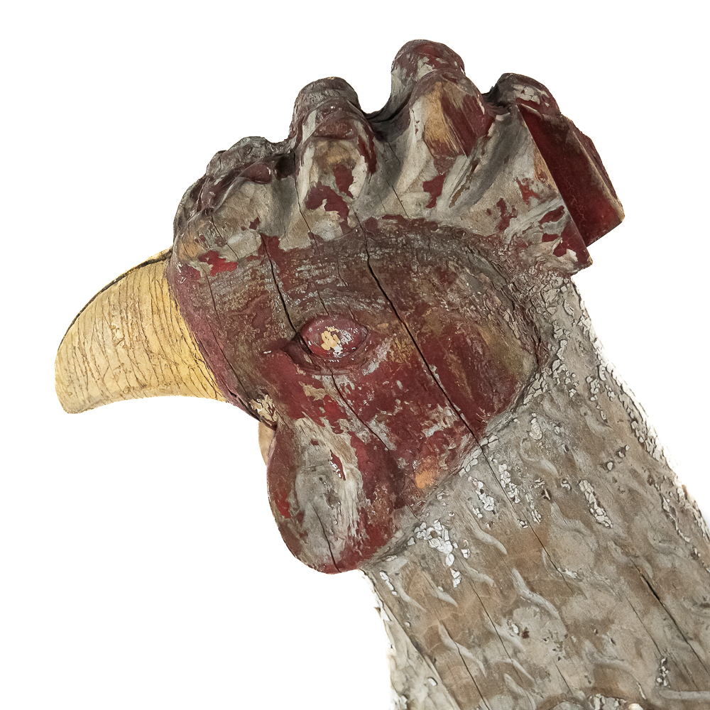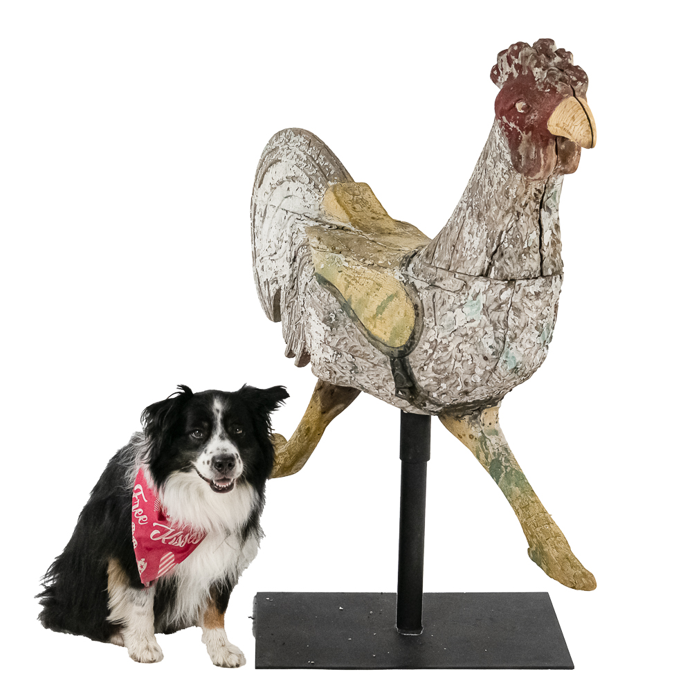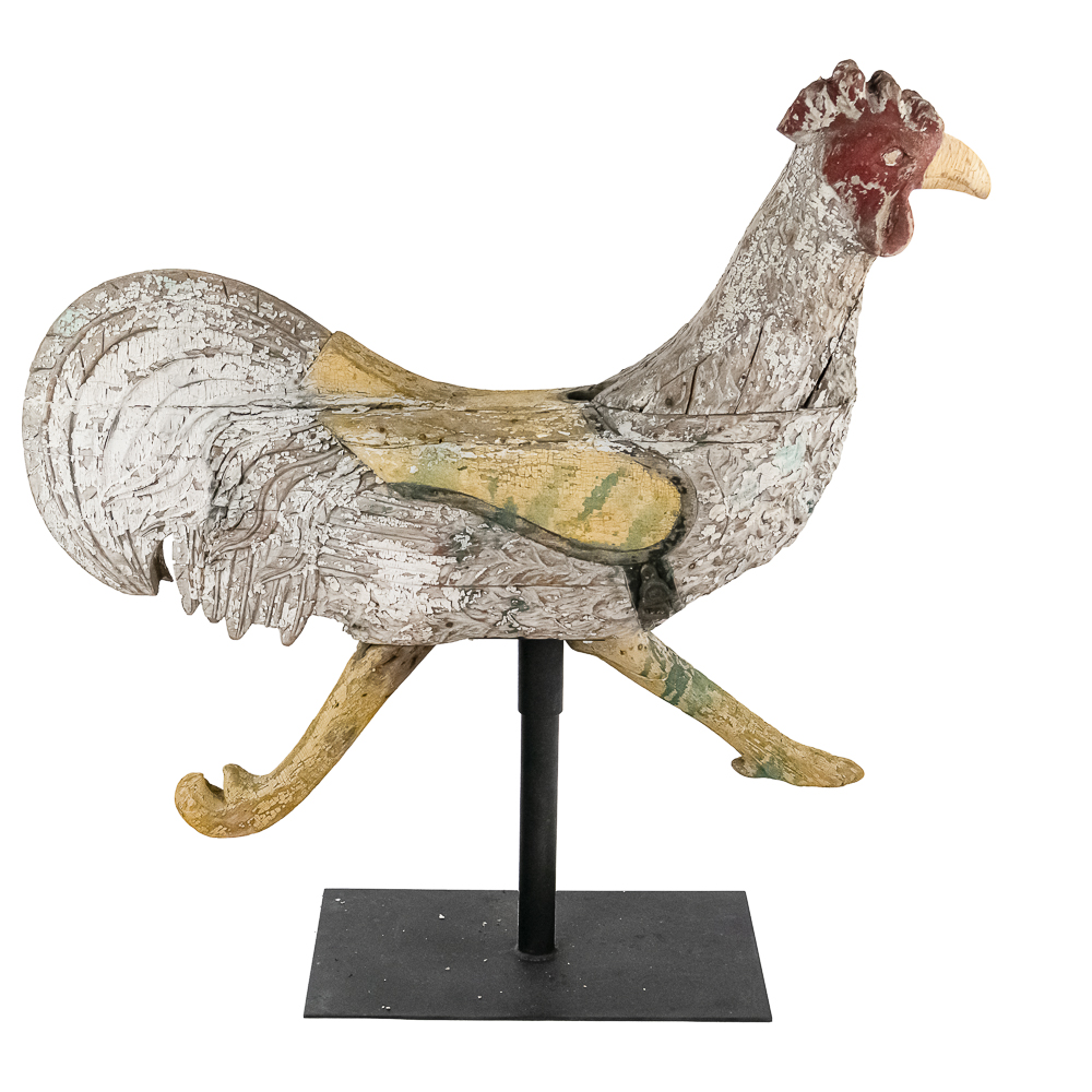 Early American Carousel Herschell-Spillman carved wood rooster, circa 1890-1910, Tonawanda, NY, In fair condition with original peeling paint and some joint separation. 1.75″ pole hole. On custom display stand. Measures 40″ tall, 48″ long.