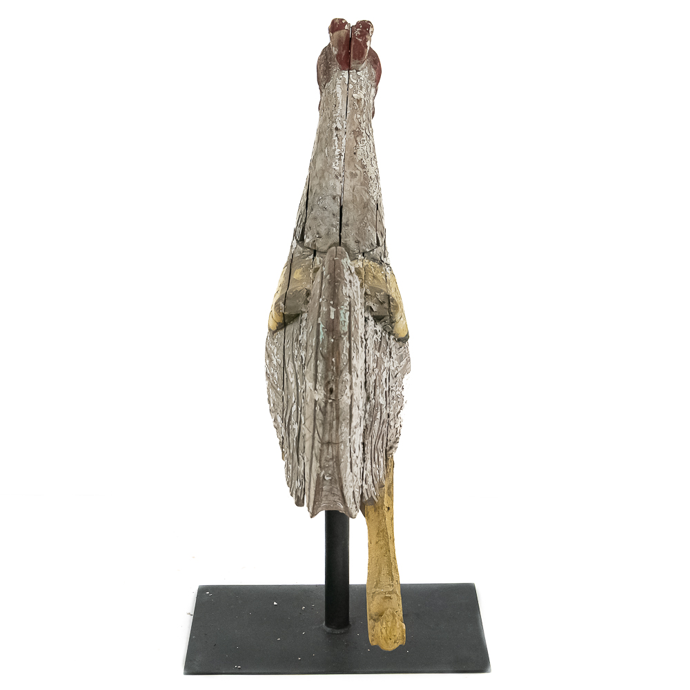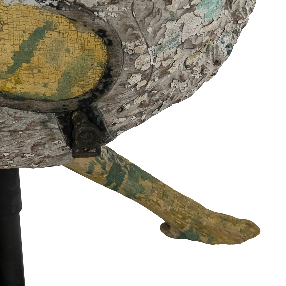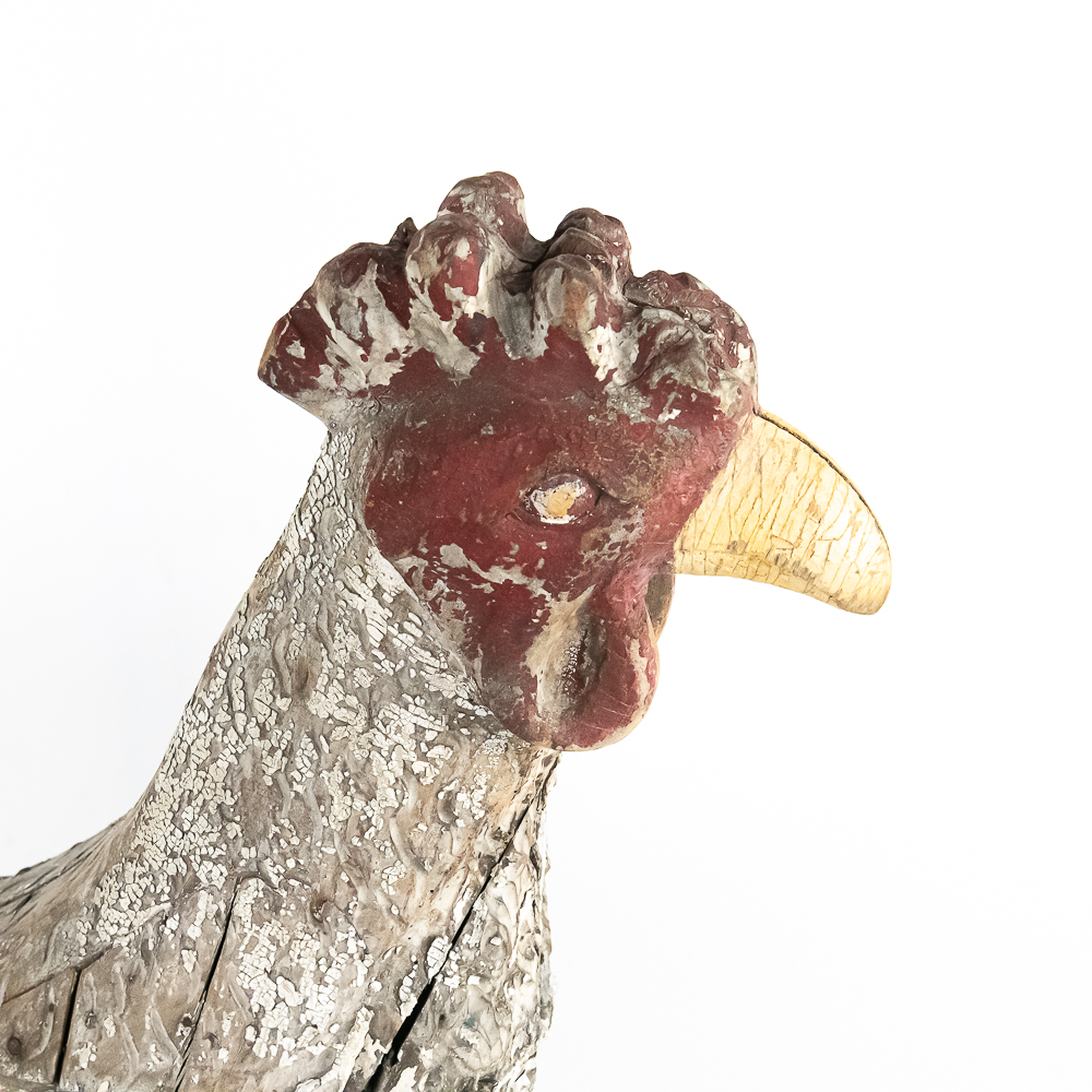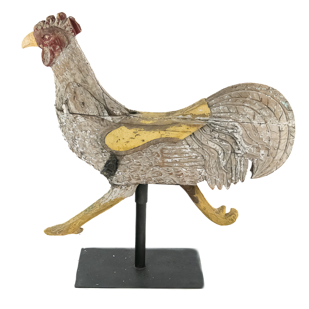 Early American Carousel Herschell-Spillman carved wood rooster, circa 1890-1910, Tonawanda, NY, In fair condition with original peeling paint and some joint separation. 1.75″ pole hole. On custom display stand. Measures 40″ tall, 48″ long.