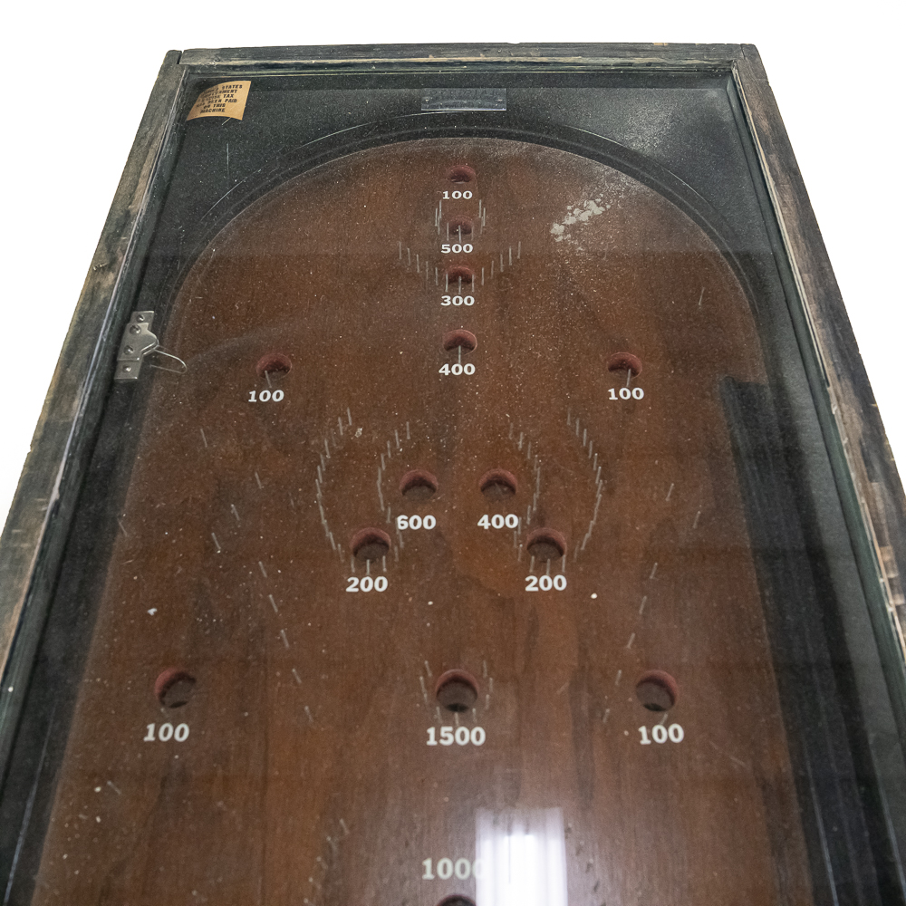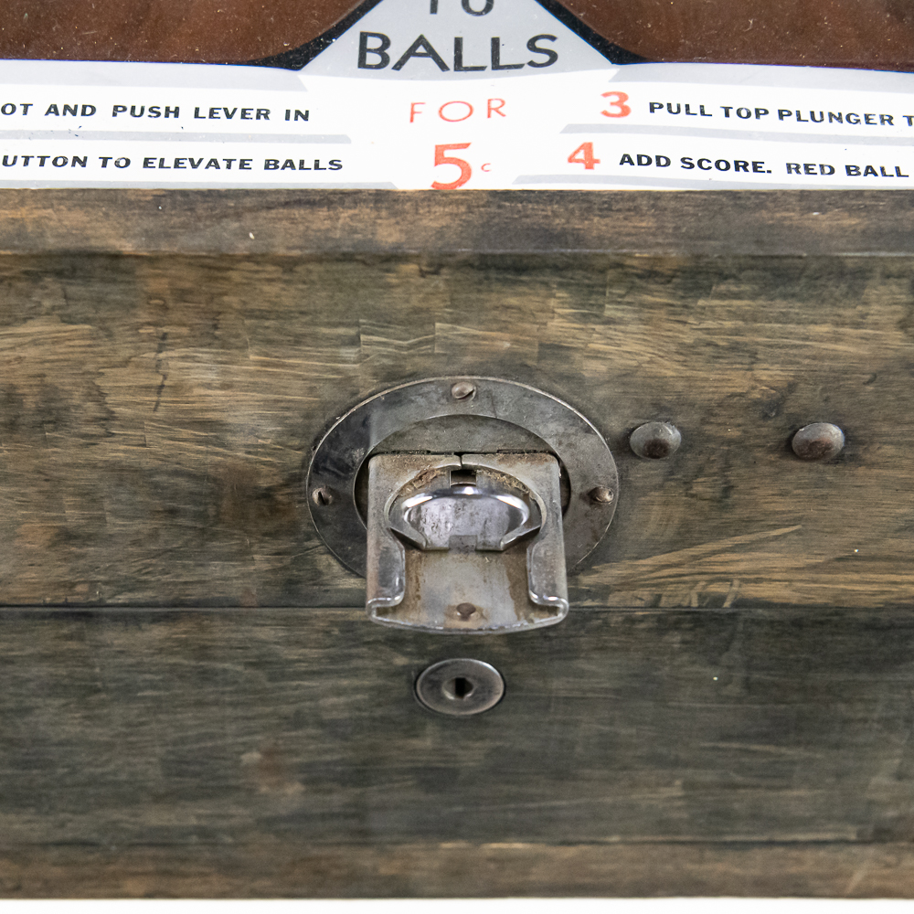 Machine. This 1930s mechanical game features a simple, addictive playfield where players shoot 10 balls for 5 cents. The game is housed in a robust, utilitarian wooden case with a great, heavily weathered and worn original finish. The playfield is dirty, with faded graphics and some bent pins under the original glass. The instruction card is a later paper replacement. It is in working condition with two cats eyes marbles included. It is being offered in as-is condition. Dimensions: 18″ wide x 36″ long and 9″ tall in front and 11.5″ tall at back. No key present for front access door.
