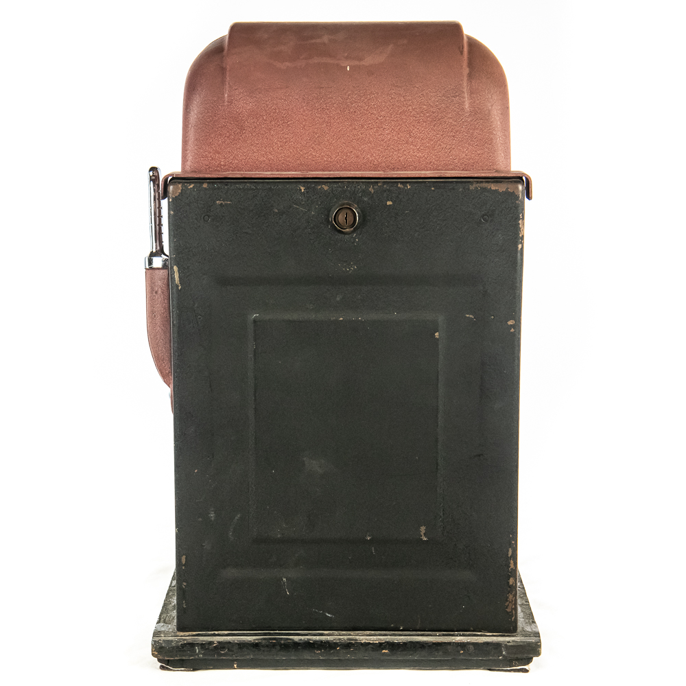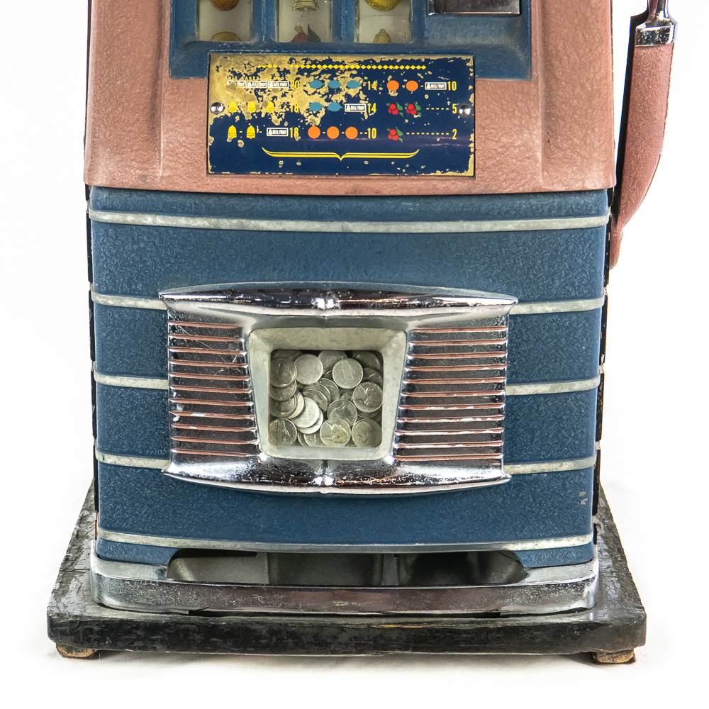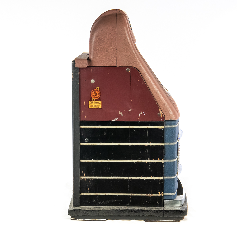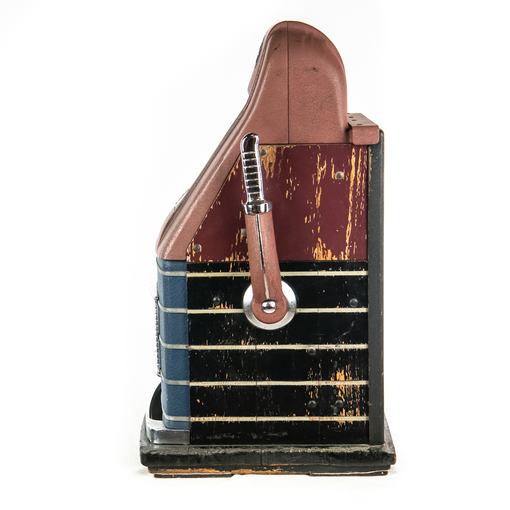 Original 3 reel, front jackpot, original back door, lock but no key. Machine shows some light wear with some light paint chips and scuffs. Overall a nice looking machine that works as it should. 15″ D X 16″ W X 27″ H