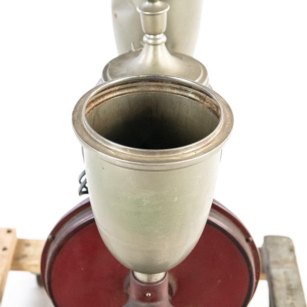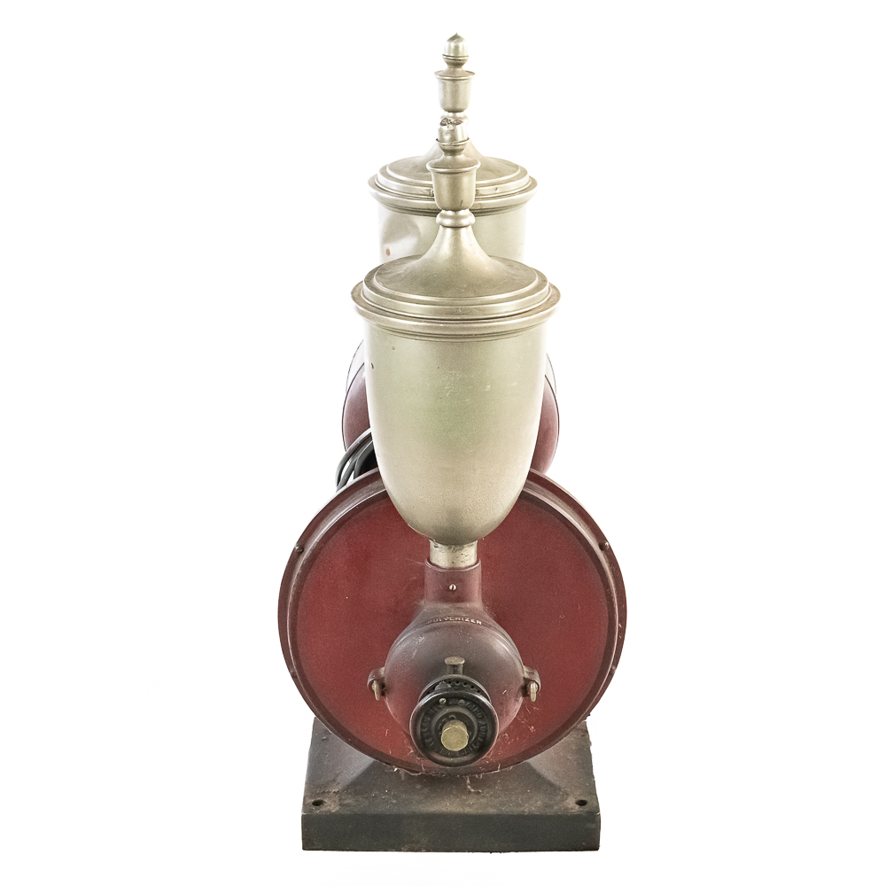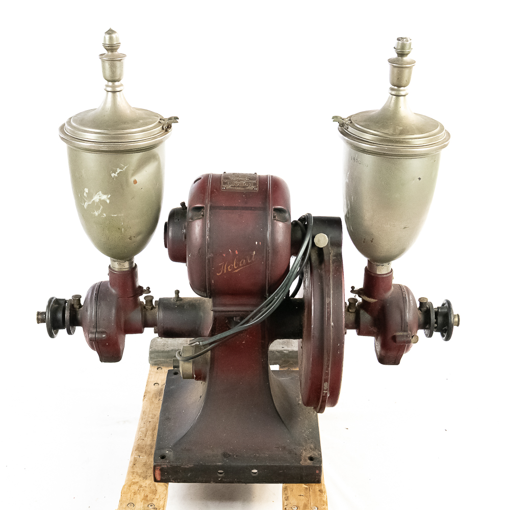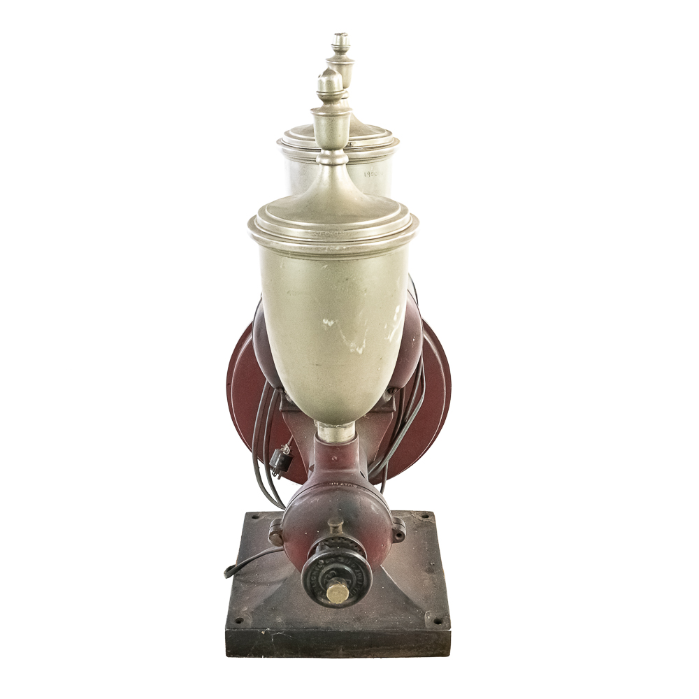 Looks to be complete with all the small oilers, fittings, etc. Has the two original hoppers with spun aluminum tops. 1/2half of a hinge is missing on one of the aluminum tops. . Nice old time switch and large brass ID tag. Missing the coffee catches. Item has good paint with a nice aged patina. Motor runs, on/off switch works.
