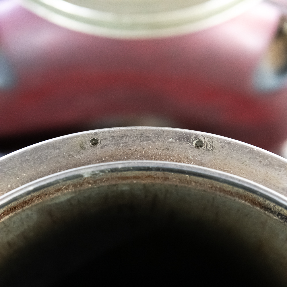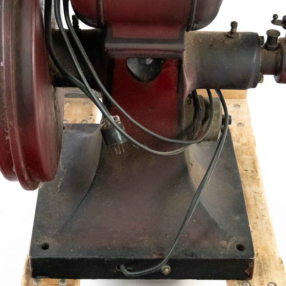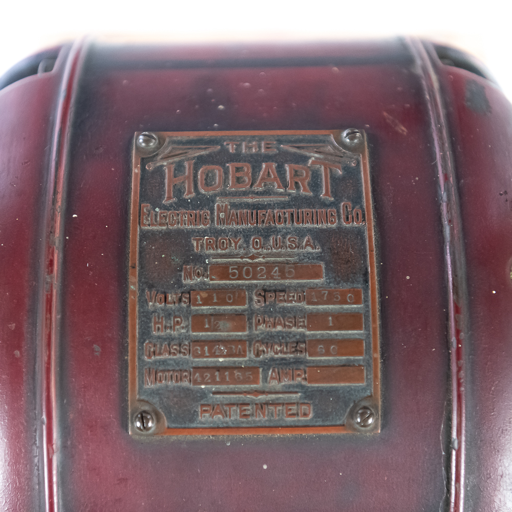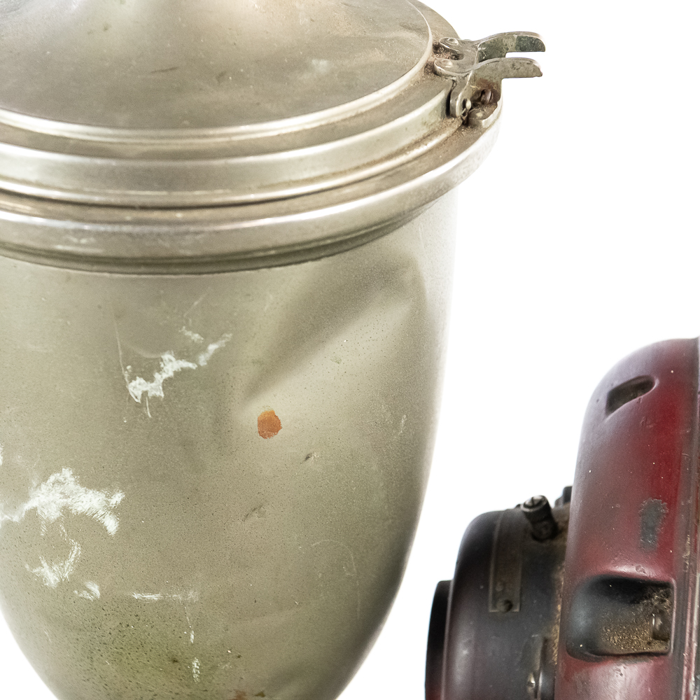 Looks to be complete with all the small oilers, fittings, etc. Has the two original hoppers with spun aluminum tops. 1/2half of a hinge is missing on one of the aluminum tops. . Nice old time switch and large brass ID tag. Missing the coffee catches. Item has good paint with a nice aged patina. Motor runs, on/off switch works.