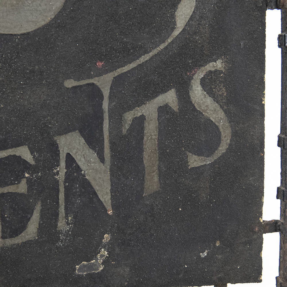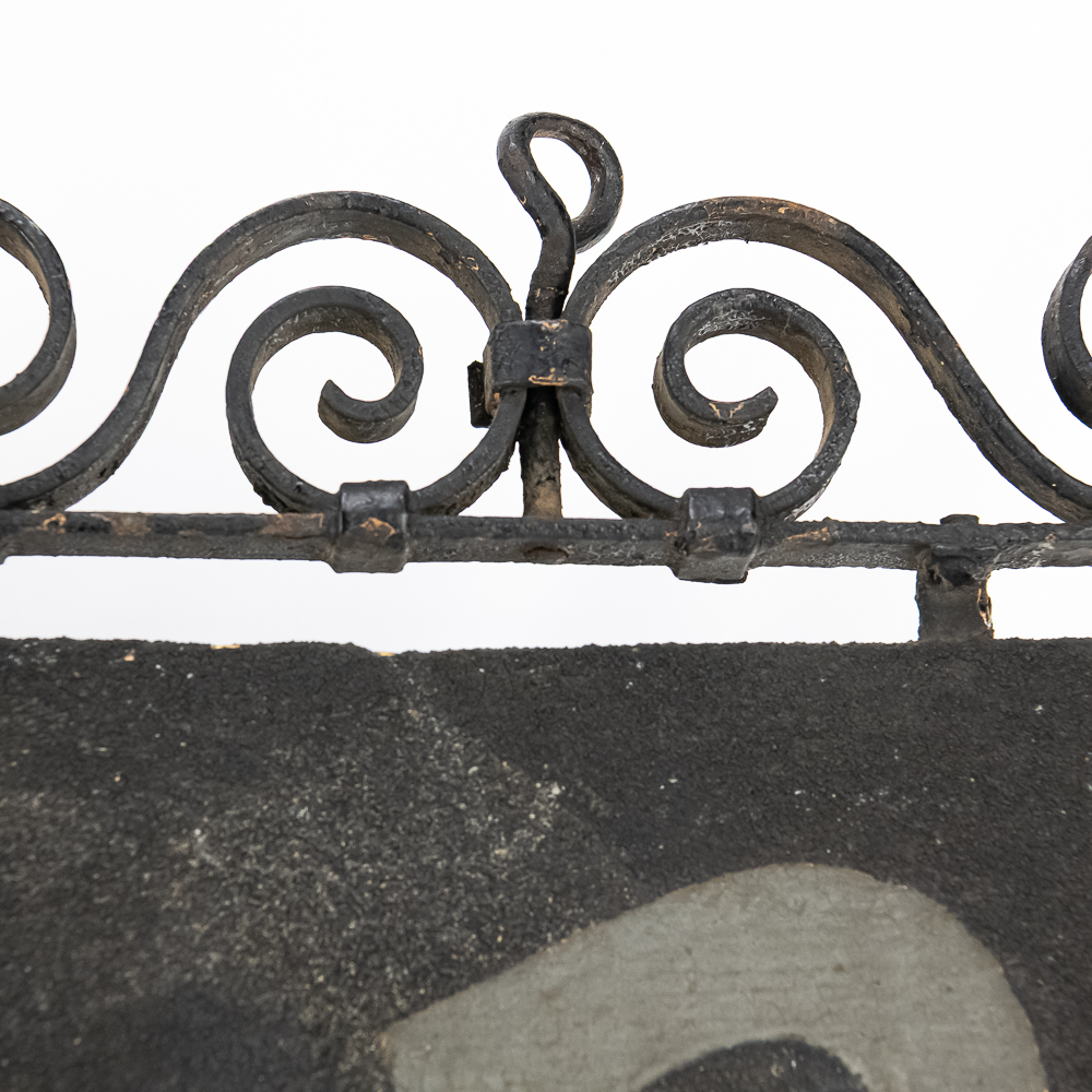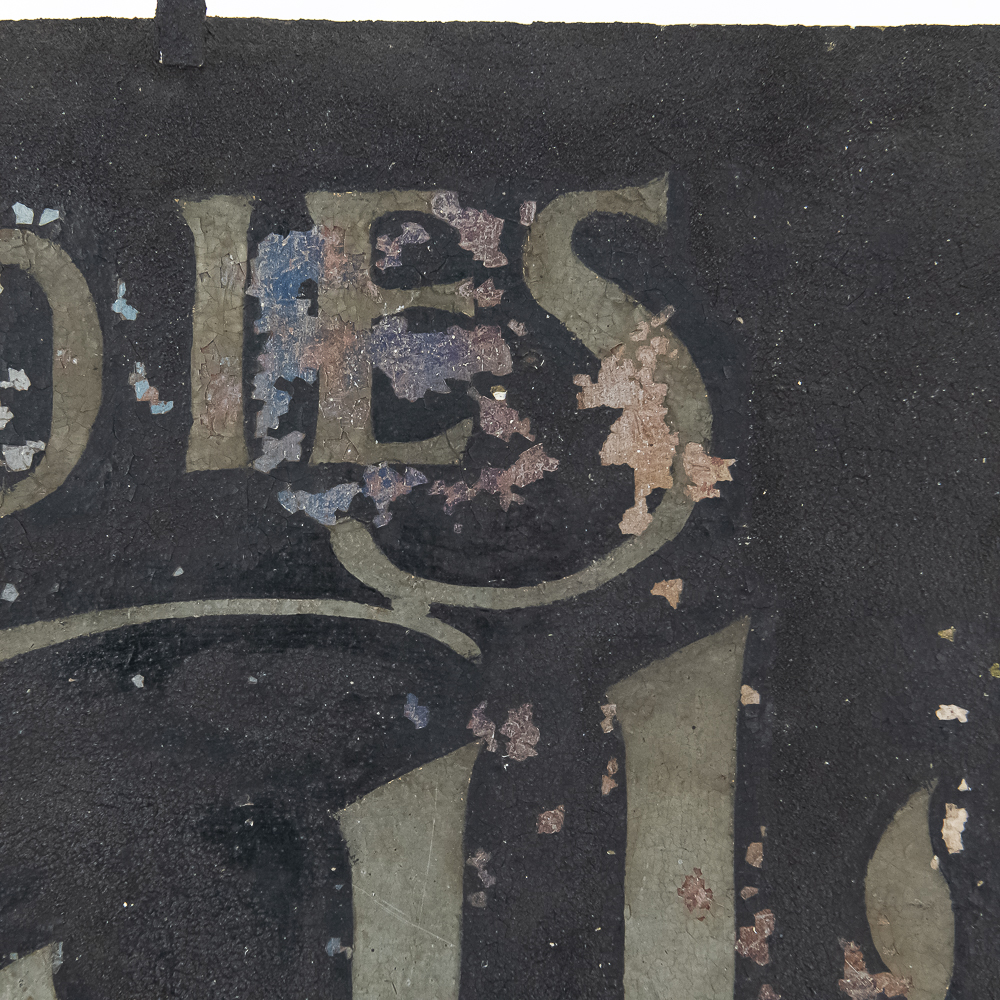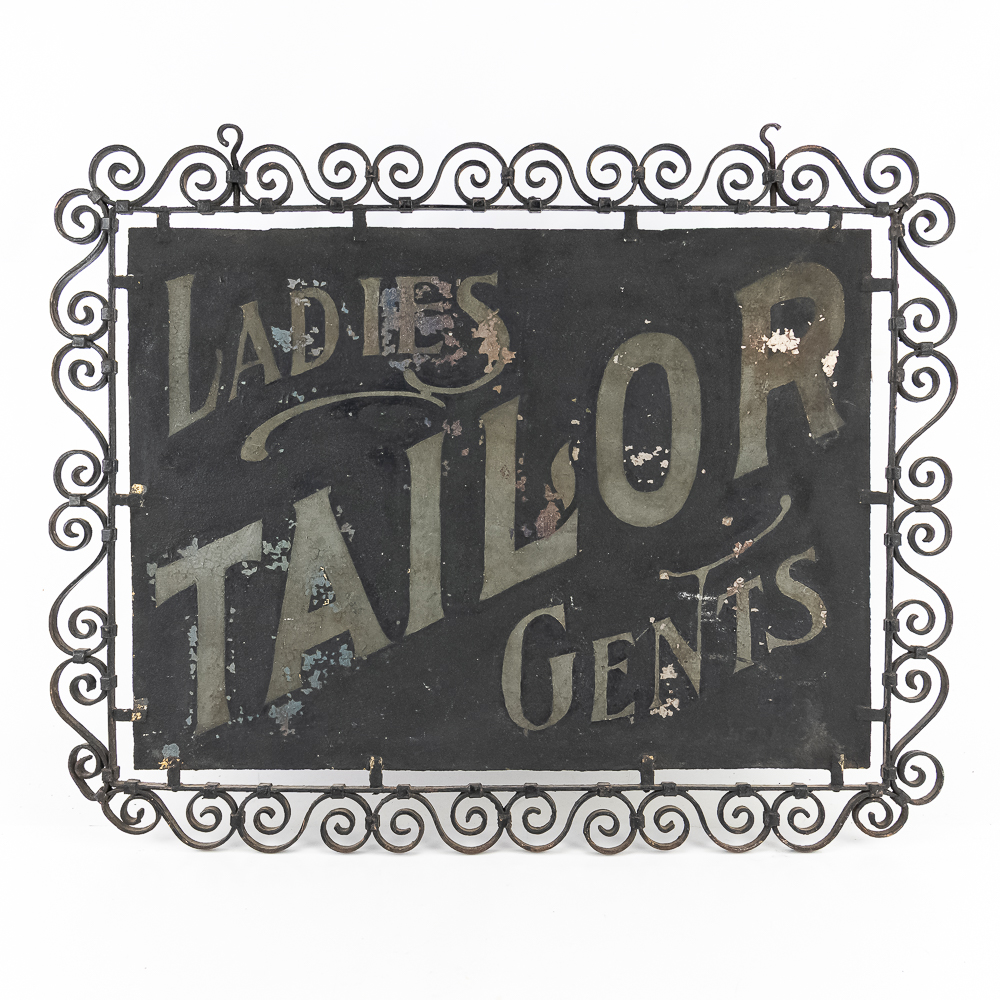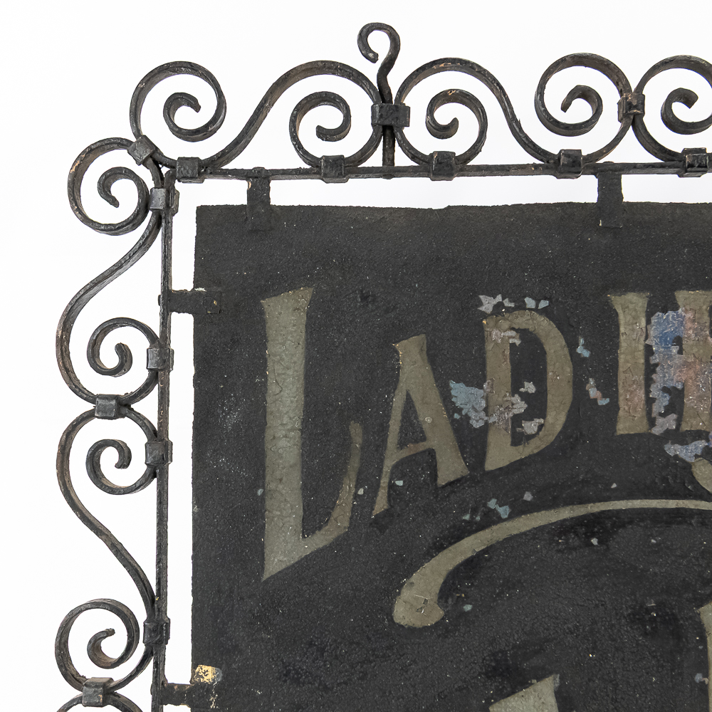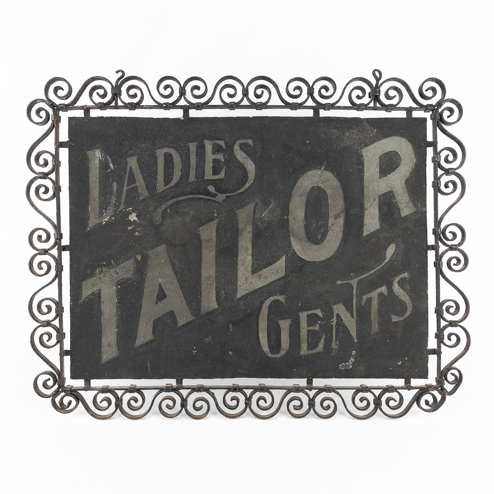 Double sided schmaltz on tin sign for a Ladies & Gents Tailor. Sign is mounted in a decorative curled iron frame. One side has more paint loss that the other but both sides present well. Measures 29.5″ wide, 23″ tall.