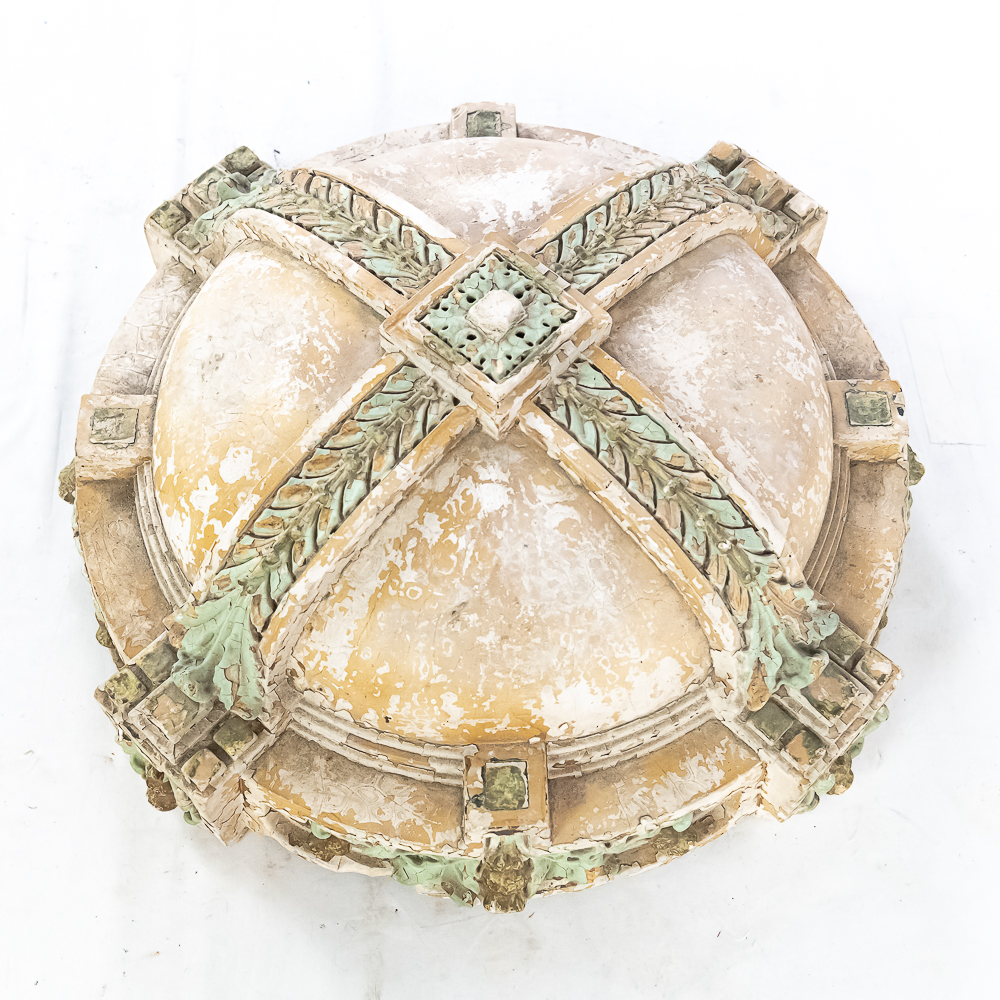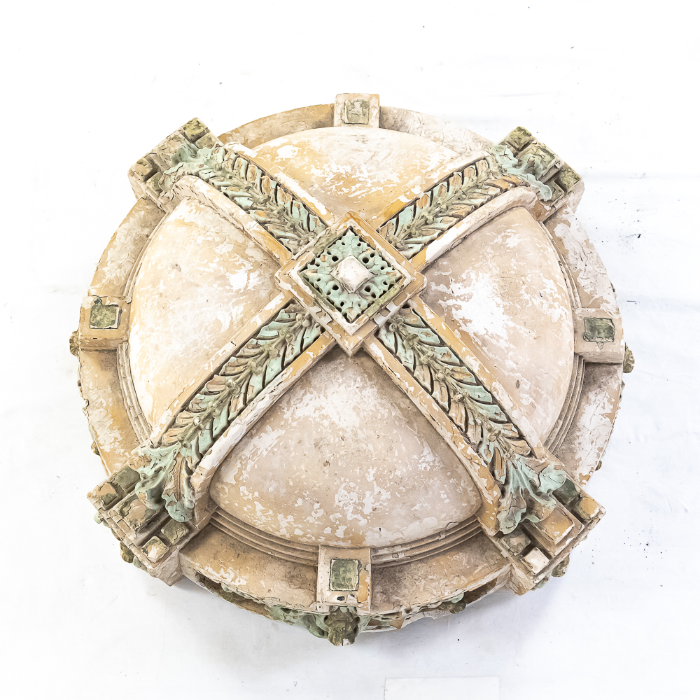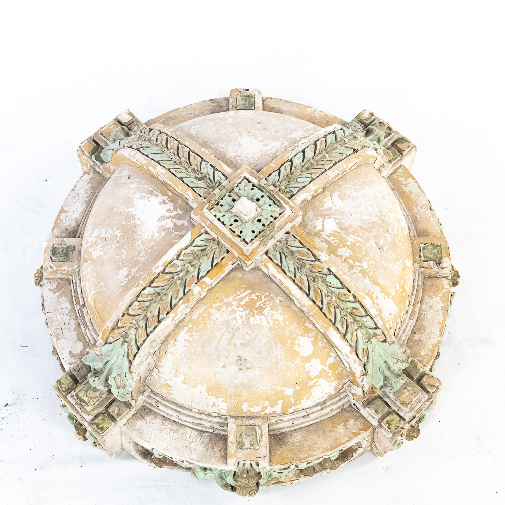 An unusual ornate plaster ceiling medallion in good condition with some peeling finish. Please see photos.28″ diameter X 11″ H