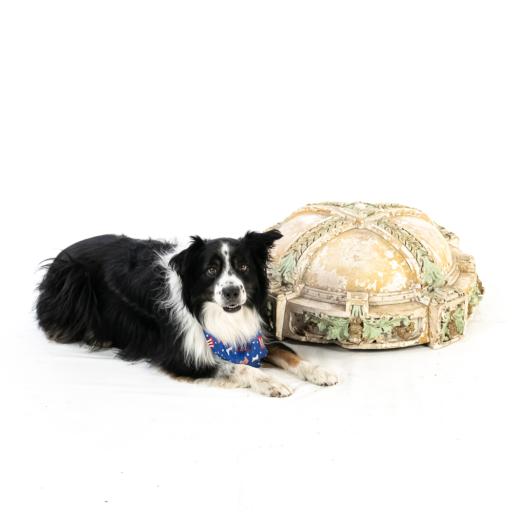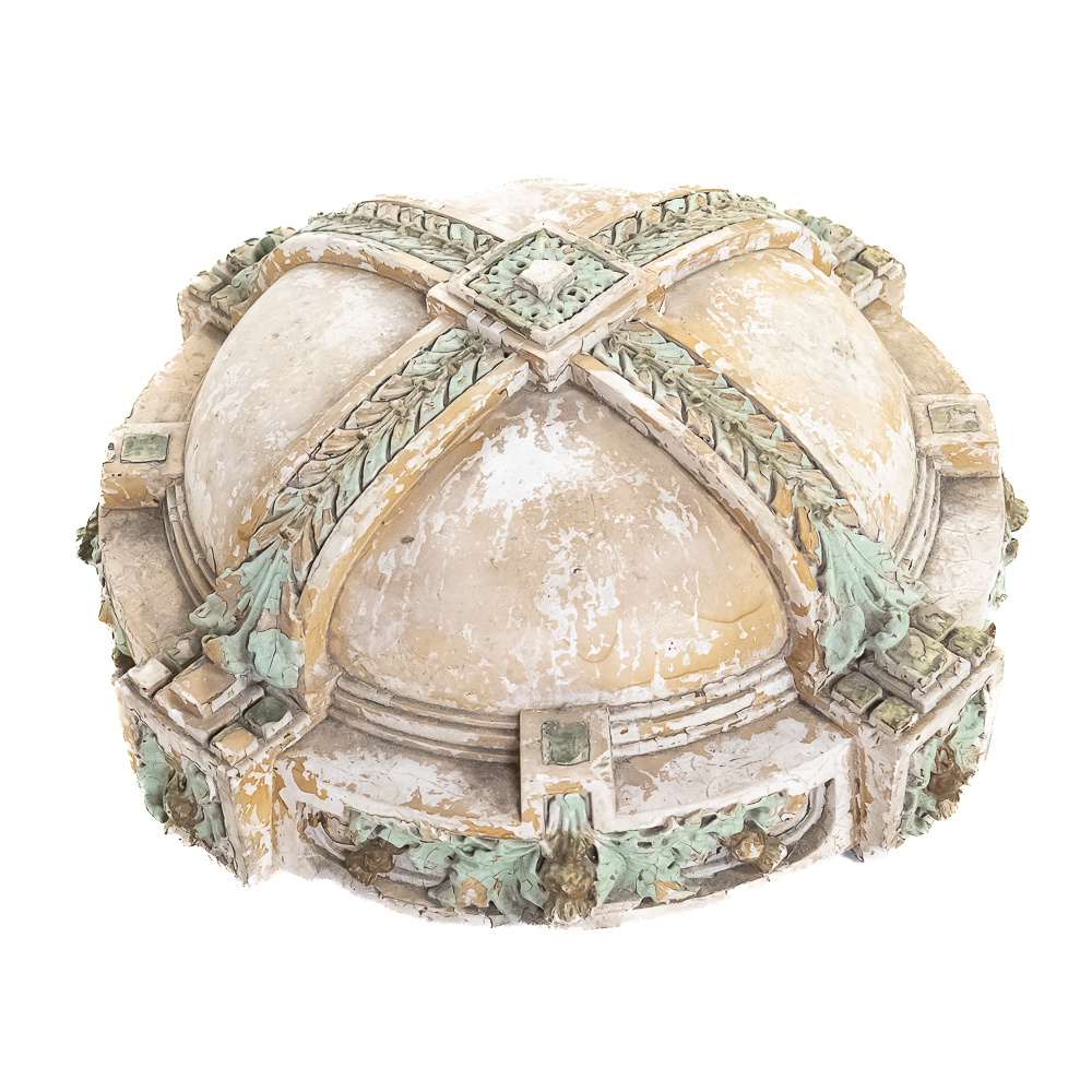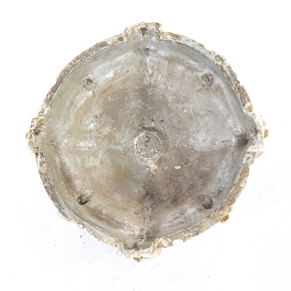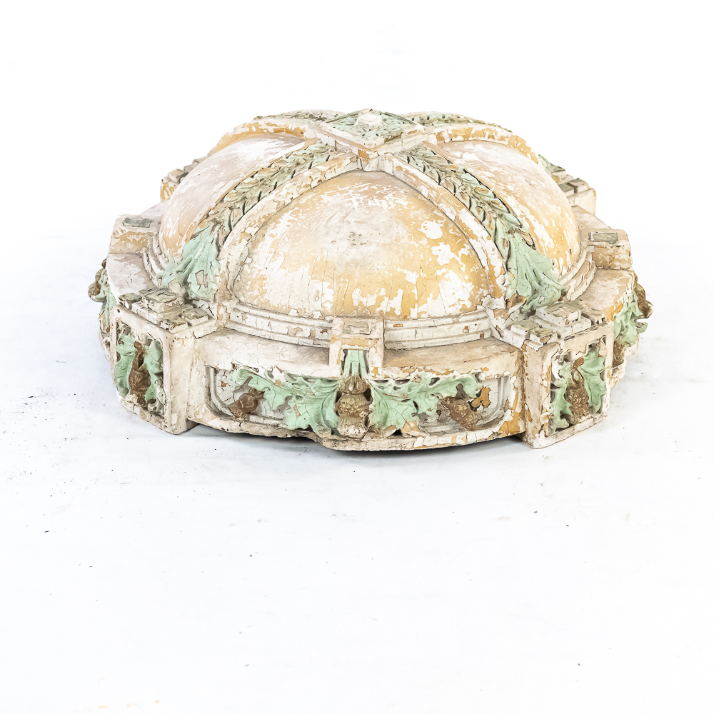 An unusual ornate plaster ceiling medallion in good condition with some peeling finish. Please see photos.28″ diameter X 11″ H