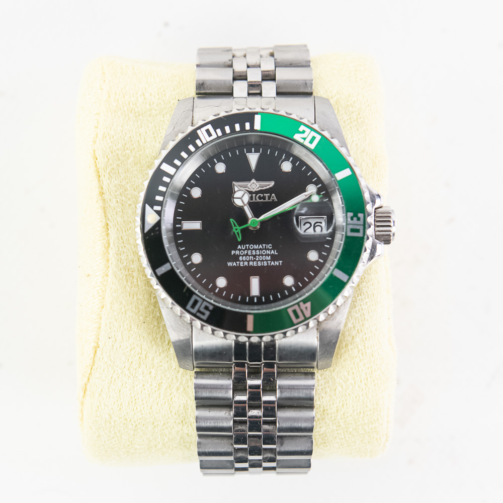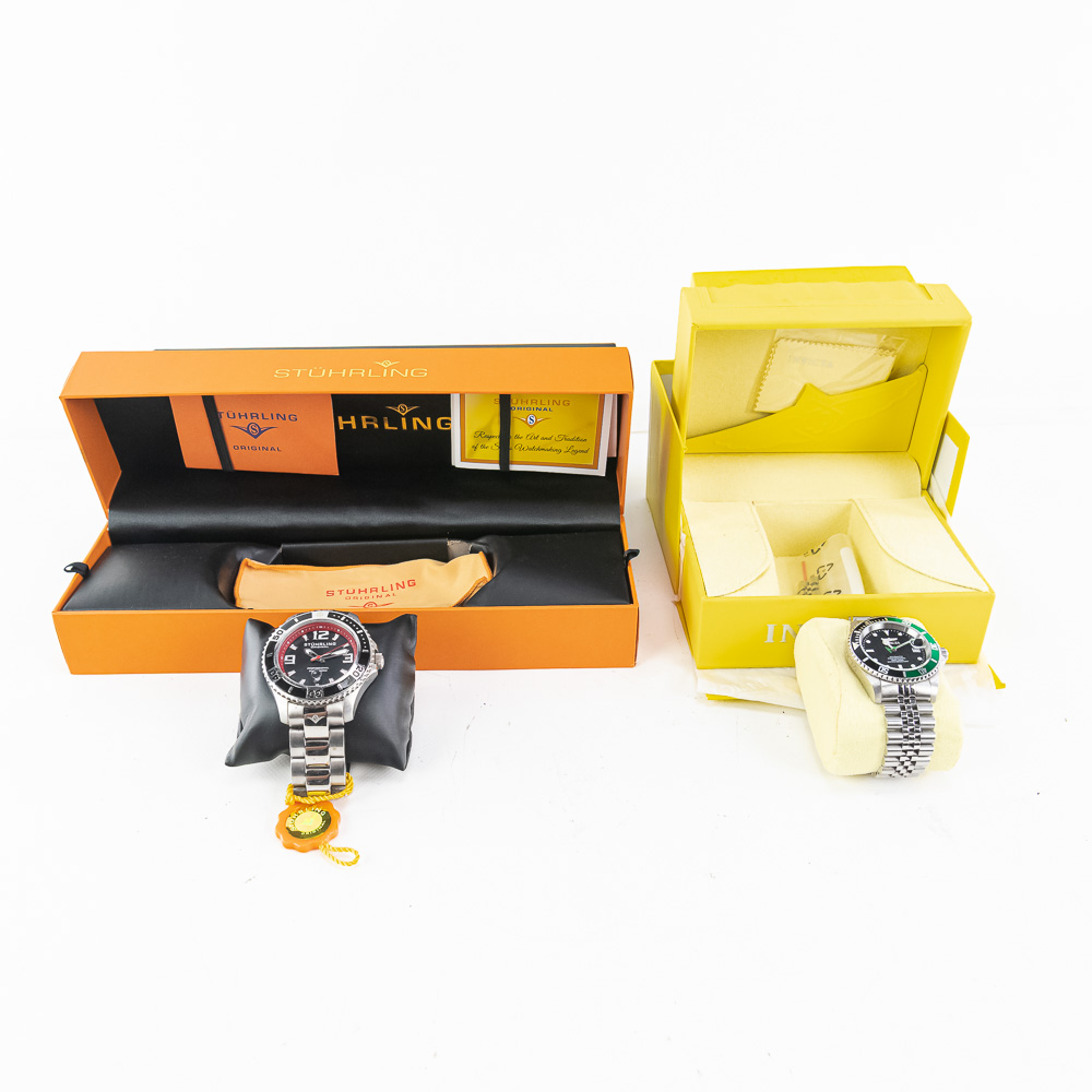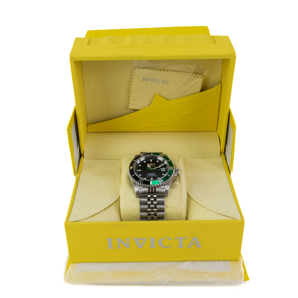 Collection includes Men’s Invicta Pro Diver automatic “HULK” Rolex inspired 42mm stainless watch #29177, very good overall condition with light wear and complete with original box, papers and extra links. Additional Stuhrling original Professional Diver 200M; 50 mm. Very good to good overall condition with wear including surface scratches; complete with original box and papers & extra links, needs battery. Perfect additions to your lineup, please use photos to judge condition and bid accordingly.