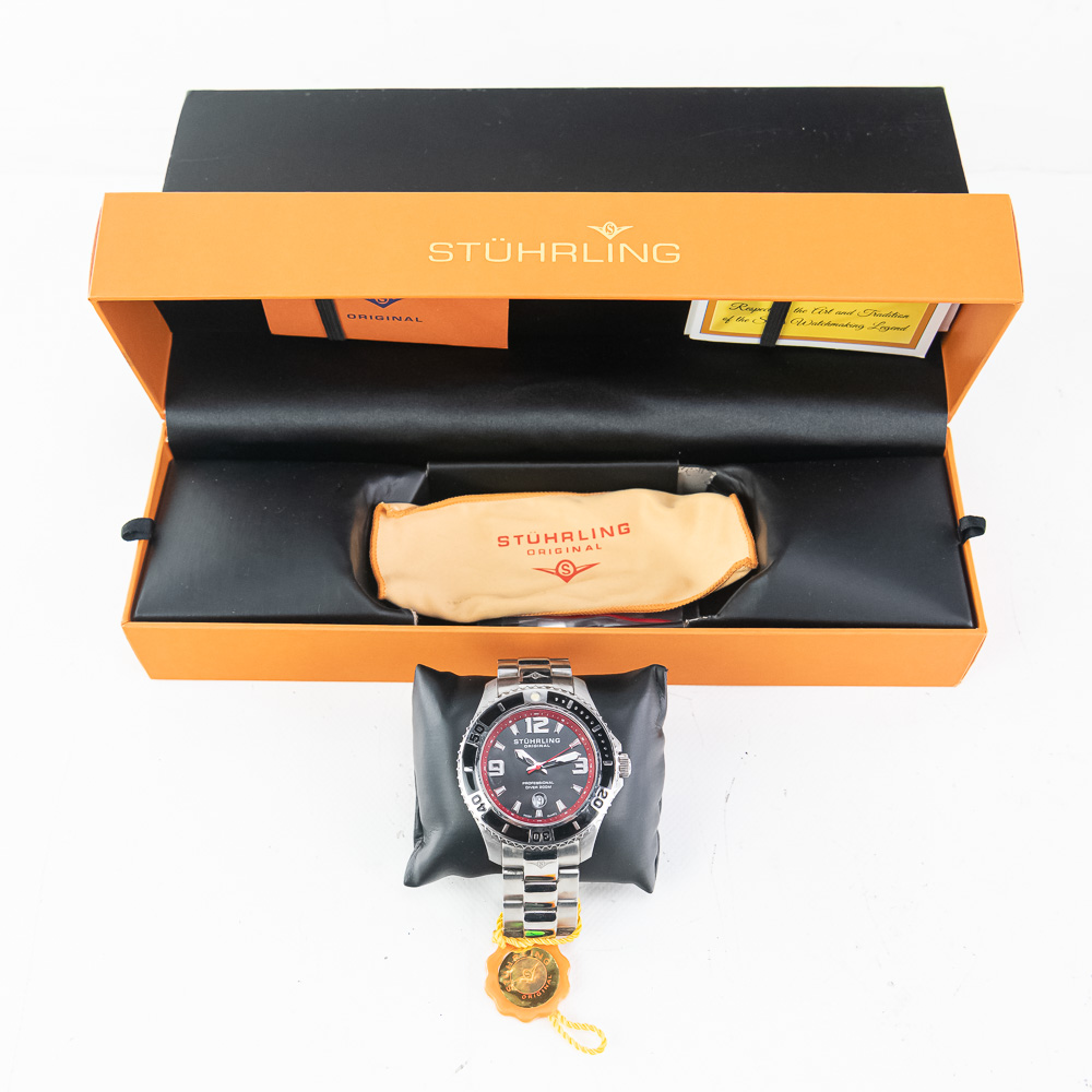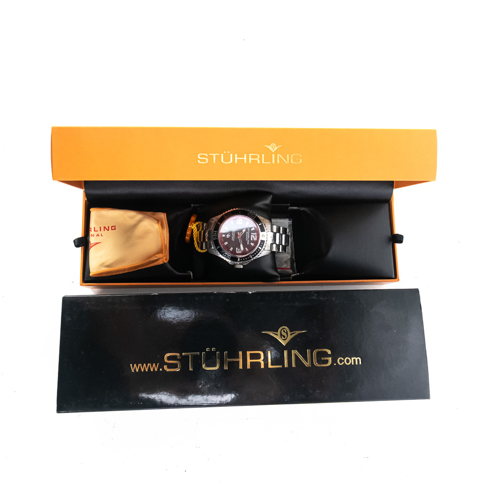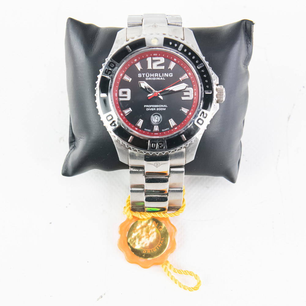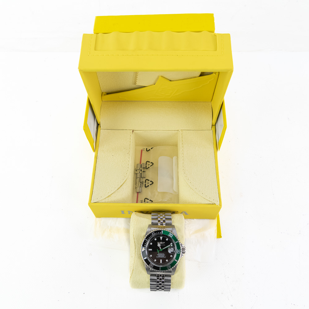Collection includes Men’s Invicta Pro Diver automatic “HULK” Rolex inspired 42mm stainless watch #29177, very good overall condition with light wear and complete with original box, papers and extra links. Additional Stuhrling original Professional Diver 200M; 50 mm. Very good to good overall condition with wear including surface scratches; complete with original box and papers & extra links, needs battery. Perfect additions to your lineup, please use photos to judge condition and bid accordingly.