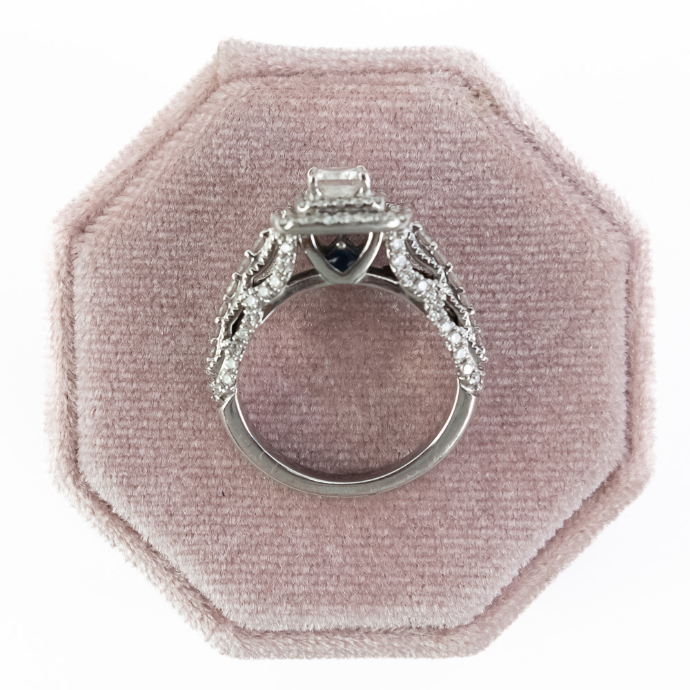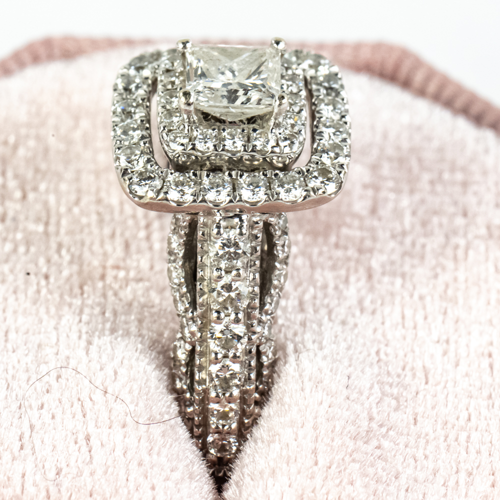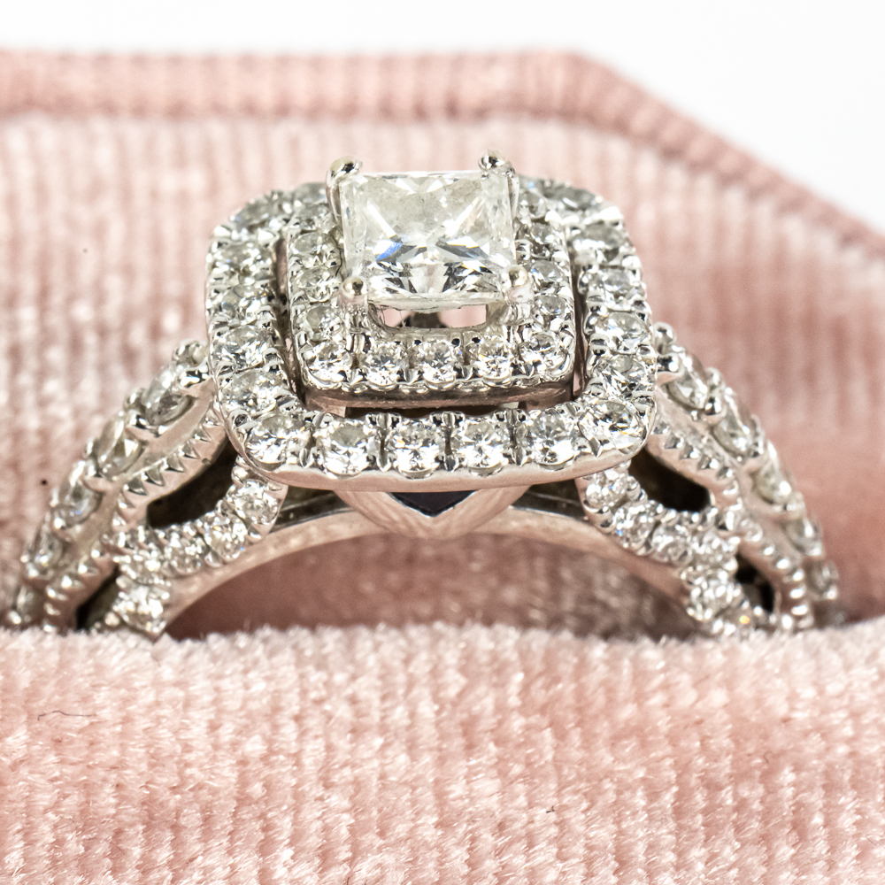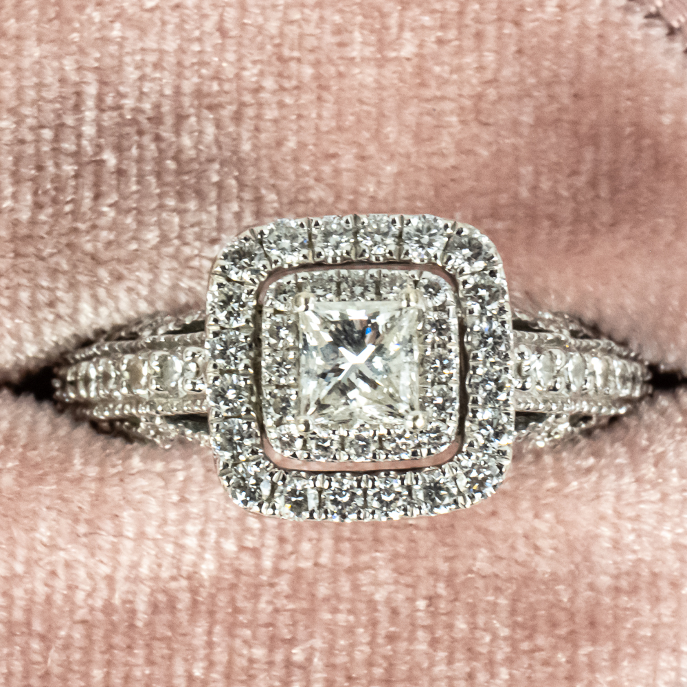 Vera Wang “Wish” 14k White Gold Princess Cut Diamond Engagement Ring. Showcases centralized half carat center diamond perfectly accented with halo and side accent princess round cut diamonds cumulating into 1.52 total carat weight. Timeless & Classic designed setting is perfectly accented with striking blue sapphire side accents; giving the ring and attractive eye catching highlight. All gemstones are SI2 clarity & I color and is showcased on Size 6 striking non common setting. Original receipts show original total retail price paid was $5198.73. Ring was purchased however never presented; no bad energy surrounds this ring. The upcoming holidays are the perfect time of the year to get engaged and are quickly approaching. Have the confidence to ask that special lady to spend the rest of your life together!! This one will impress her and she ll be proud to showcase it off her finger and show all her friend and family. Great Gift Idea, this one will get you out of the doghouse!! Why pay retail??? Please use photos to judge condition and bid accordingly.