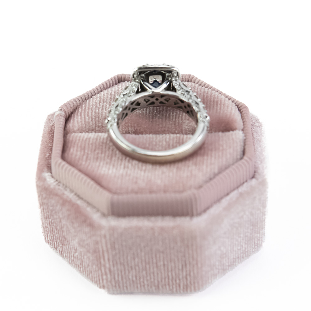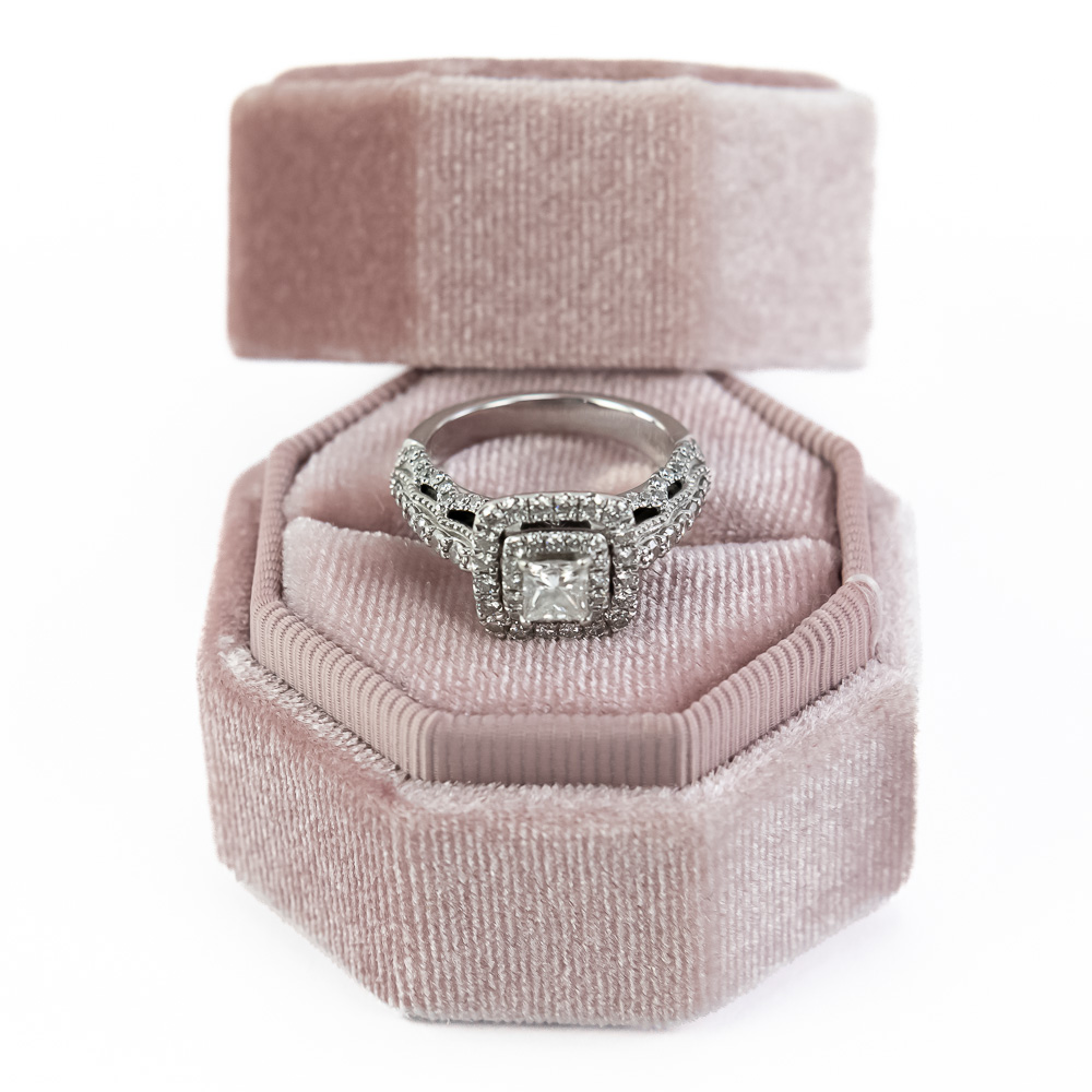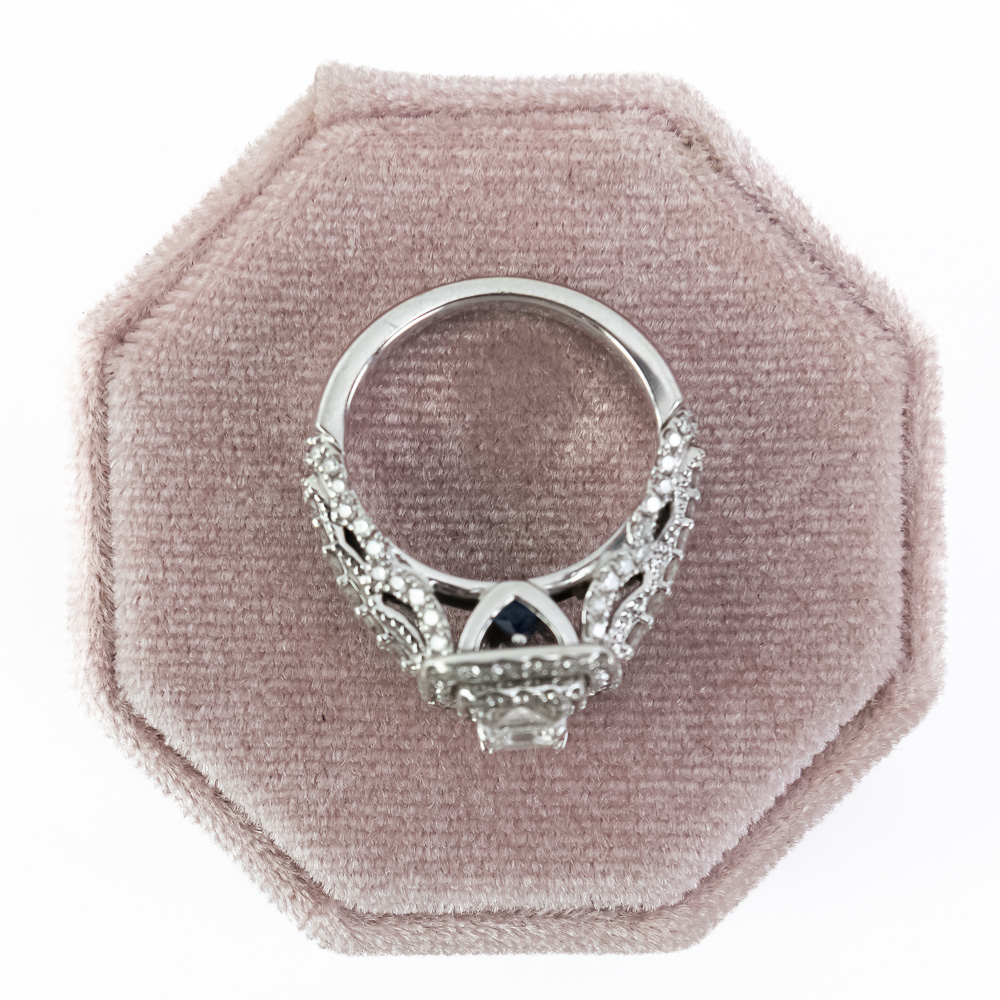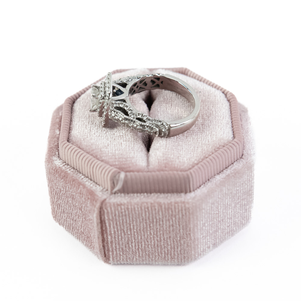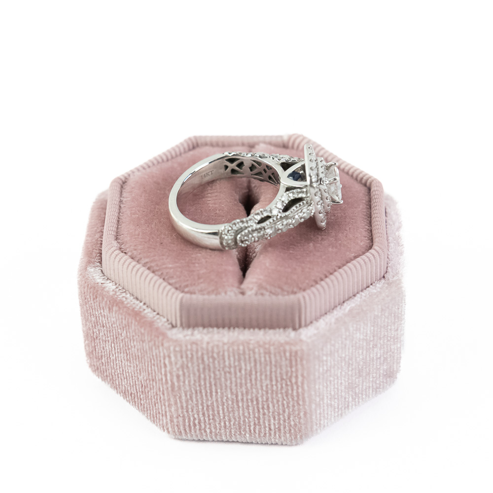 Vera Wang “Wish” 14k White Gold Princess Cut Diamond Engagement Ring. Showcases centralized half carat center diamond perfectly accented with halo and side accent princess round cut diamonds cumulating into 1.52 total carat weight. Timeless & Classic designed setting is perfectly accented with striking blue sapphire side accents; giving the ring and attractive eye catching highlight. All gemstones are SI2 clarity & I color and is showcased on Size 6 striking non common setting. Original receipts show original total retail price paid was $5198.73. Ring was purchased however never presented; no bad energy surrounds this ring. The upcoming holidays are the perfect time of the year to get engaged and are quickly approaching. Have the confidence to ask that special lady to spend the rest of your life together!! This one will impress her and she ll be proud to showcase it off her finger and show all her friend and family. Great Gift Idea, this one will get you out of the doghouse!! Why pay retail??? Please use photos to judge condition and bid accordingly.