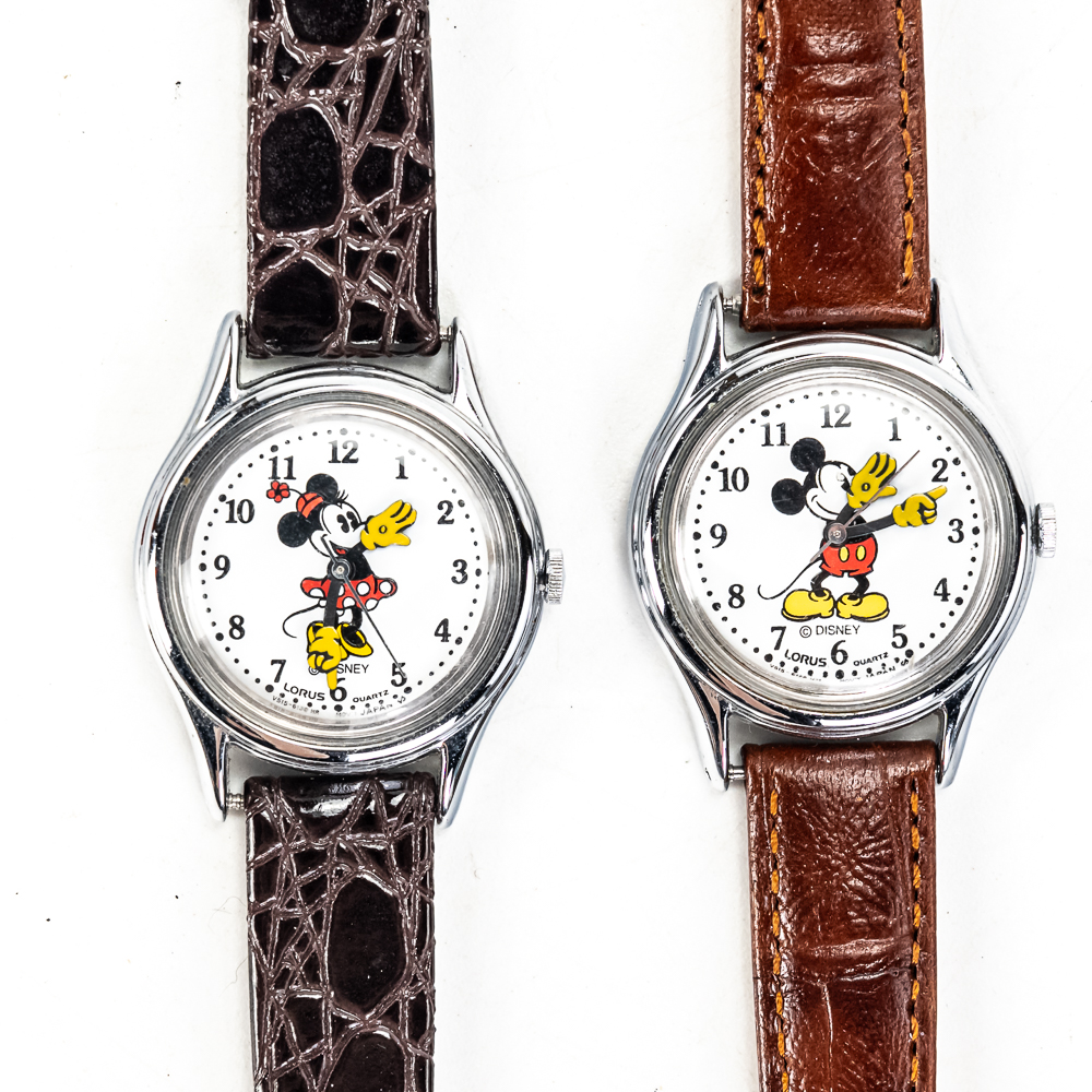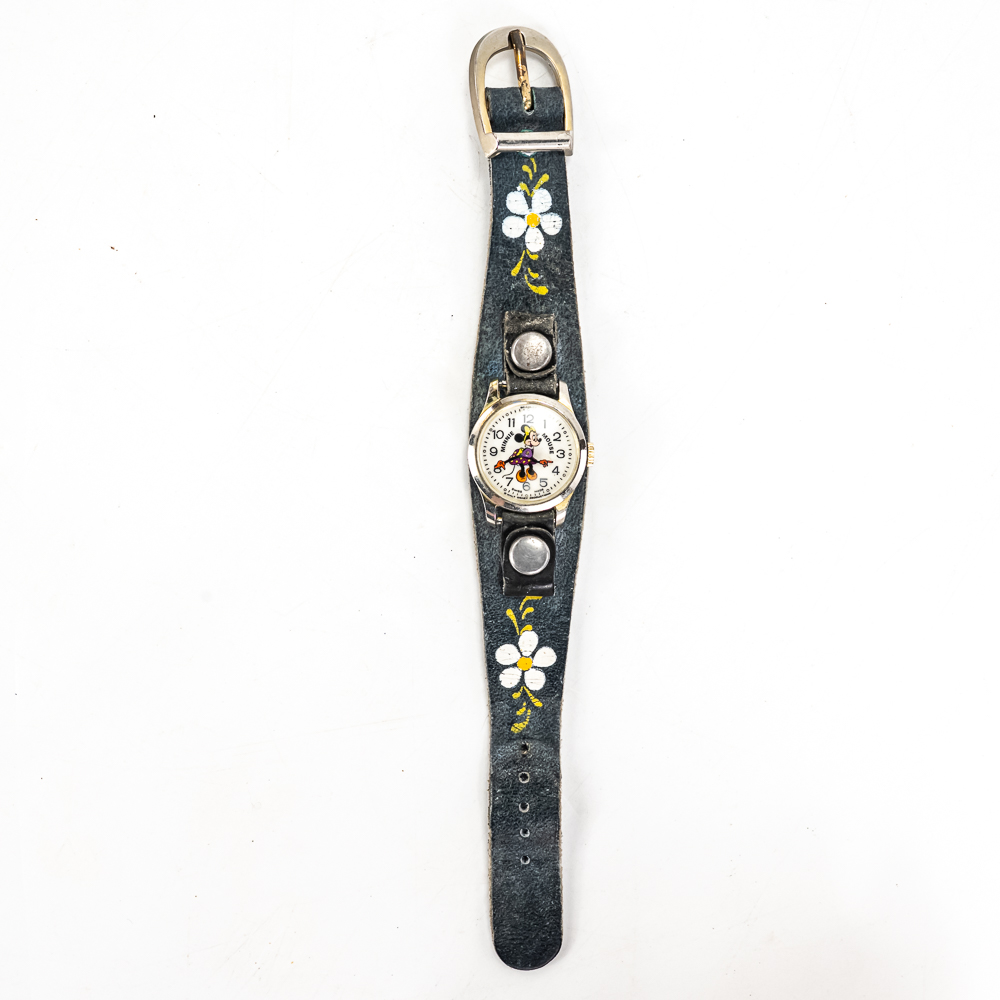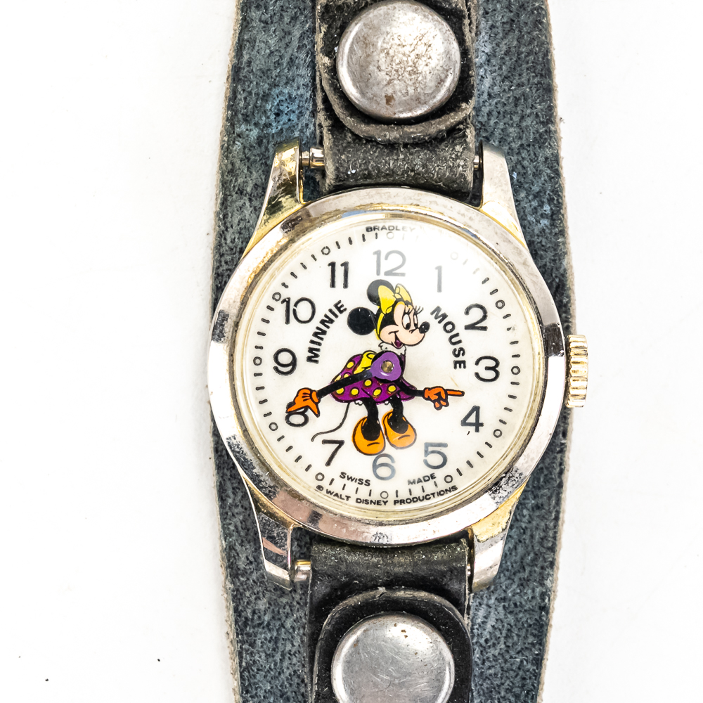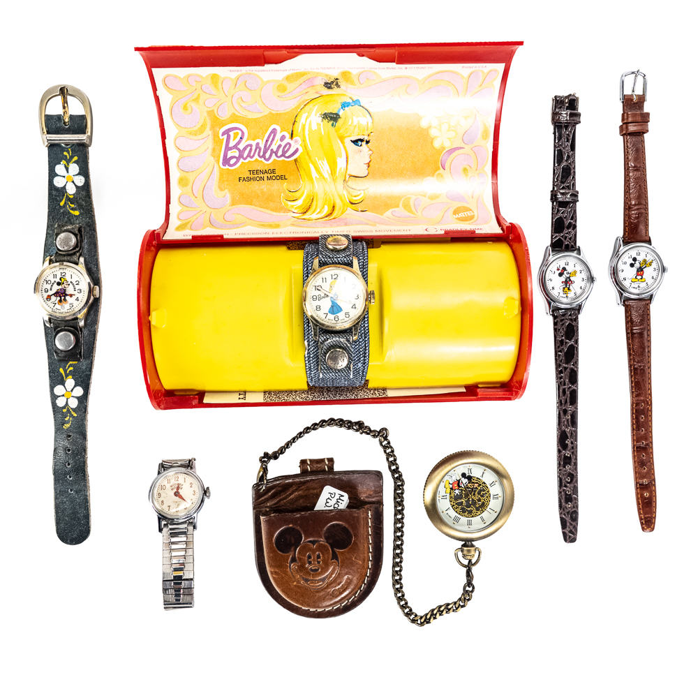 Collection features vintage Bradley Minnie Mouse Walt Disney Productions mechanical children’s / ladies wristwatch; showcased with vintage floral themed leather band winds and works, 1960s Mickey Mouse US Time children’s / ladies wristwatch; winds and works and in very good overall condition, Pair of Lorus quartz Minnie Mouse Disney children’s/ ladies wristwatch both with new leather bands, 1973 Barbie Teenage Model Mattel wristwatch with denim band with original box, and Mickey Mouse Skeleton pocket watch with case and chain; works and shows wear on backside. Perfect additions to your collection, please use photos to judge condition and bid accordingly.