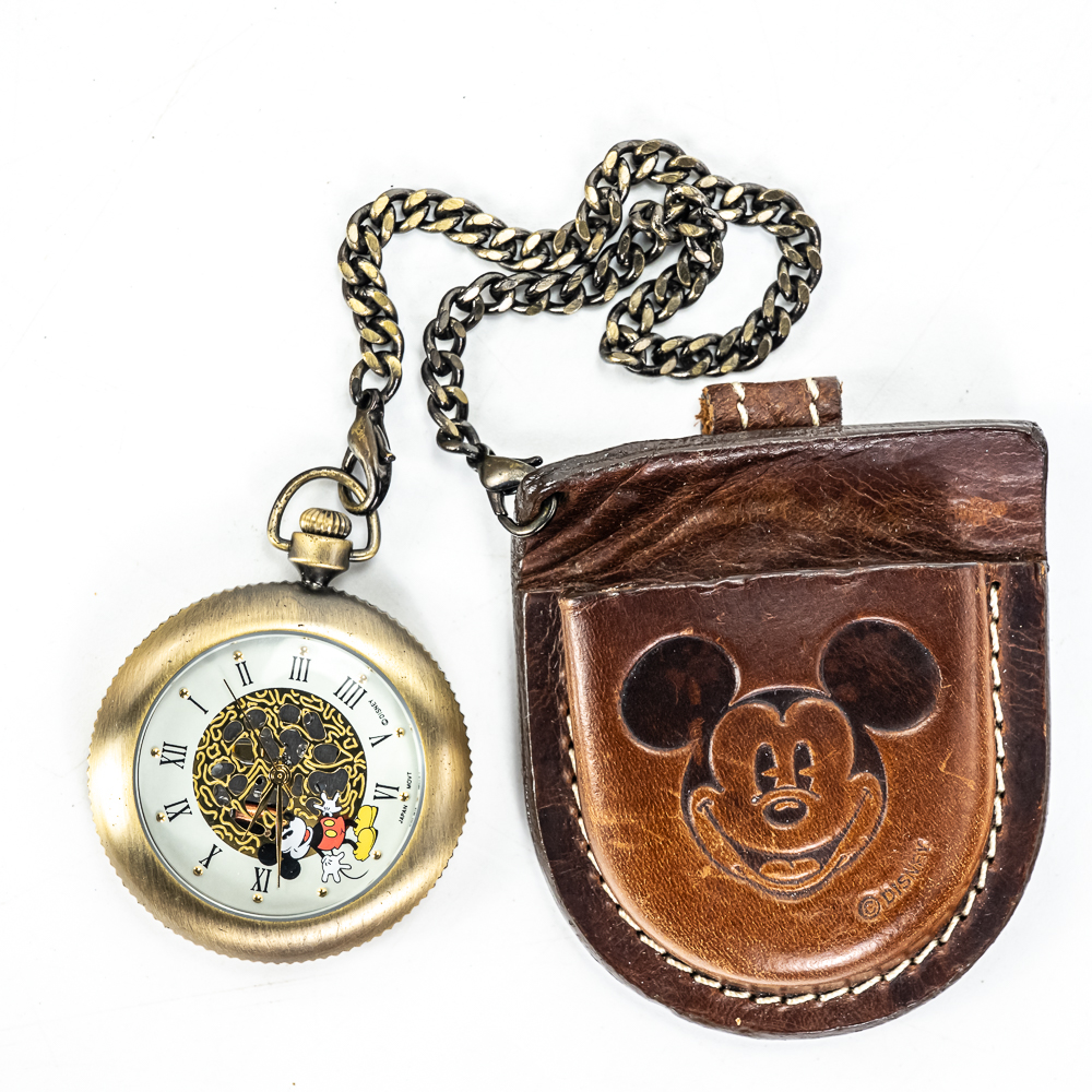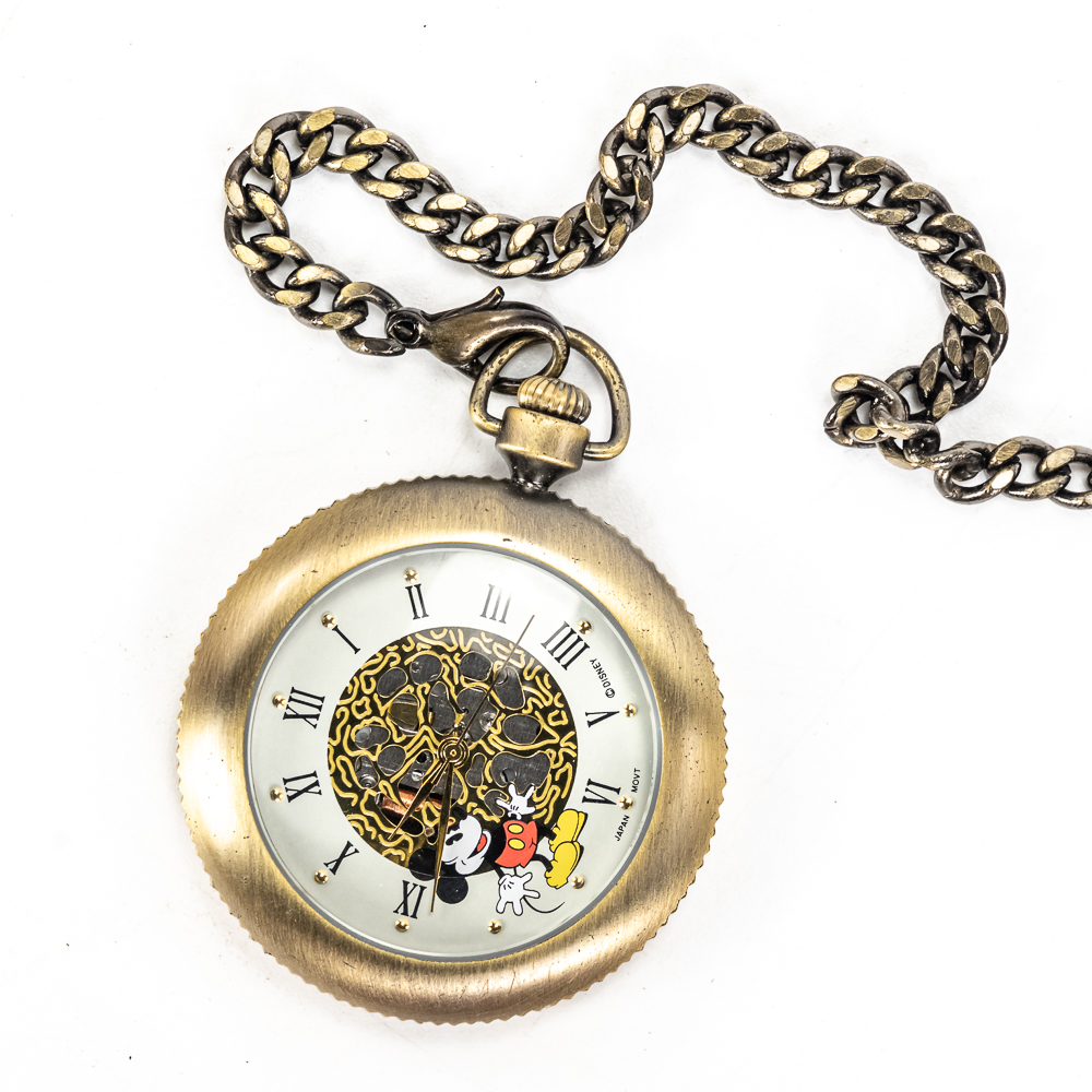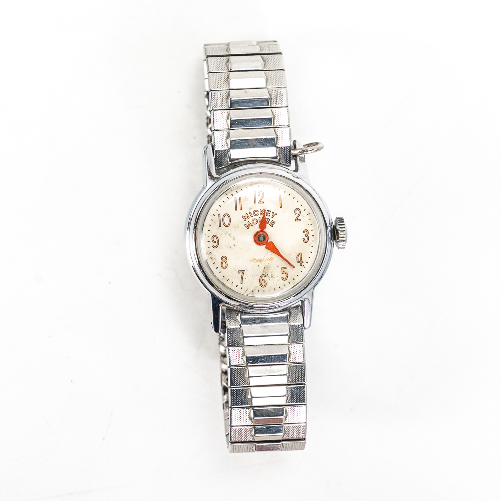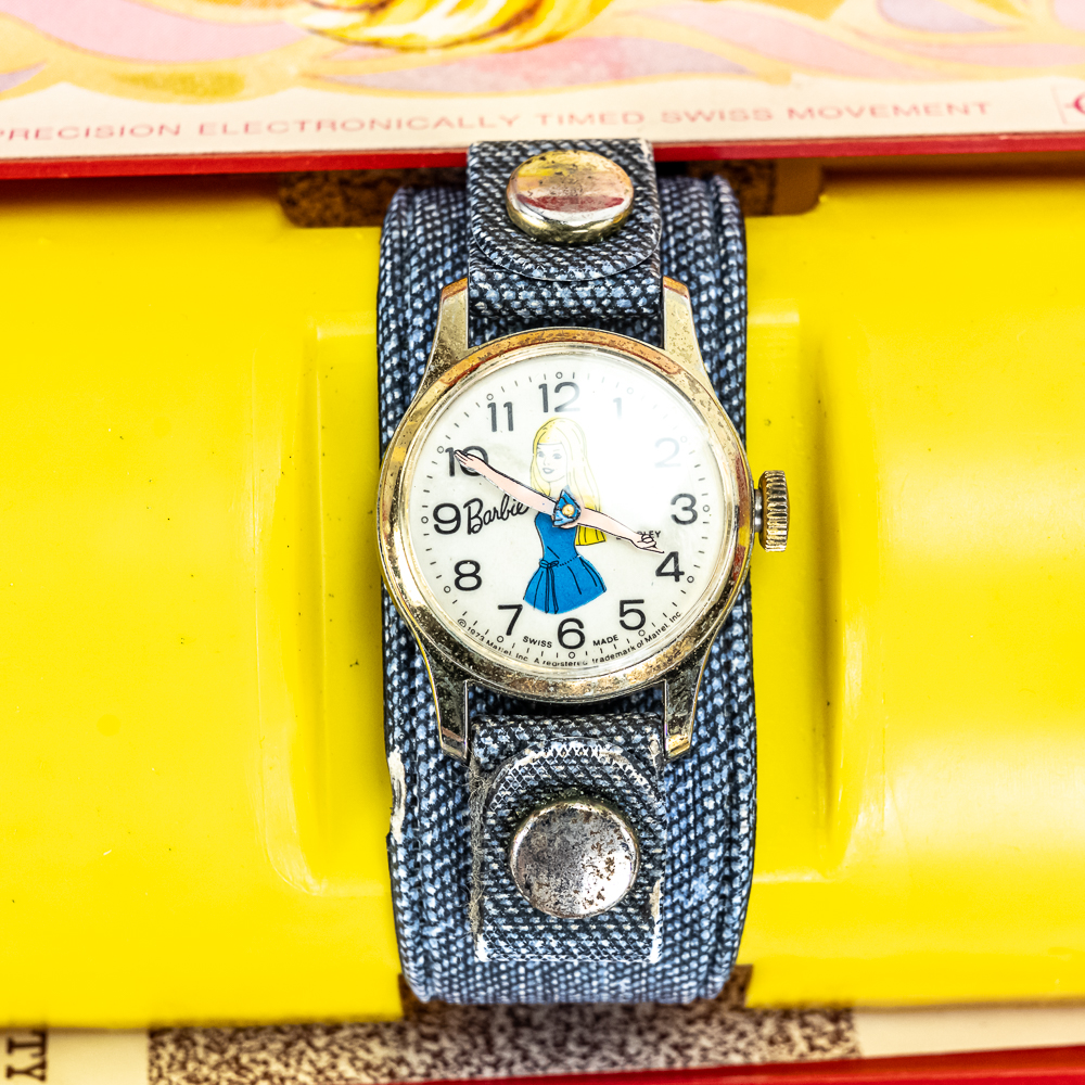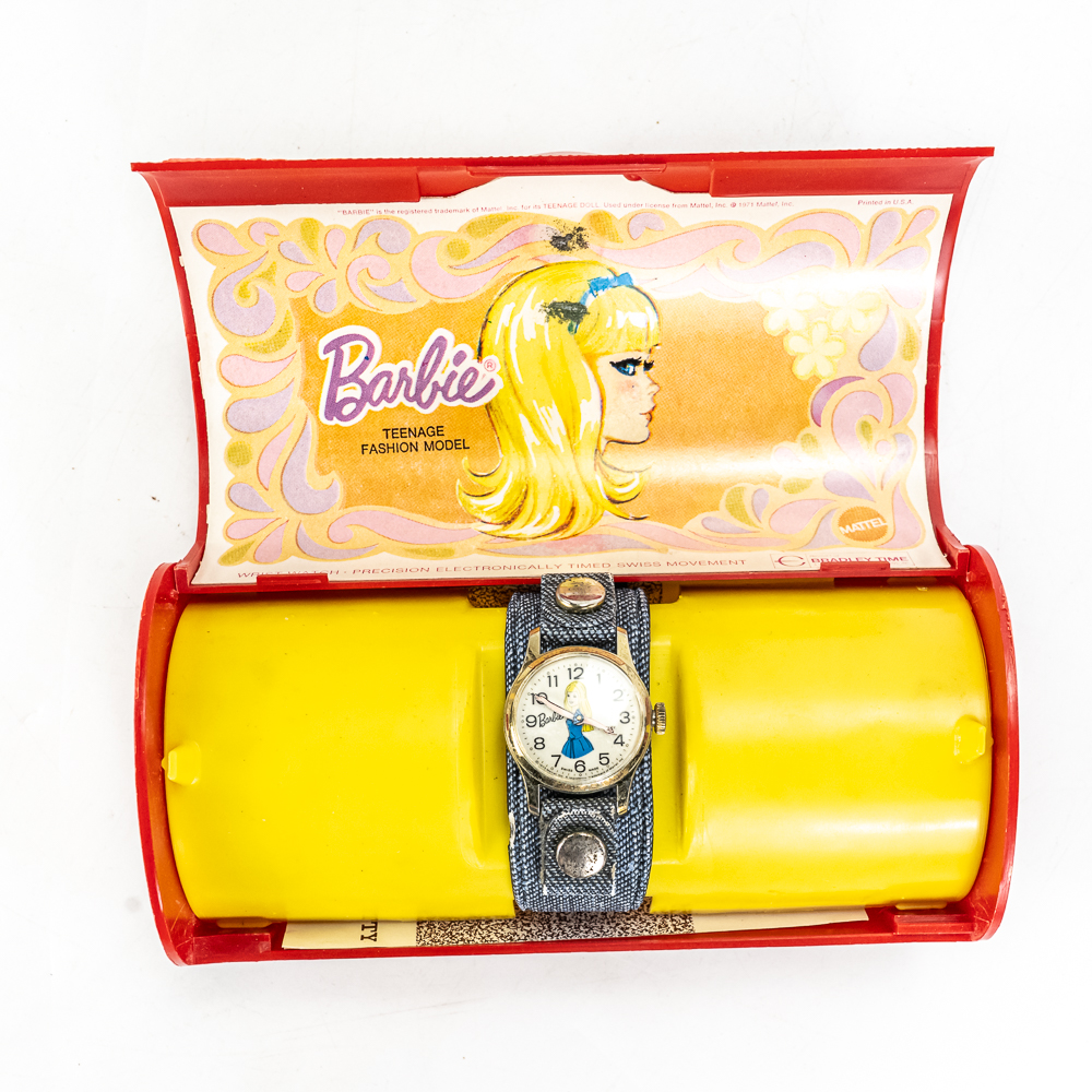 Collection features vintage Bradley Minnie Mouse Walt Disney Productions mechanical children’s / ladies wristwatch; showcased with vintage floral themed leather band winds and works, 1960s Mickey Mouse US Time children’s / ladies wristwatch; winds and works and in very good overall condition, Pair of Lorus quartz Minnie Mouse Disney children’s/ ladies wristwatch both with new leather bands, 1973 Barbie Teenage Model Mattel wristwatch with denim band with original box, and Mickey Mouse Skeleton pocket watch with case and chain; works and shows wear on backside. Perfect additions to your collection, please use photos to judge condition and bid accordingly.