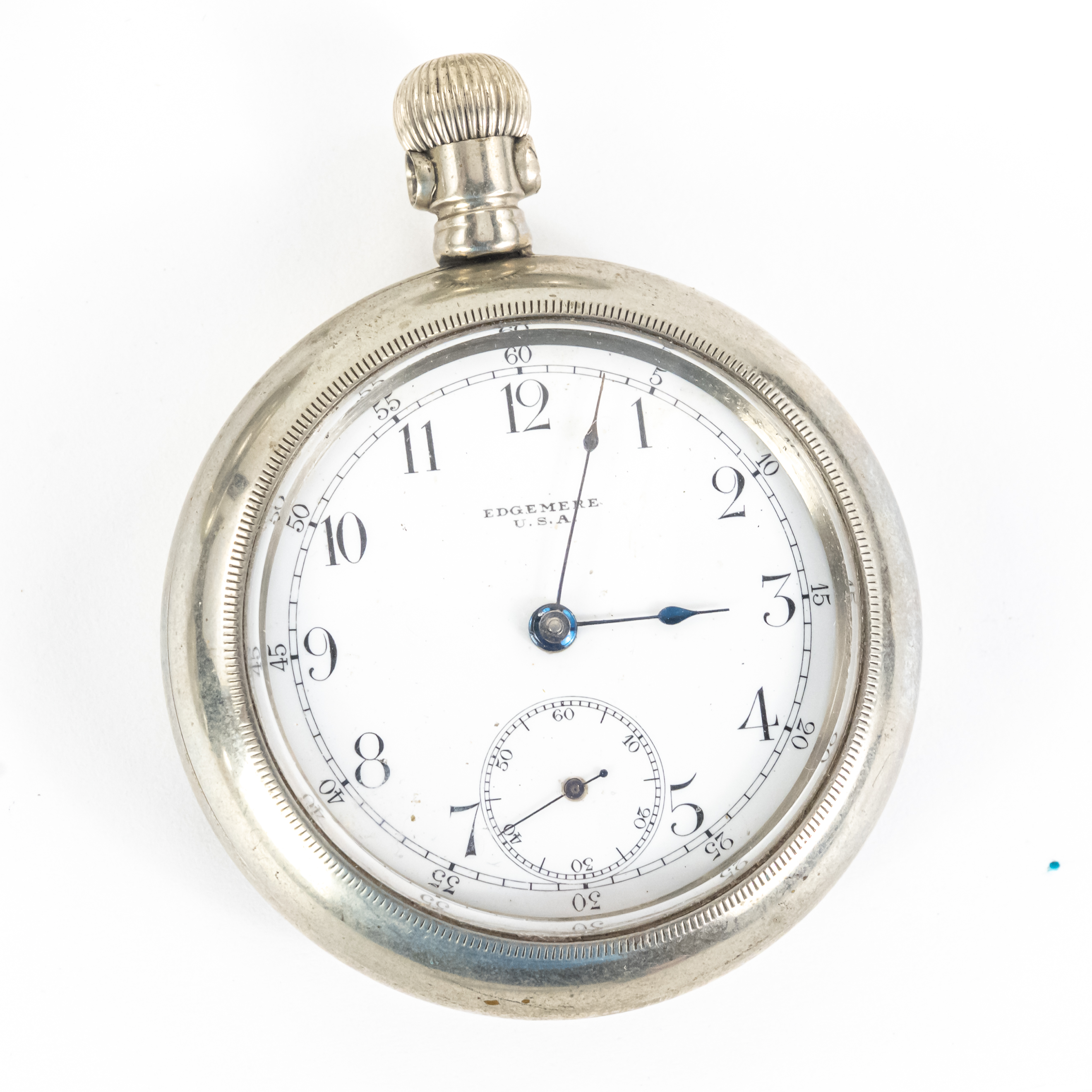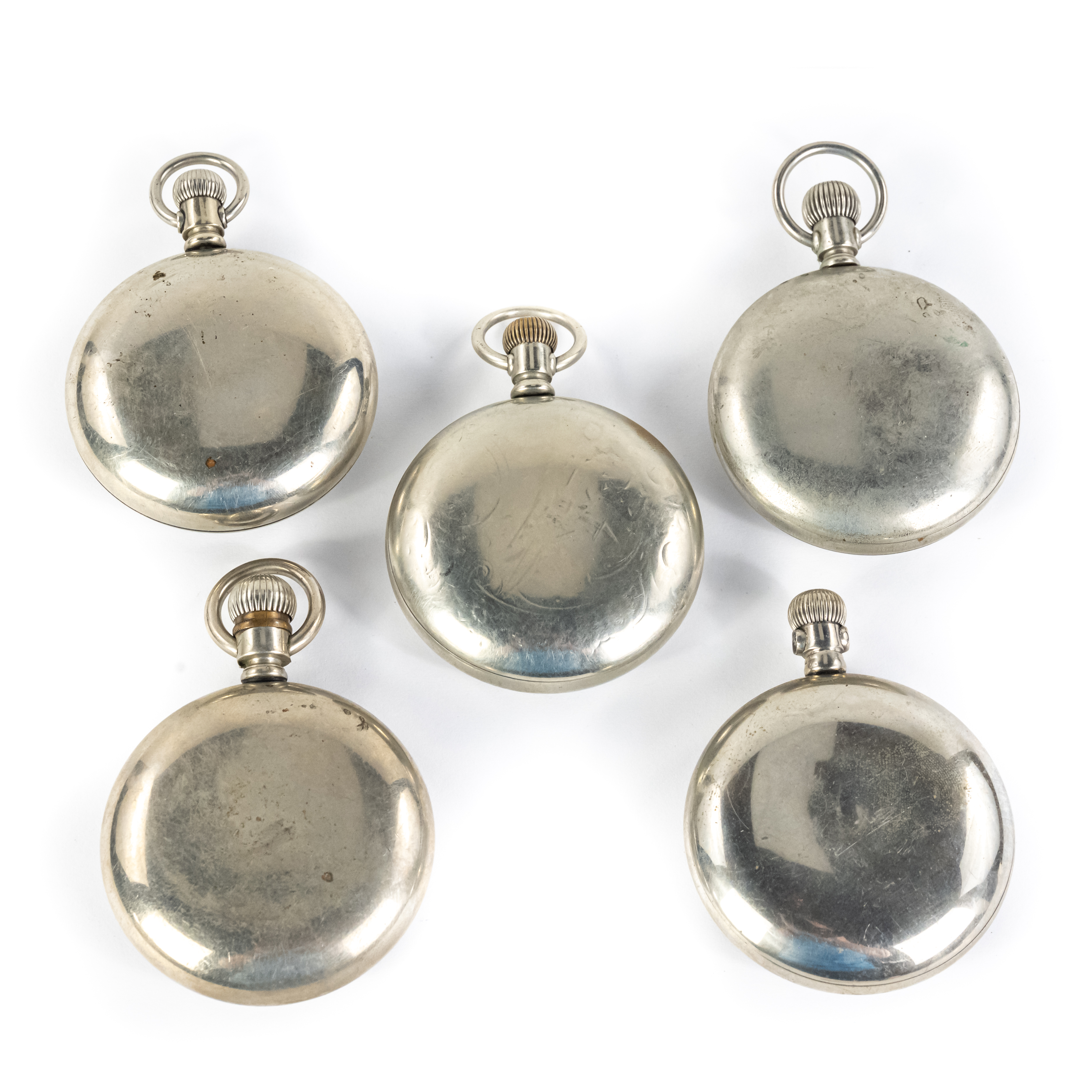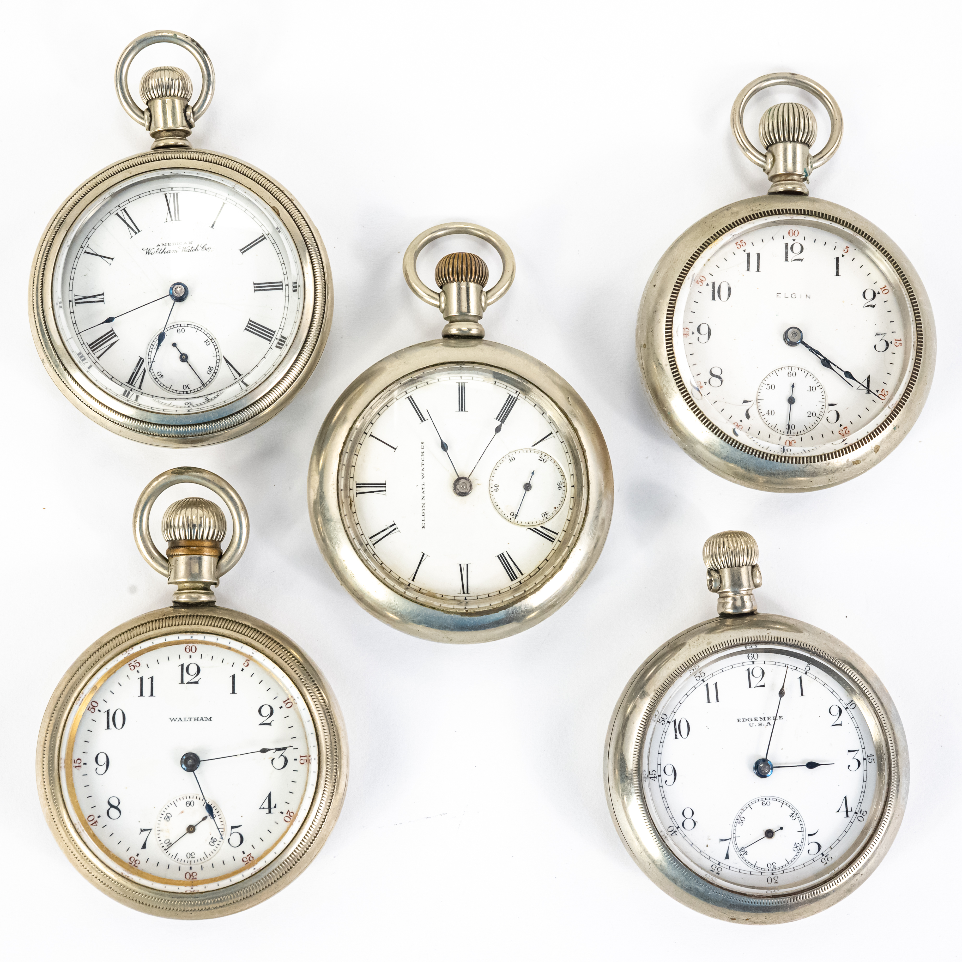 Collection of (5) assorted vintage silver tone open faced Men’s pocket watches manufacturers including Elgin, Elgin National, Edgemere, American Waltham & Waltham. Perfect additions to your collection, assorted conditions please use photos to judge condition and bid accordingly.
