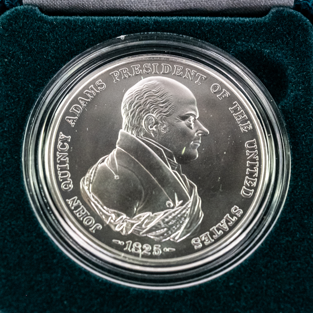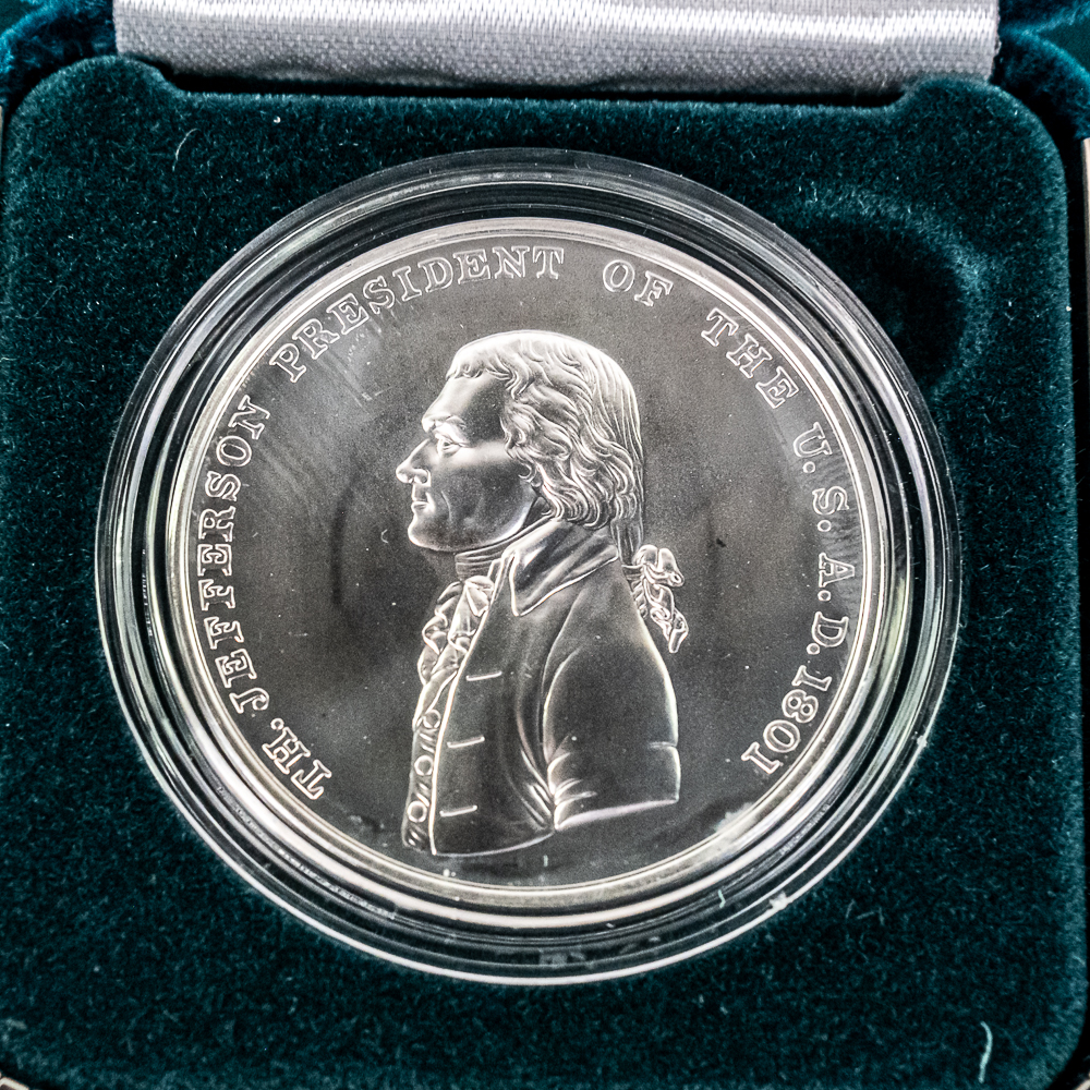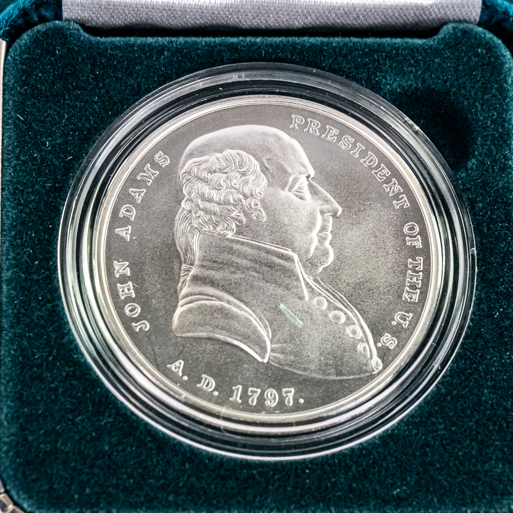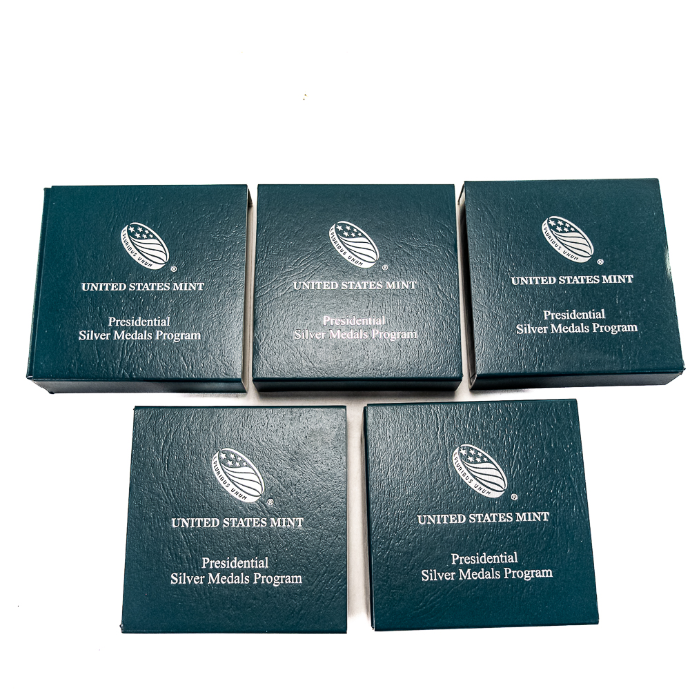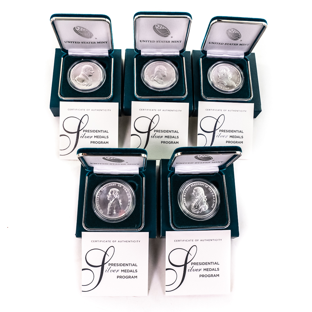 Collection of (5) assorted United States Mint Presidential Silver Medals including George Washington, John Adams, John Quincy Adams,Thomas Jefferson & James Madison uncirculated Commemorative Silver Medals; each still showcased inside original governmental packaging. Perfect addition to your collection, please use photos to judge condition and bid accordingly.
