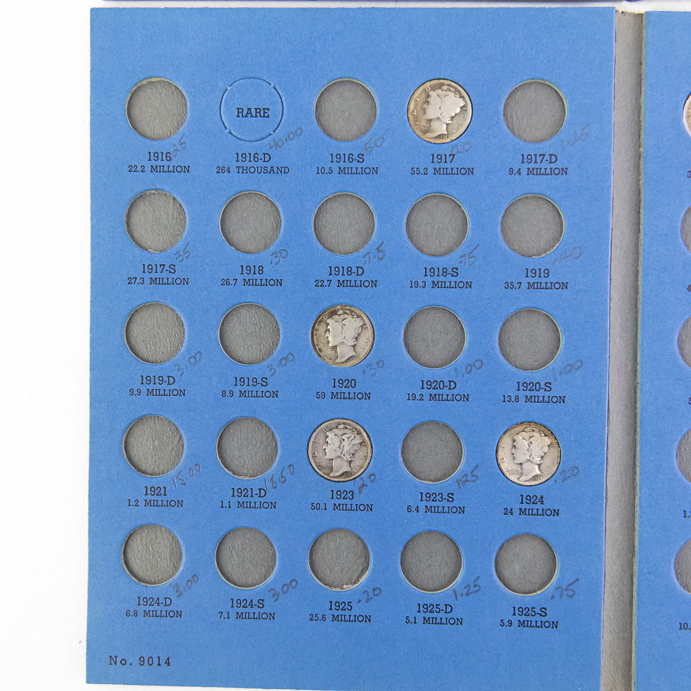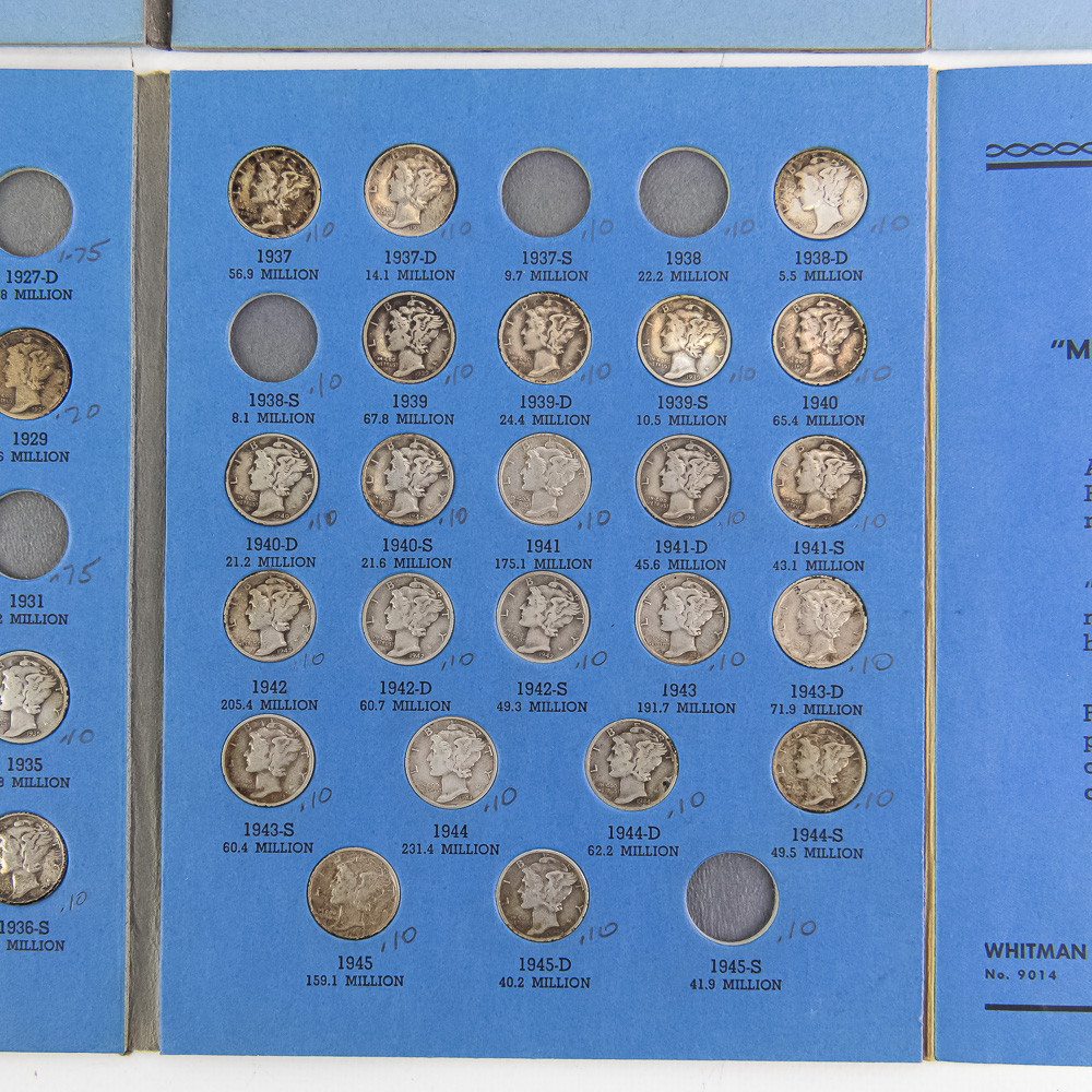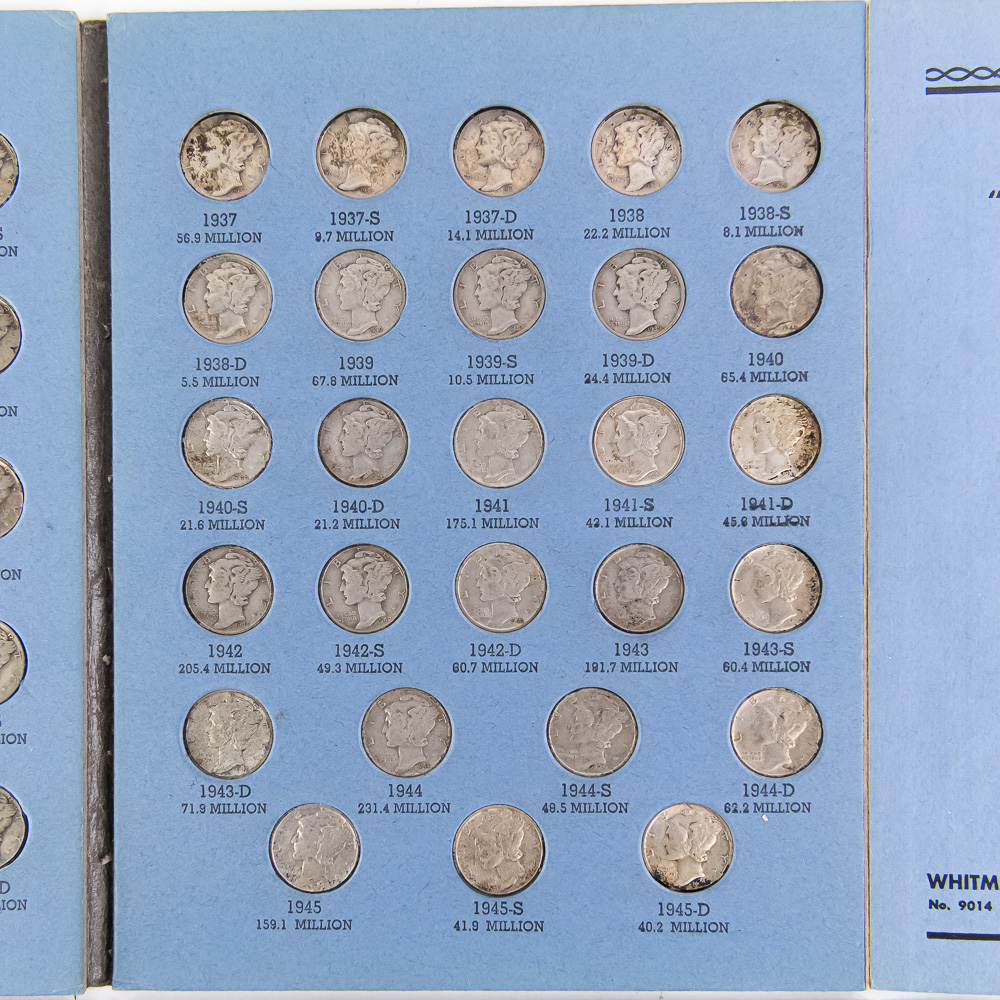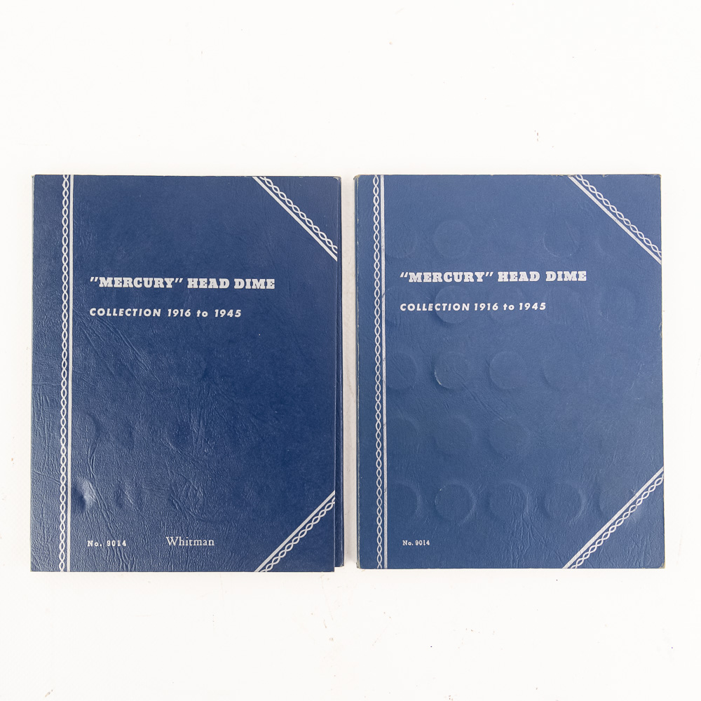Collection features a pair of vintage Whitman “Mercury” Head silver dime collector albums; each partially completed. Album # 1 showcases a total of (37) 1916-1945 assorted silver dimes; Album #2 showcases (72) 1916-1945 assorted silver Mercury head dimes. Not many slots needed to fill to have two completed albums. (109) total silver dimes between both albums. Perfect addition to your collection, please use photos to judge condition and bid accordingly.
