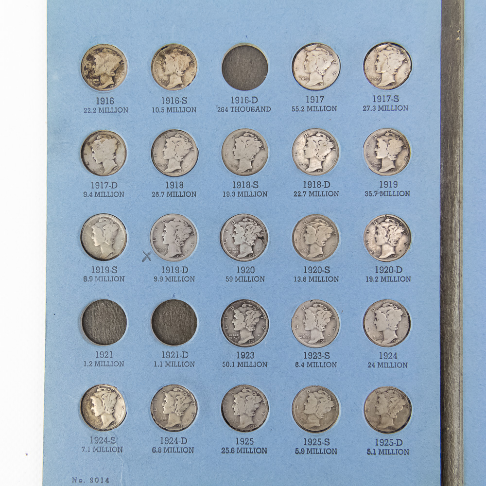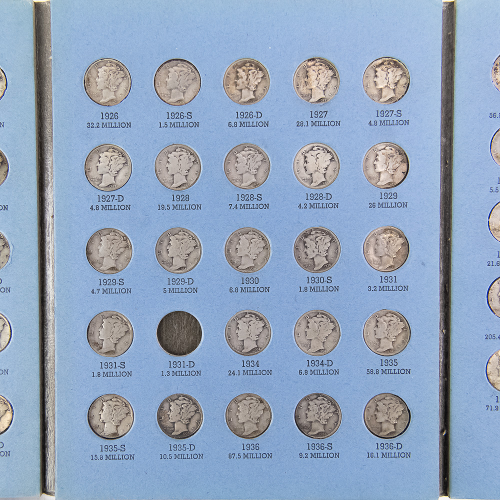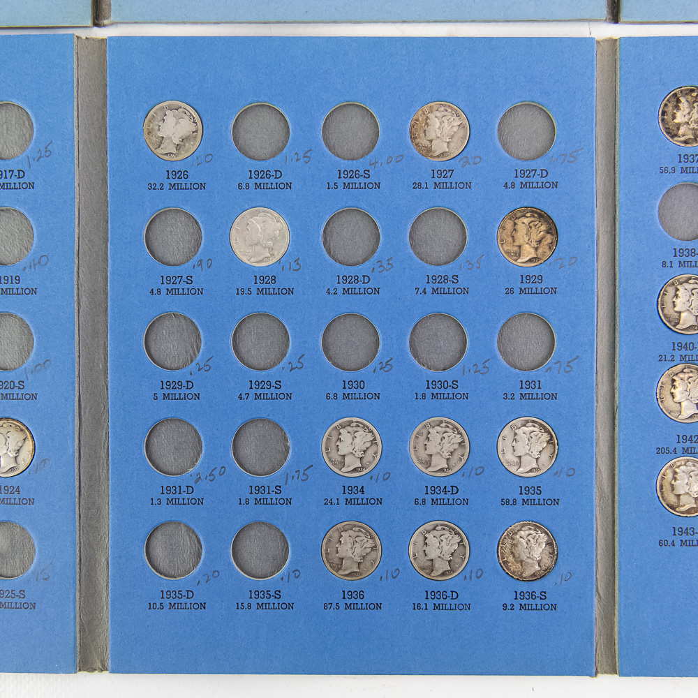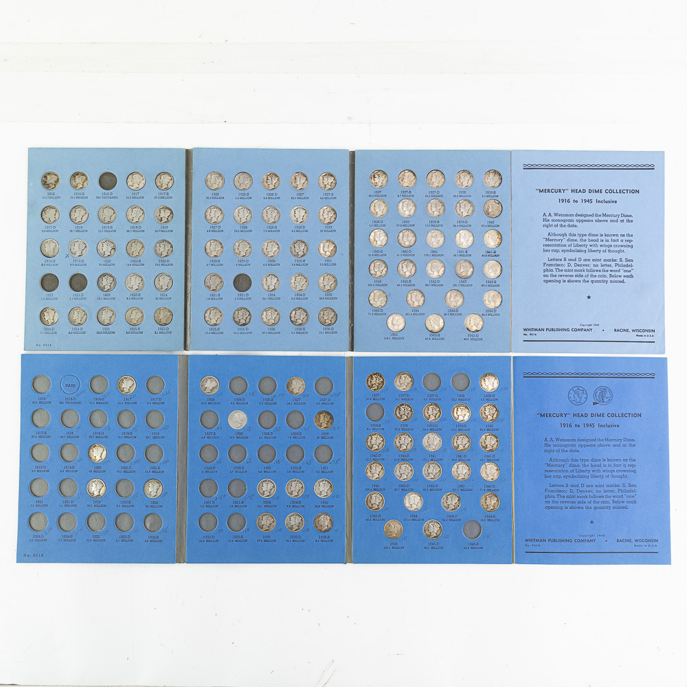 Collection features a pair of vintage Whitman “Mercury” Head silver dime collector albums; each partially completed. Album # 1 showcases a total of (37) 1916-1945 assorted silver dimes; Album #2 showcases (72) 1916-1945 assorted silver Mercury head dimes. Not many slots needed to fill to have two completed albums. (109) total silver dimes between both albums. Perfect addition to your collection, please use photos to judge condition and bid accordingly.