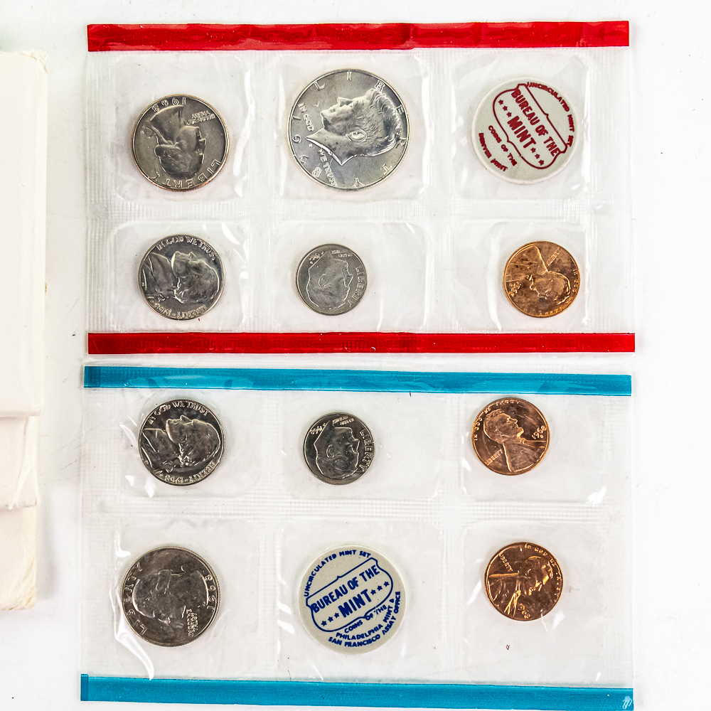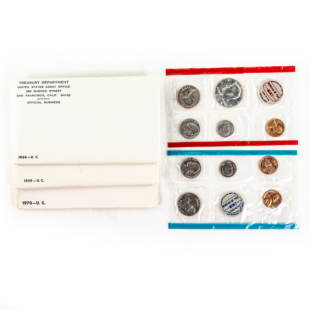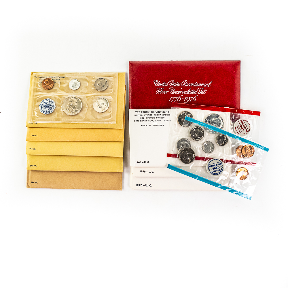 Collection includes (3)1961 P Silver Mint sets with envelopes; one still sealed; 1962 P Silver Mint Set sealed in envelope, 1963 P Silver Mint Set with opened envelope, 1968, 1969 &1970 US Mint P&D 40% Silver Uncirculated sets & 1976 Bicentennial 3 coin set. Perfect addition to your collection, please use photos to judge condition and bid accordingly.