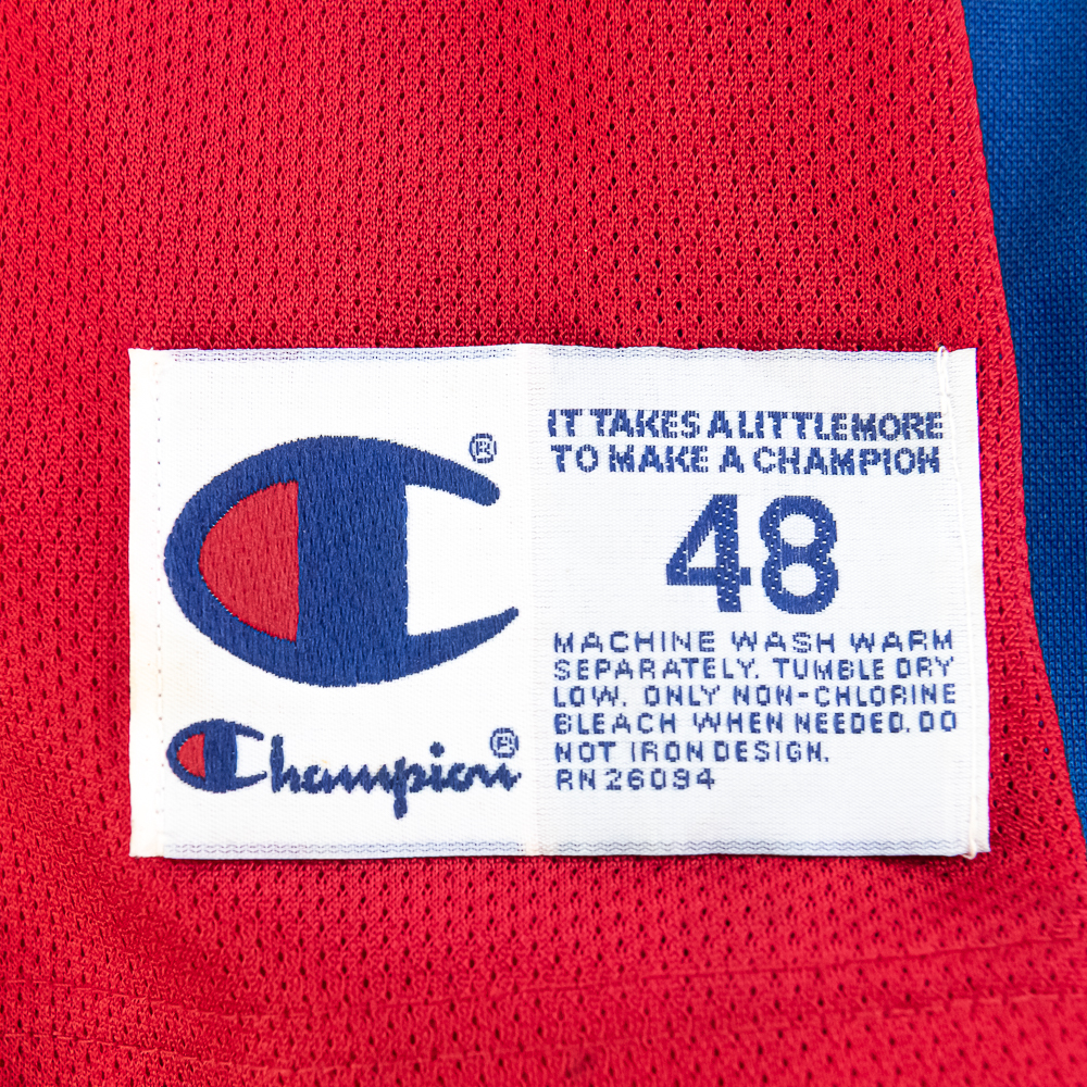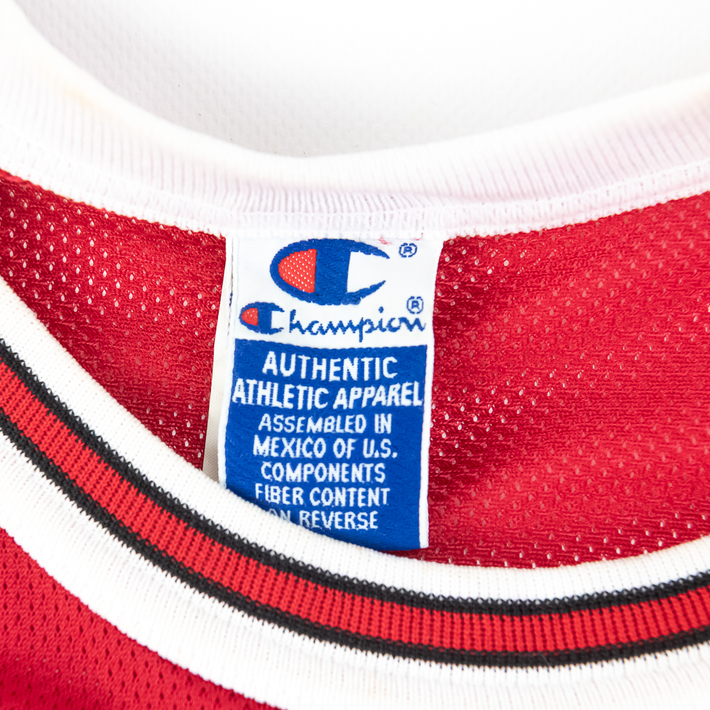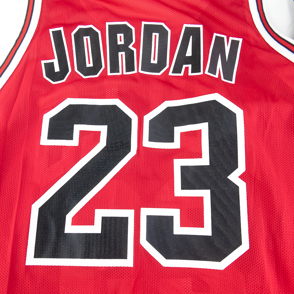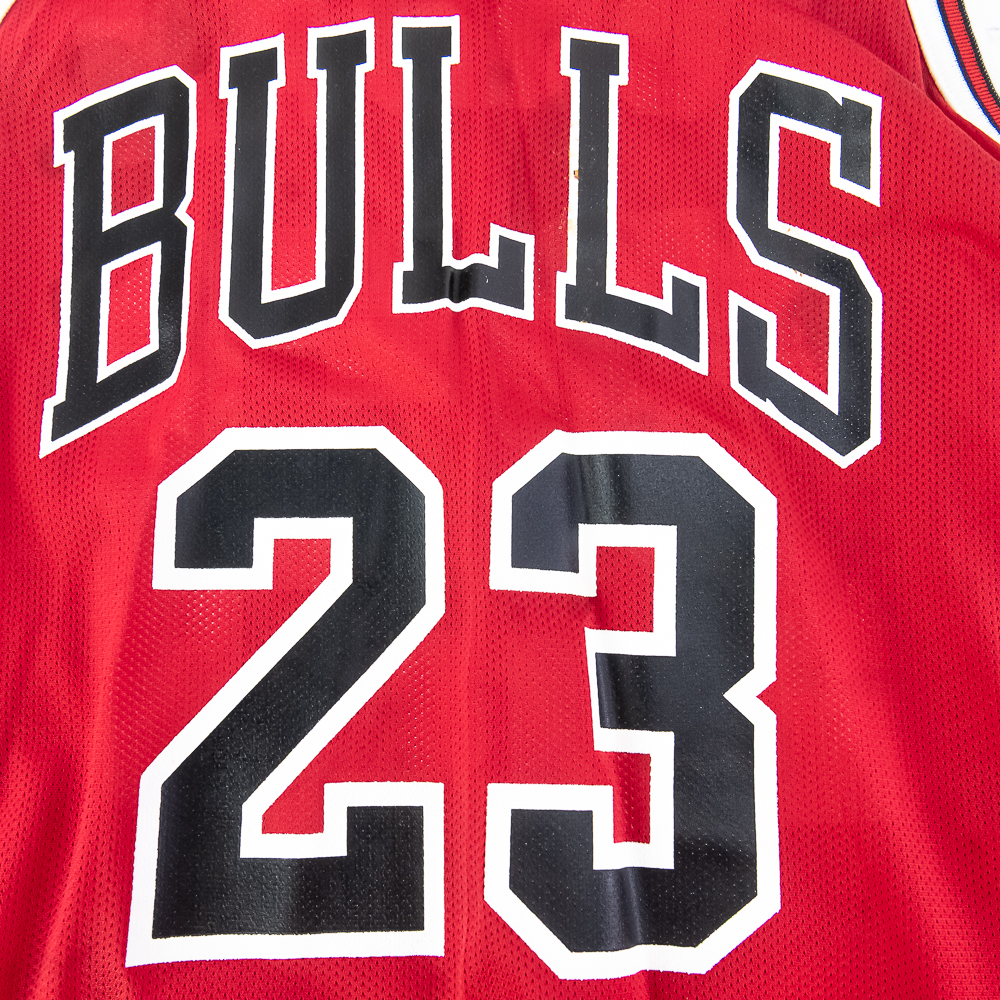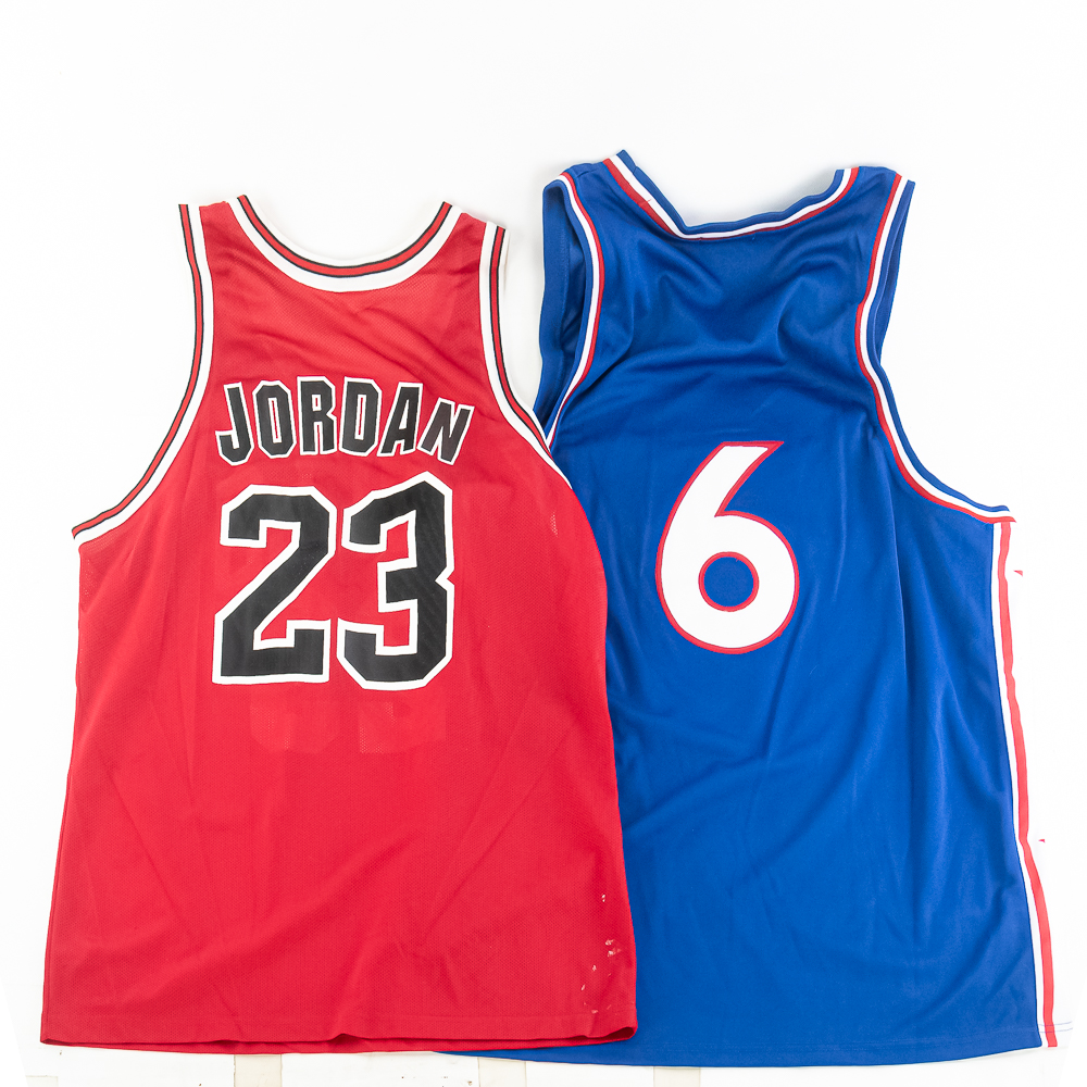 Vintage Michael Jordan Chicago Bulls Champion Jersey w logoman size 48 in very good overall condition AND 1982-1983 Mitchell & Ness Julius Erving throwback jersey in excellent overall condition size 3XL. Perfect additions to your lineup. Great gift idea; please use photos to judge condition and bid accordingly.