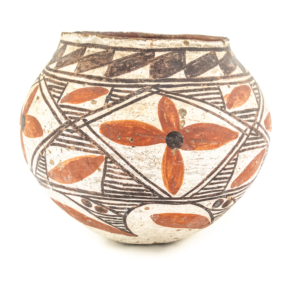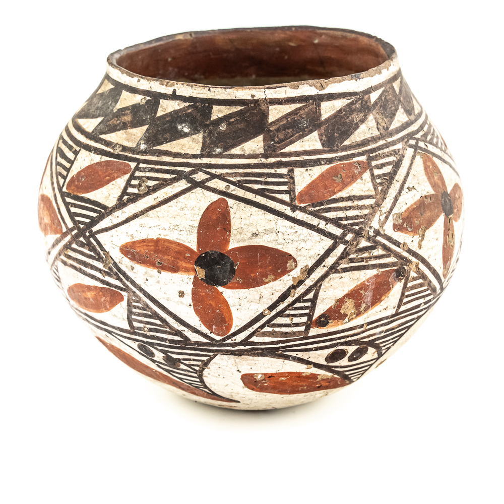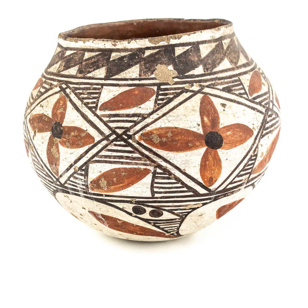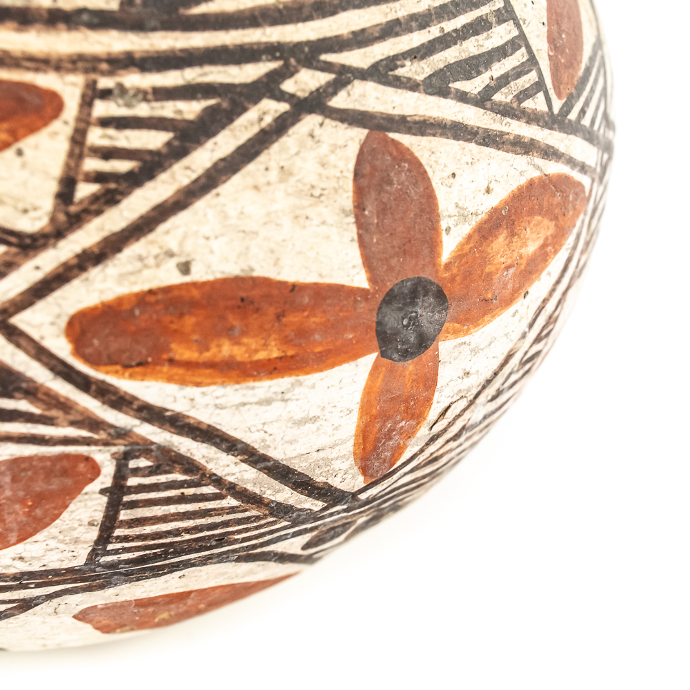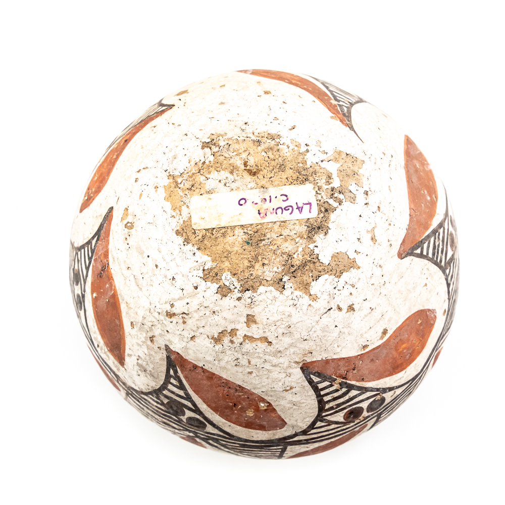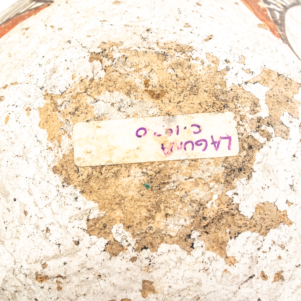 This black and red on white polychrome pot was made at Laguna Pueblo New Mexico and attributed to the 1920s. It features a mix of geometric lines as well as floral designs incorporated within. The surface of the pot exhibits A fair amount of spalling, consistent with age. The base of the pot has worn away and the underlying clay is visible. Label affixed to the base reads “Laguna C1920” Overall the pot is sound with no visible structural cracks. Dimensions: 7.25” at widest, 4.25” rim diameter, 6” tall, 2.5” diameter base. Please see photos.