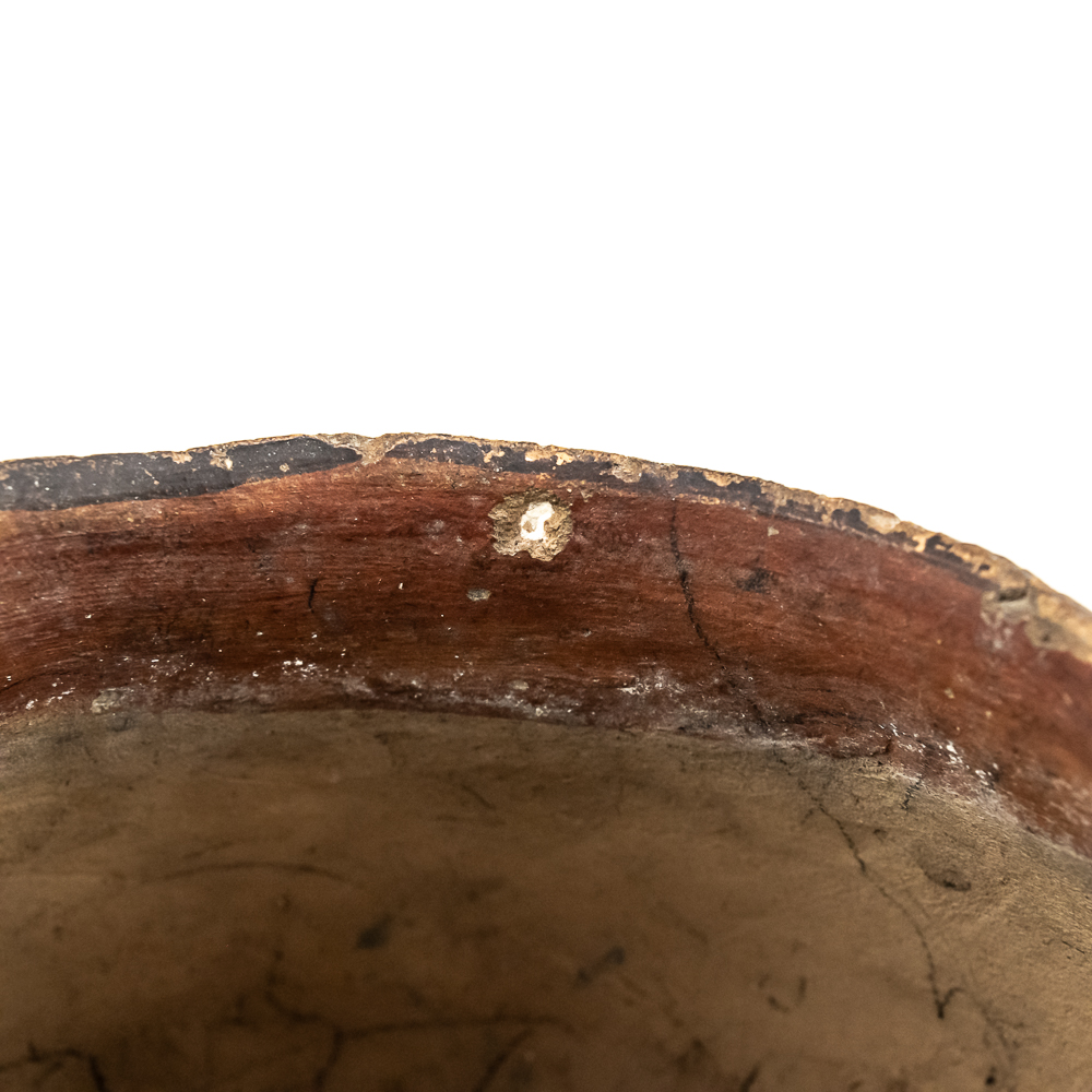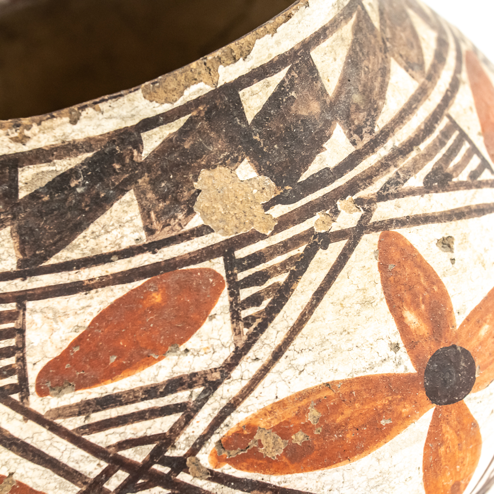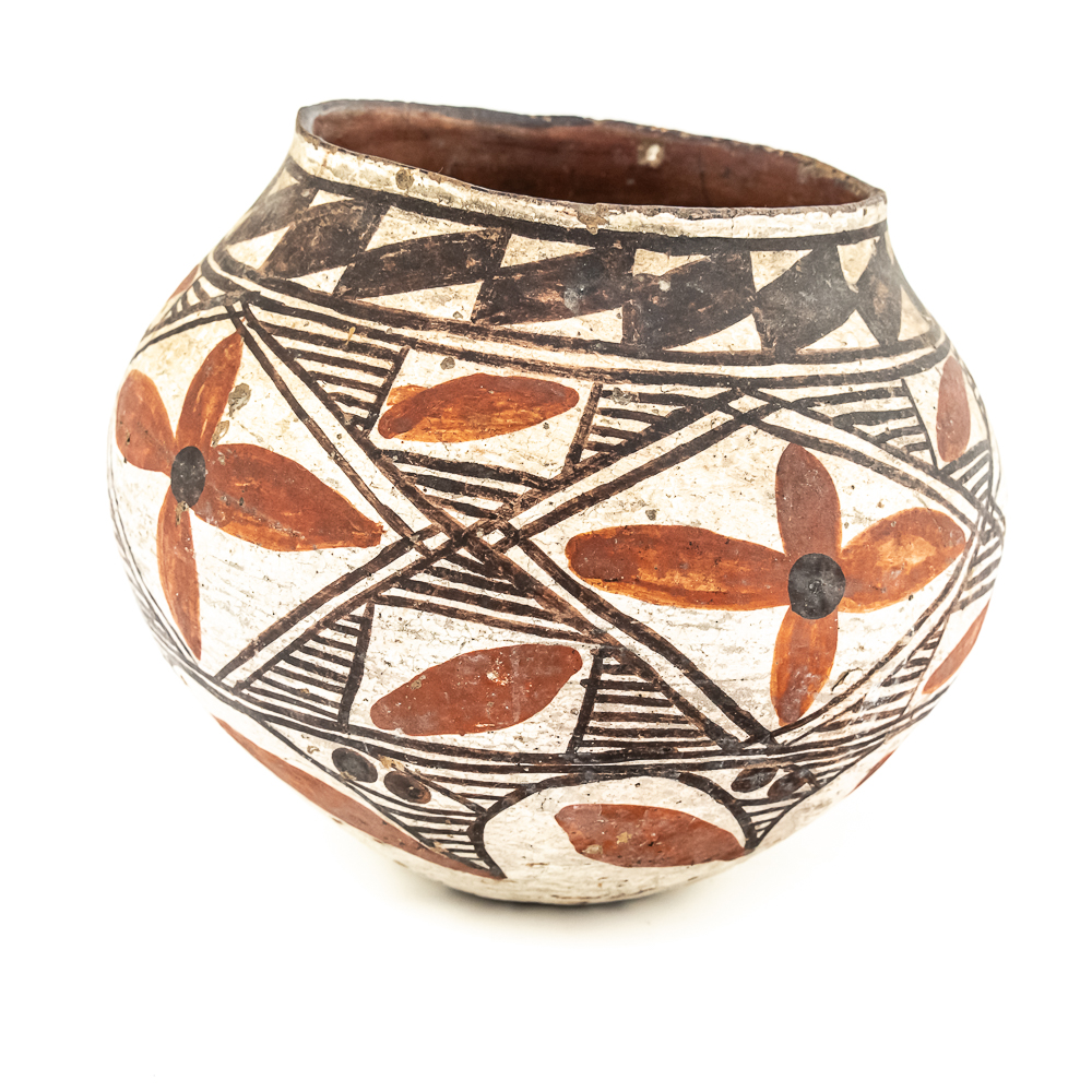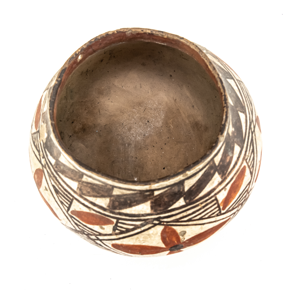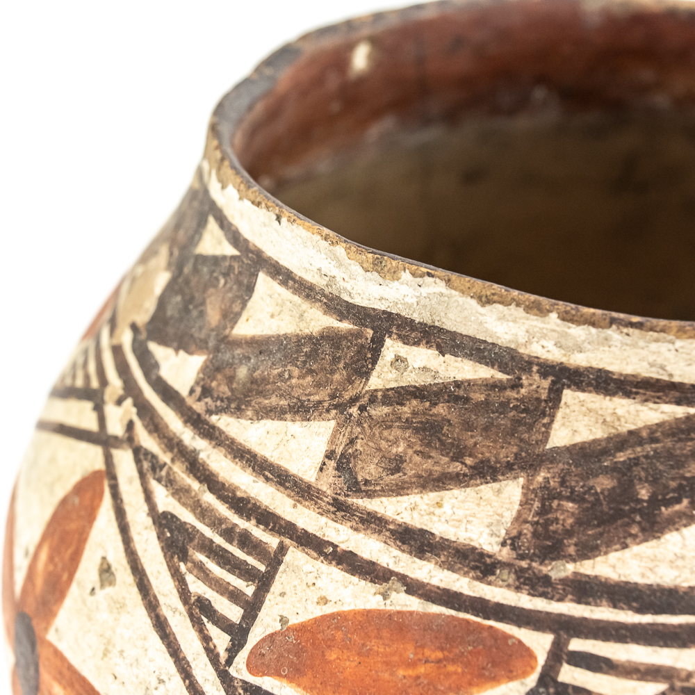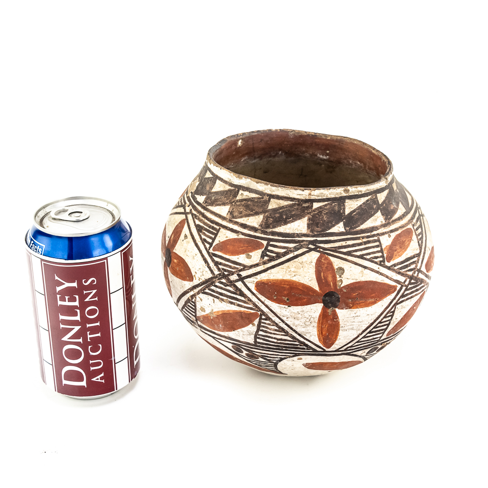 This black and red on white polychrome pot was made at Laguna Pueblo New Mexico and attributed to the 1920s. It features a mix of geometric lines as well as floral designs incorporated within. The surface of the pot exhibits A fair amount of spalling, consistent with age. The base of the pot has worn away and the underlying clay is visible. Label affixed to the base reads “Laguna C1920” Overall the pot is sound with no visible structural cracks. Dimensions: 7.25” at widest, 4.25” rim diameter, 6” tall, 2.5” diameter base. Please see photos.