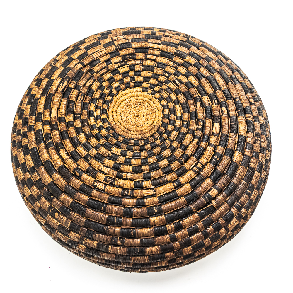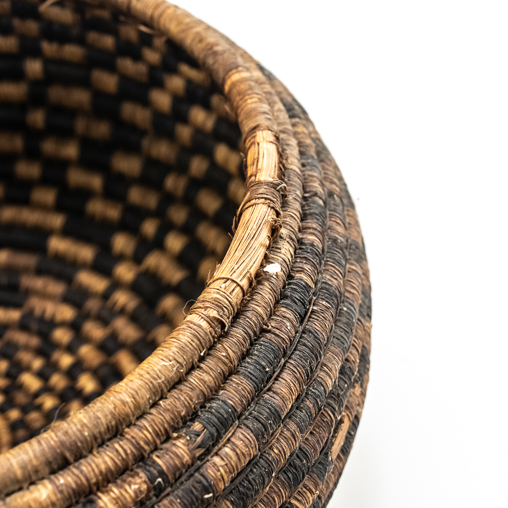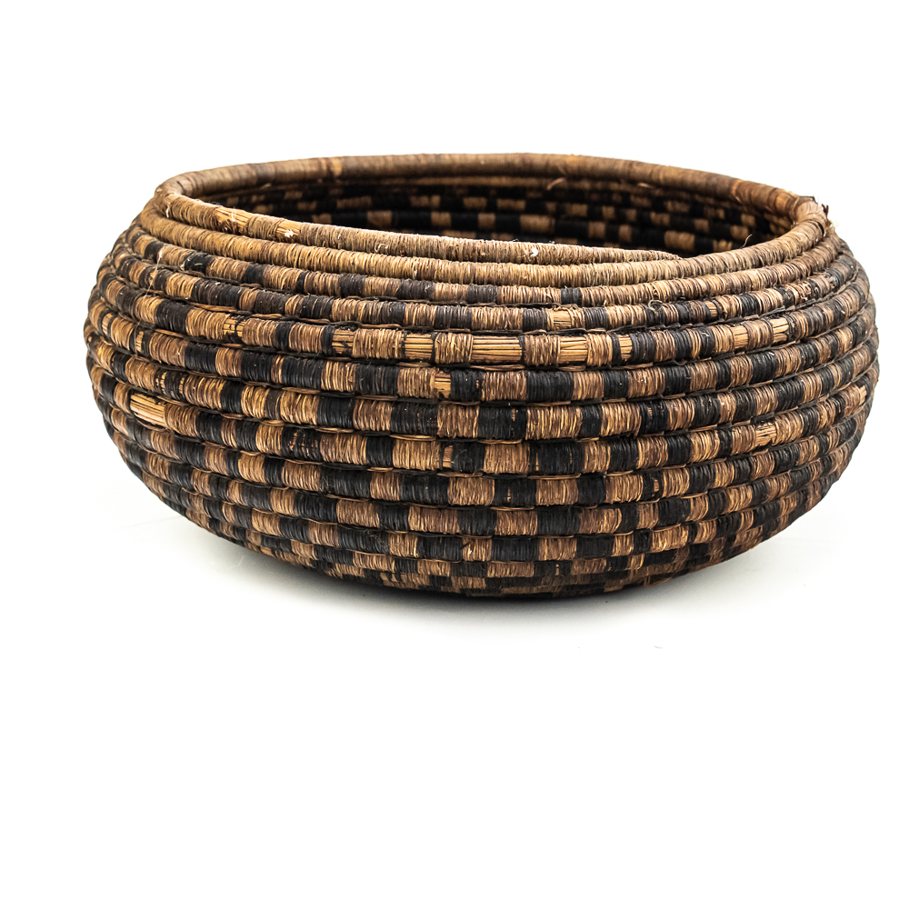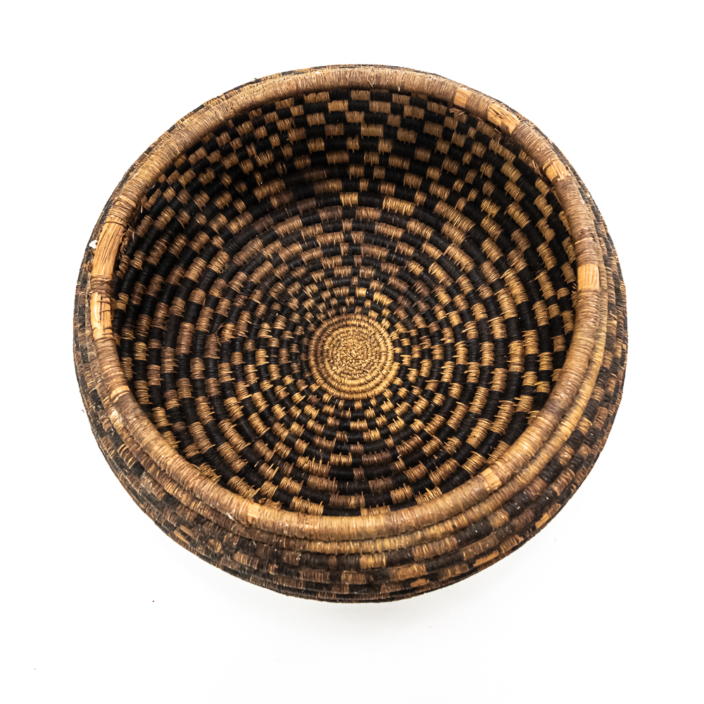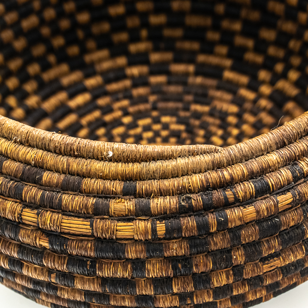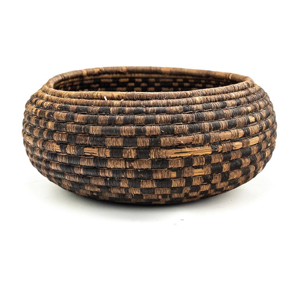 This basket is likely made by the Pomo peoples indigenous to Northern California. Their baskets are renowned for their intricate weaving techniques, diverse materials, and cultural significance. This basket was made using a coiling technique. Traditionally utilizing materials such as willow, sage, and red bud bark. The basket design is a geometric pattern possibly a variation of the “dau” or “spirit door”- a significant design element in Pomo basketry representing a place for ancestors to enter and teach the weaver. The pattern is created by alternating light and dark elements, showcasing the weaver’s skill and manipulating materials and colors. This is a stunning piece when you really focus in on the details. Due to its age it, it suffers some loss of material. However this adds to the character of the piece. Dimensions: 9” at widest x 4.25” tall. Rim opening 6.75” x base approximately 4” diameter. Please see photos.