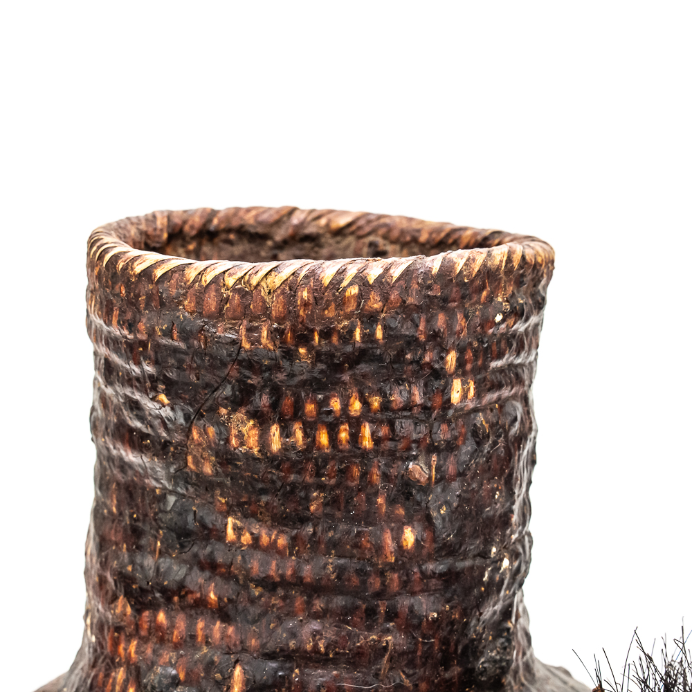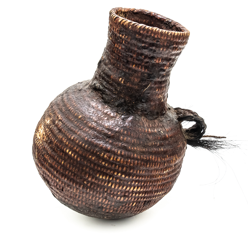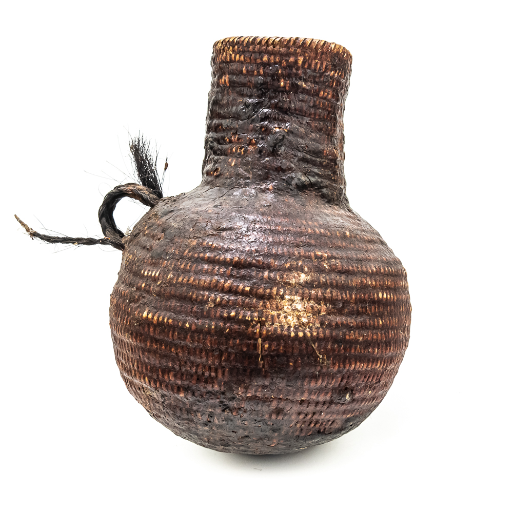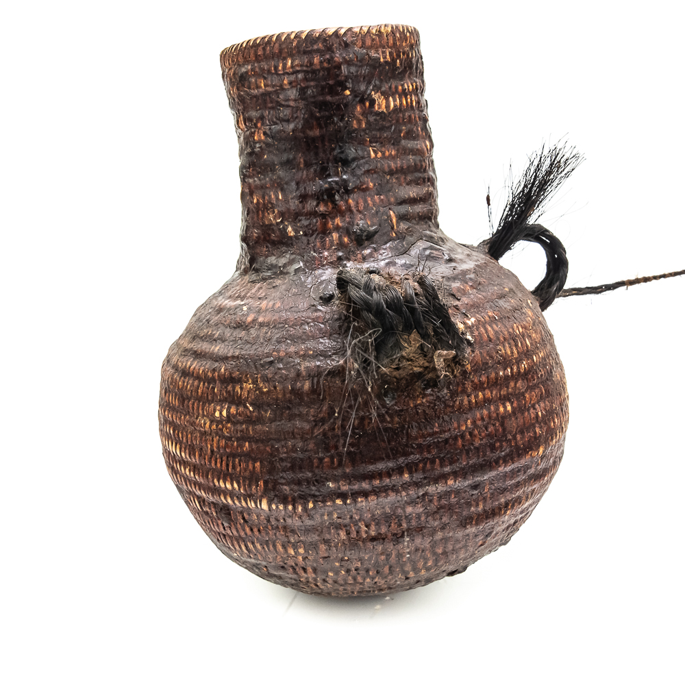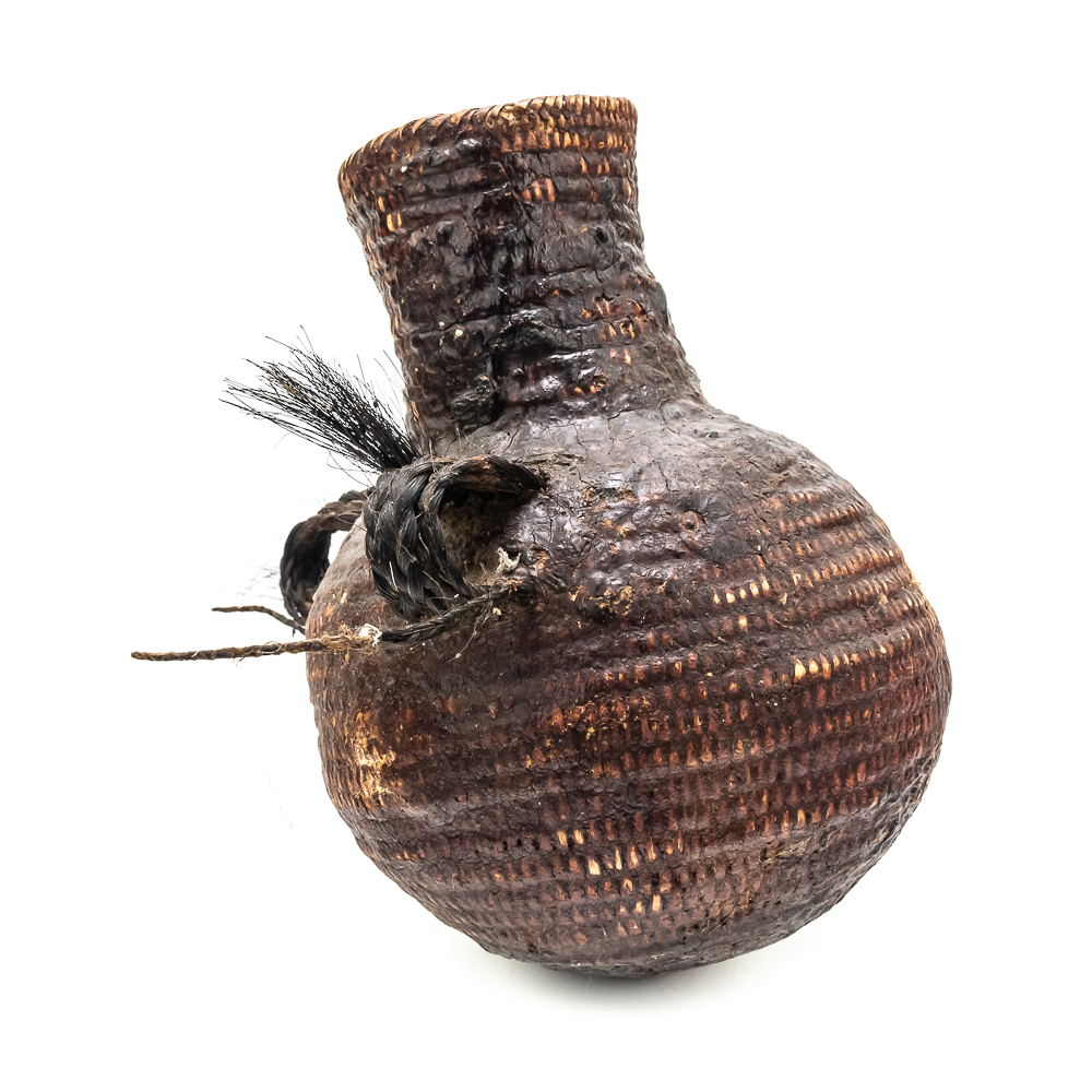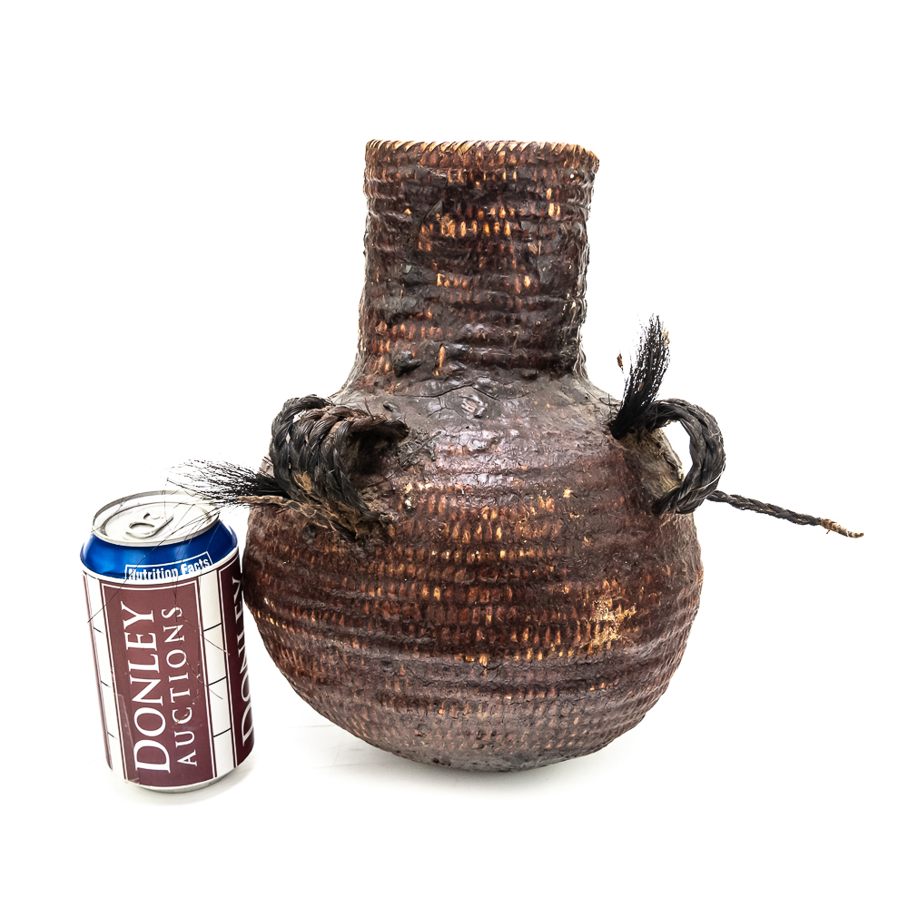 This circa 1920s Apache Tus water vessel showcases the ingenuity and craftsmanship of the Apache people. Featuring a bulbous base and narrow neck it is constructed using a coiled basketry technique and coated with a pine pitch On the interior and exterior for waterproofing. The two handles are braided horsehair, traditionally used on these types of vessels. The overall condition of the object is good and the pine pitch coating is stable. Dimensions: 11” tall x 8.25” diameter at waist x 3.75” diameter mouth. See photos.