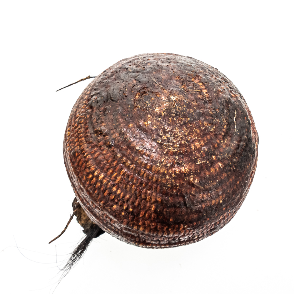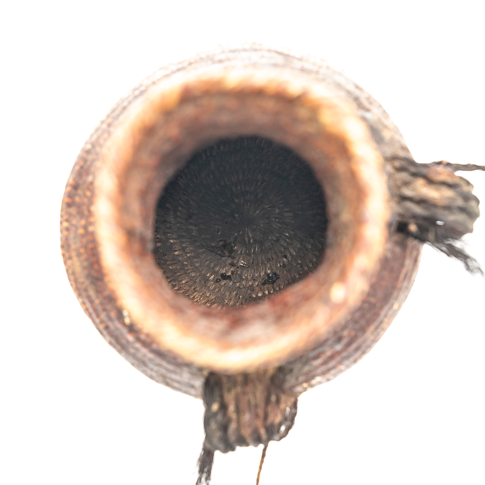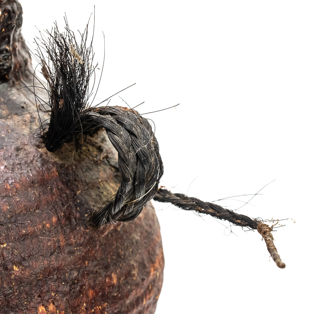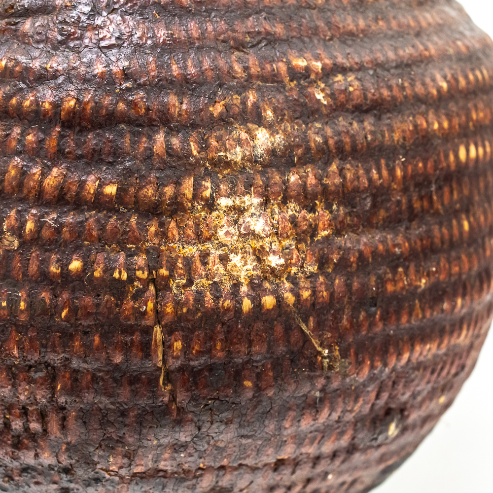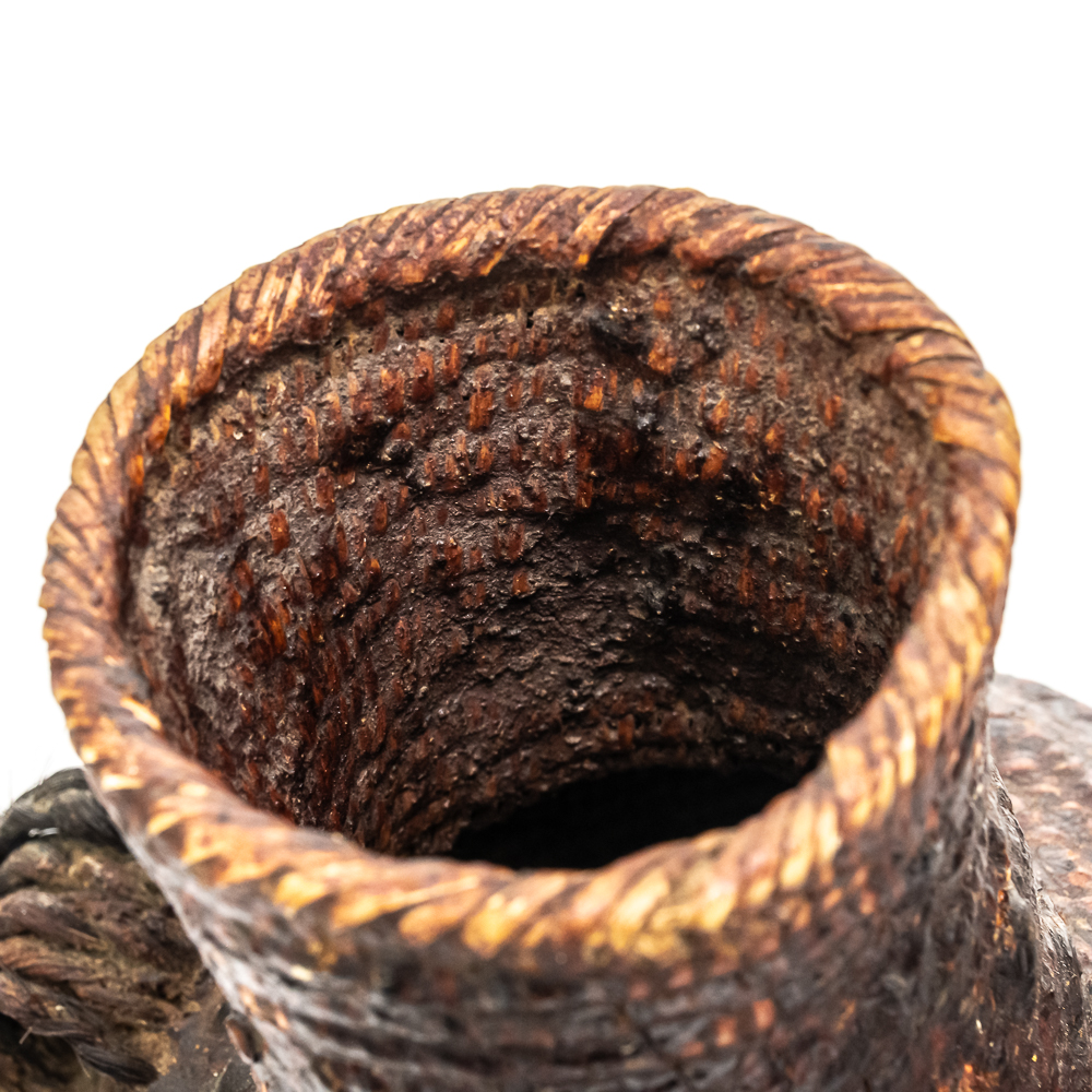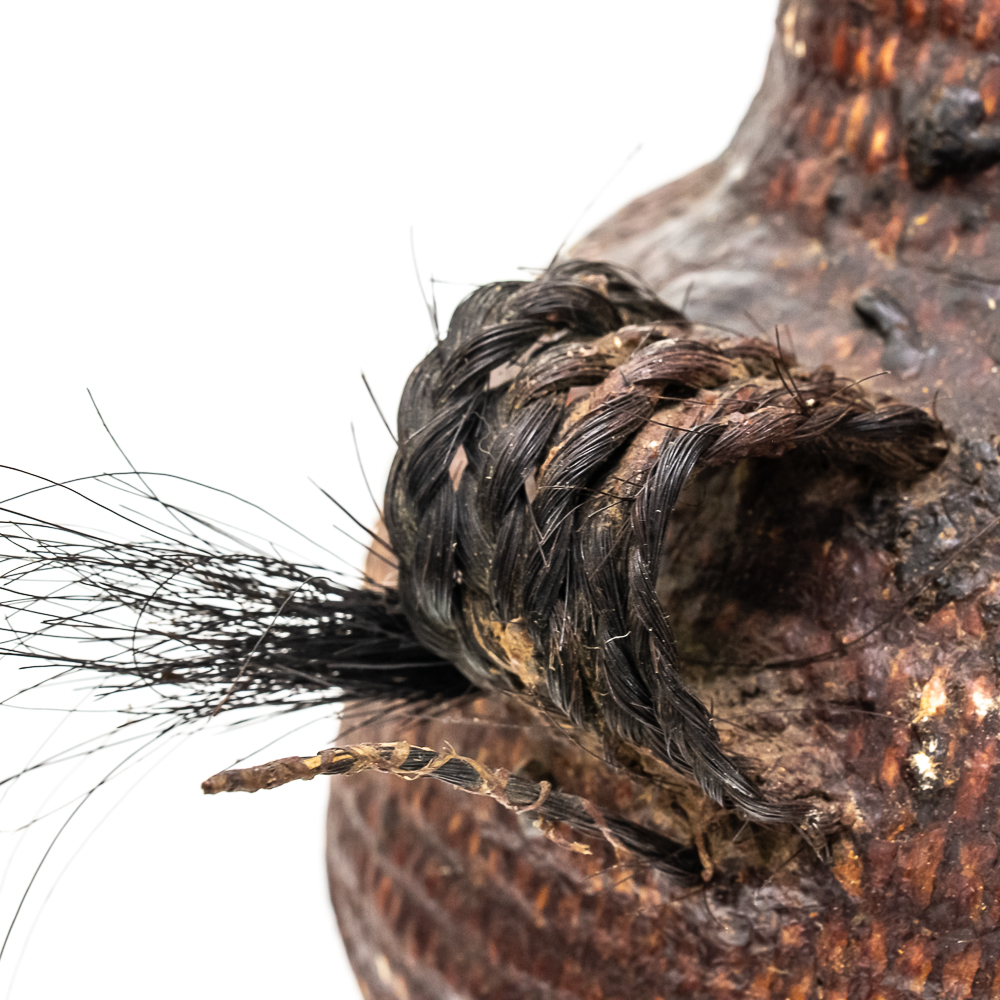 This circa 1920s Apache Tus water vessel showcases the ingenuity and craftsmanship of the Apache people. Featuring a bulbous base and narrow neck it is constructed using a coiled basketry technique and coated with a pine pitch On the interior and exterior for waterproofing. The two handles are braided horsehair, traditionally used on these types of vessels. The overall condition of the object is good and the pine pitch coating is stable. Dimensions: 11” tall x 8.25” diameter at waist x 3.75” diameter mouth. See photos.