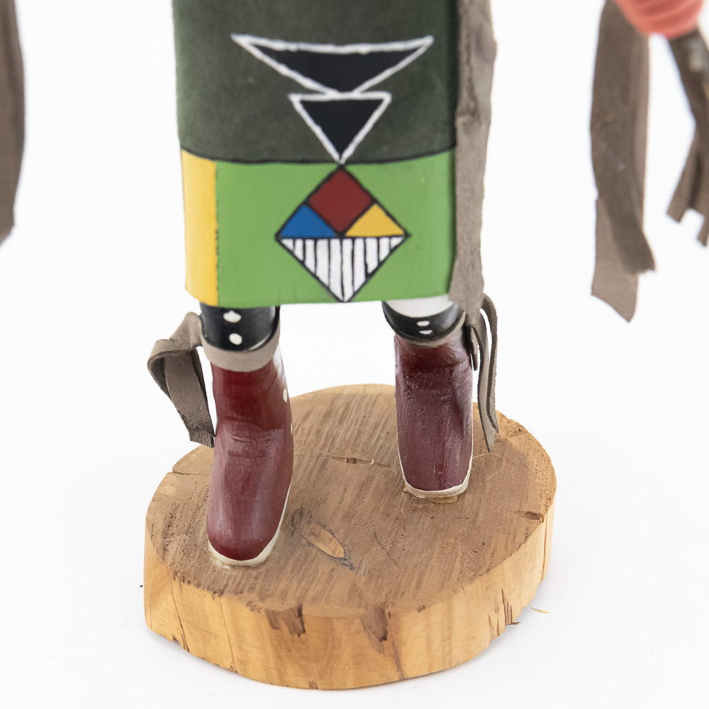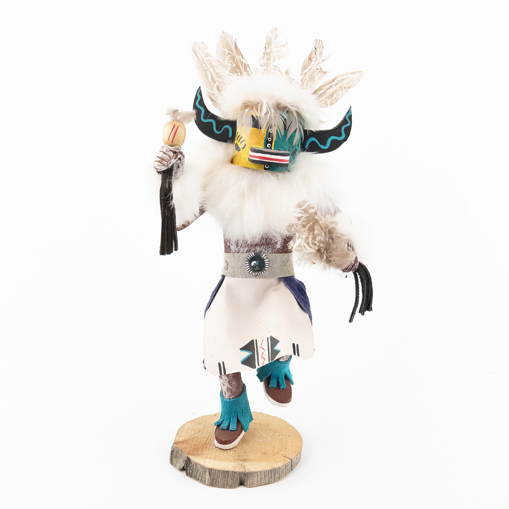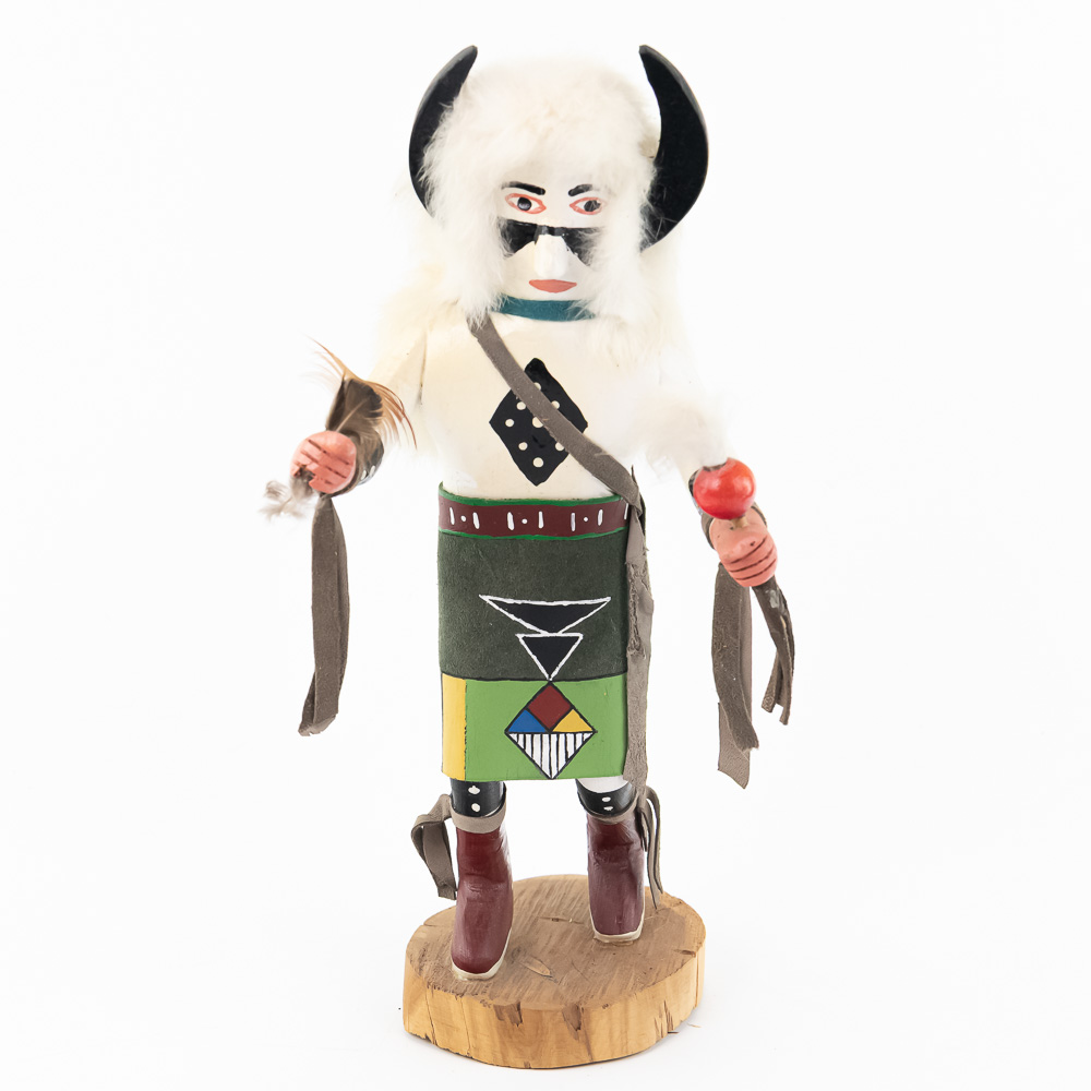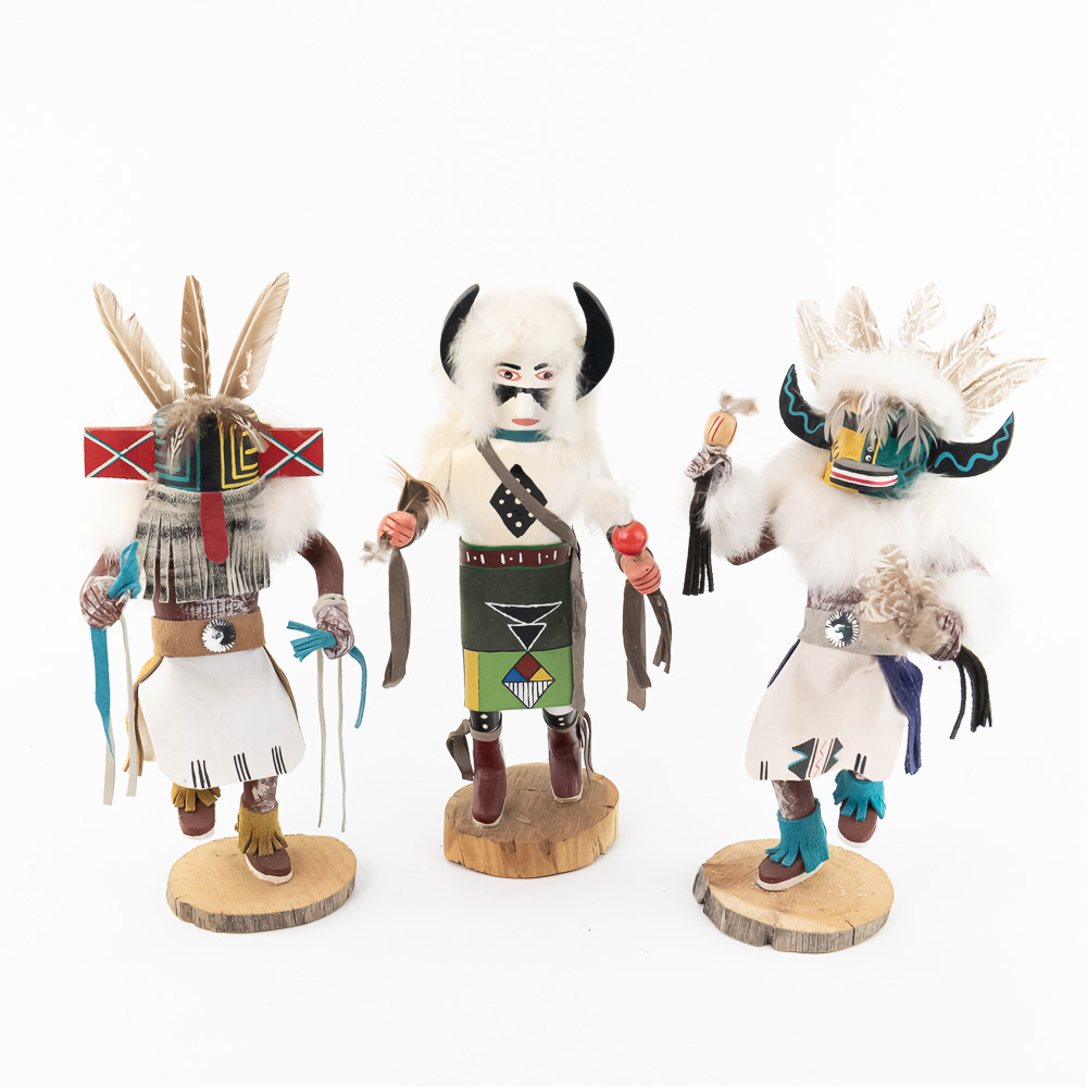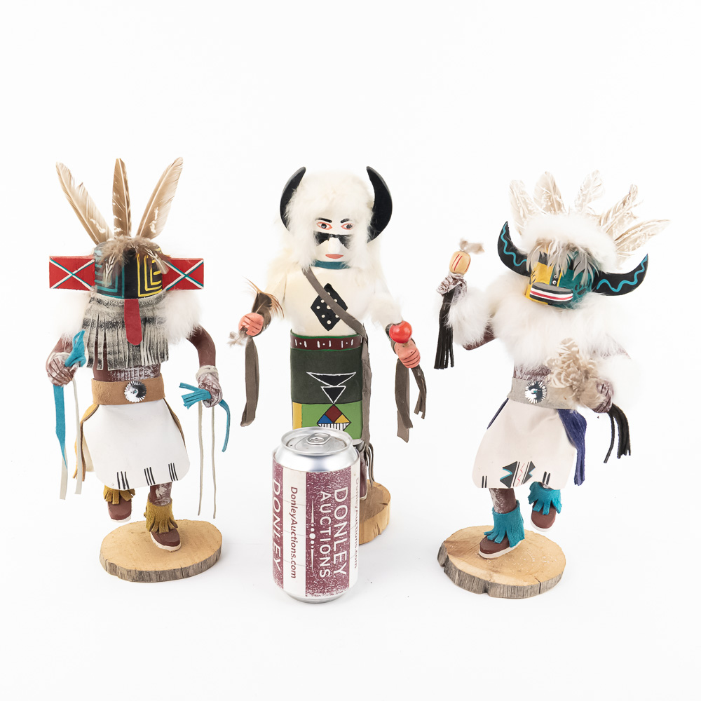 An excellent grouping of three contemporary Hopi Kachina dolls (or Katsina dolls), each hand-carved, painted, and decorated with natural materials such as fur, feathers, and leather/suede accents. The figures are mounted on round, natural-cut wooden bases. The underside of each base is marked, identifying the figures from left to right as “Buffalo,” “Hototo Kachina,” and “HILILI KACHINA” (or possibly HILIUT YACHINA/KACHINA, the script is slightly ambiguous, but HILILI is more common). Each base is also signed “L. Ramoos” (or similar, possibly L. Ramos), indicating they were created by the same artist. These are detailed and vibrant examples of this significant Native American art form, representing the spiritual beings of the Hopi people. Overall, the condition appears Very Good; the dolls show minor shelf wear and slight movement or shedding of the natural fiber decorations, consistent with age and display, but no major chips, cracks, or paint loss are visible. H 13″, W 5″, D 5″. From the Native American display in Donley’s Wild West Town.