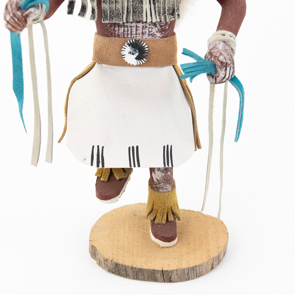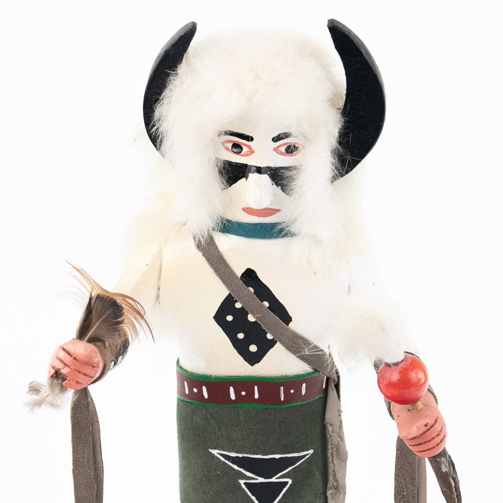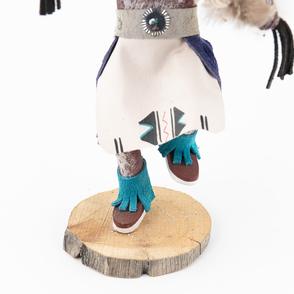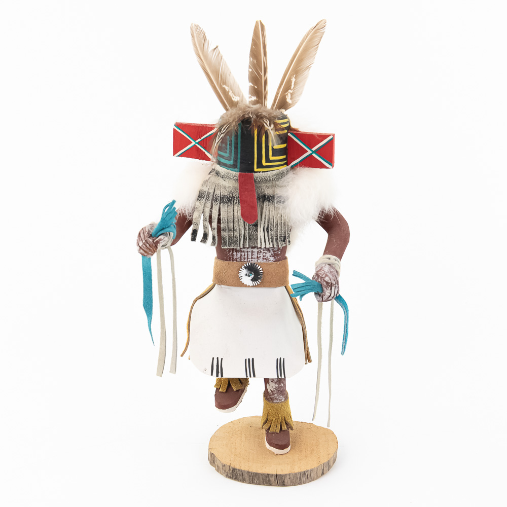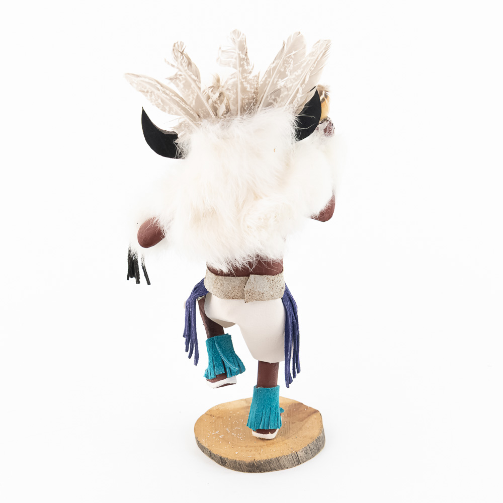 An excellent grouping of three contemporary Hopi Kachina dolls (or Katsina dolls), each hand-carved, painted, and decorated with natural materials such as fur, feathers, and leather/suede accents. The figures are mounted on round, natural-cut wooden bases. The underside of each base is marked, identifying the figures from left to right as “Buffalo,” “Hototo Kachina,” and “HILILI KACHINA” (or possibly HILIUT YACHINA/KACHINA, the script is slightly ambiguous, but HILILI is more common). Each base is also signed “L. Ramoos” (or similar, possibly L. Ramos), indicating they were created by the same artist. These are detailed and vibrant examples of this significant Native American art form, representing the spiritual beings of the Hopi people. Overall, the condition appears Very Good; the dolls show minor shelf wear and slight movement or shedding of the natural fiber decorations, consistent with age and display, but no major chips, cracks, or paint loss are visible. H 13″, W 5″, D 5″. From the Native American display in Donley’s Wild West Town.