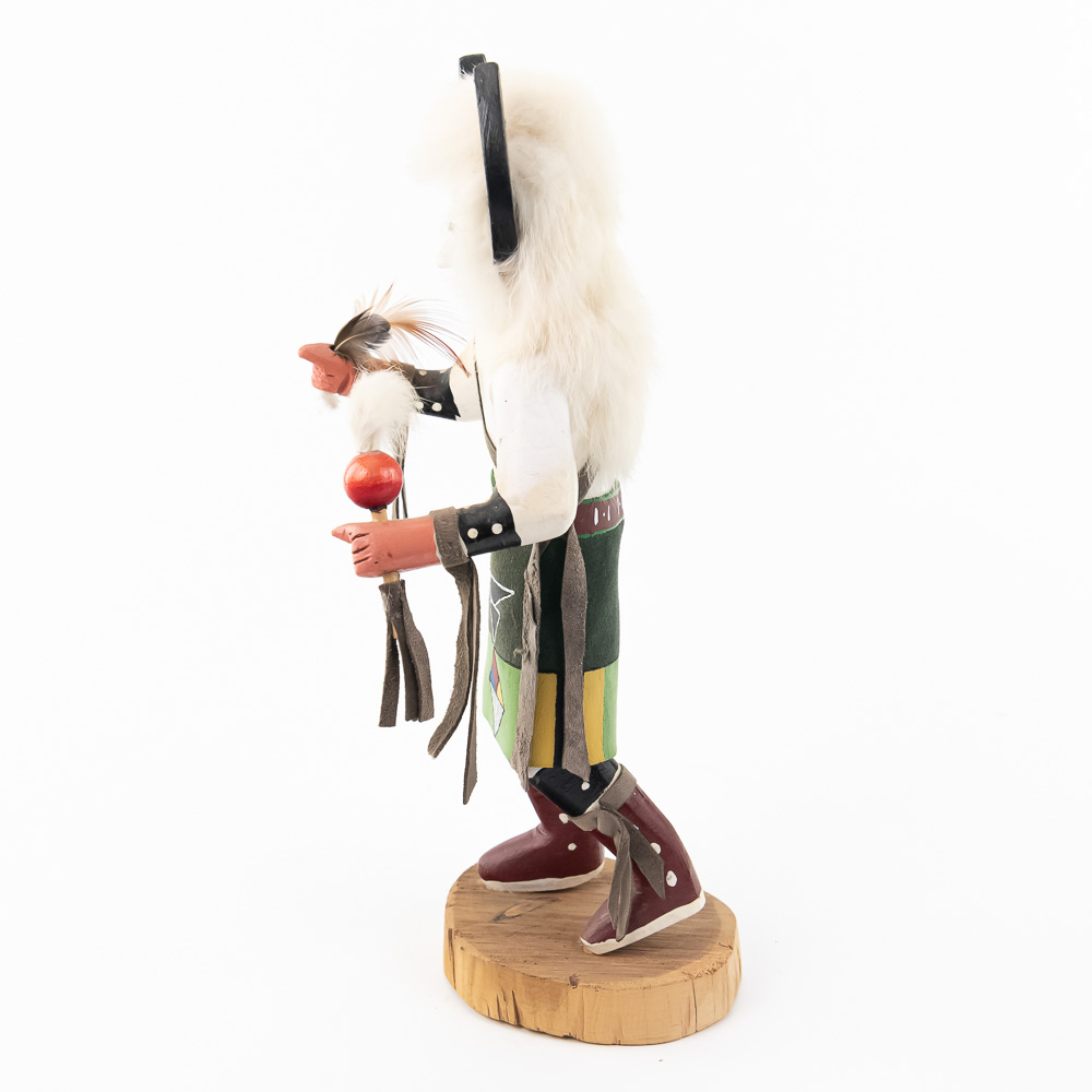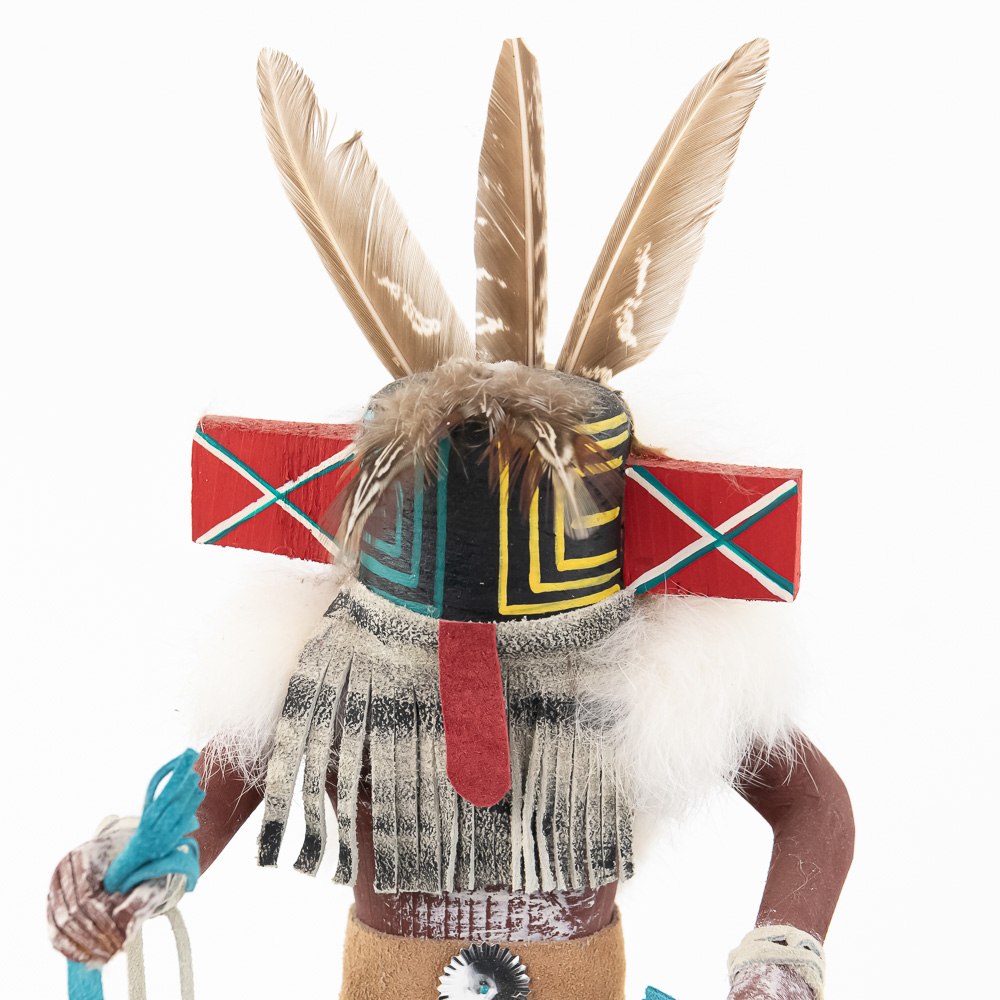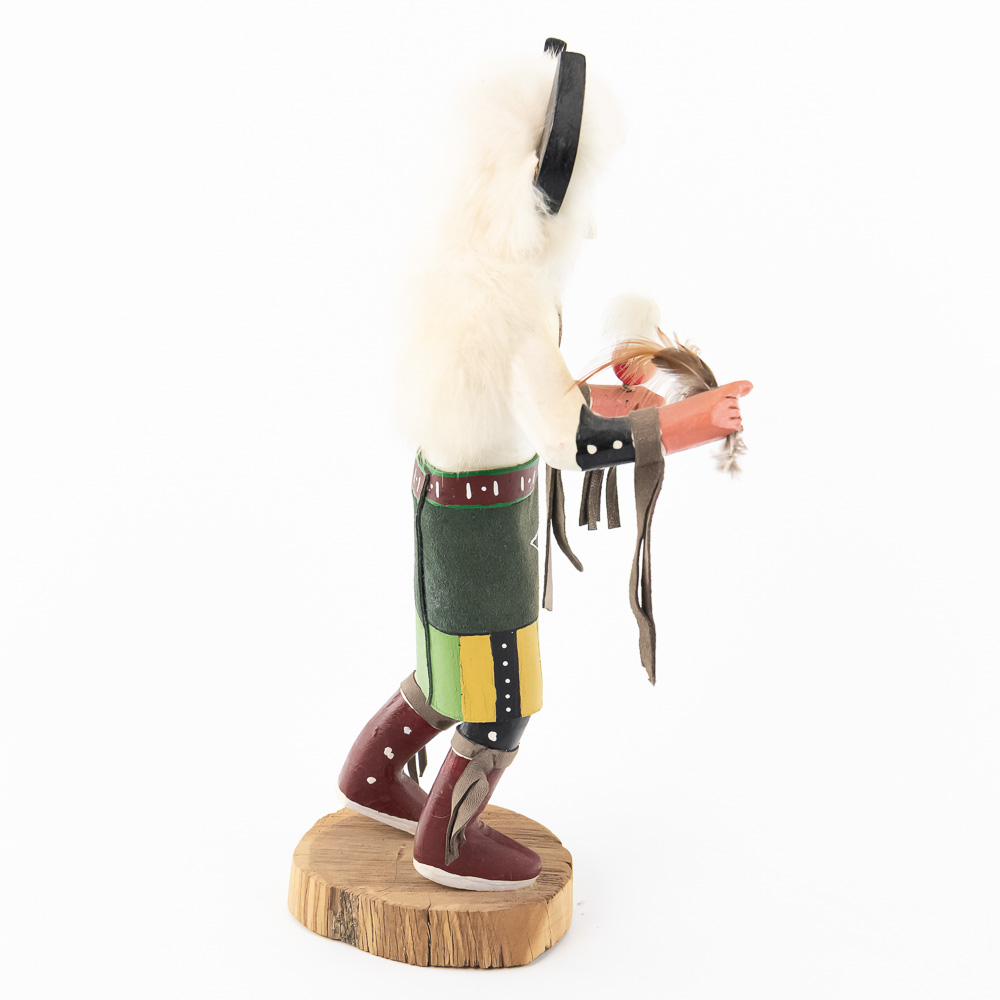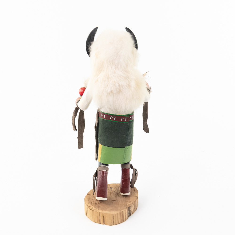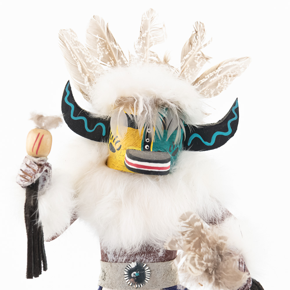 An excellent grouping of three contemporary Hopi Kachina dolls (or Katsina dolls), each hand-carved, painted, and decorated with natural materials such as fur, feathers, and leather/suede accents. The figures are mounted on round, natural-cut wooden bases. The underside of each base is marked, identifying the figures from left to right as “Buffalo,” “Hototo Kachina,” and “HILILI KACHINA” (or possibly HILIUT YACHINA/KACHINA, the script is slightly ambiguous, but HILILI is more common). Each base is also signed “L. Ramoos” (or similar, possibly L. Ramos), indicating they were created by the same artist. These are detailed and vibrant examples of this significant Native American art form, representing the spiritual beings of the Hopi people. Overall, the condition appears Very Good; the dolls show minor shelf wear and slight movement or shedding of the natural fiber decorations, consistent with age and display, but no major chips, cracks, or paint loss are visible. H 13″, W 5″, D 5″. From the Native American display in Donley’s Wild West Town.