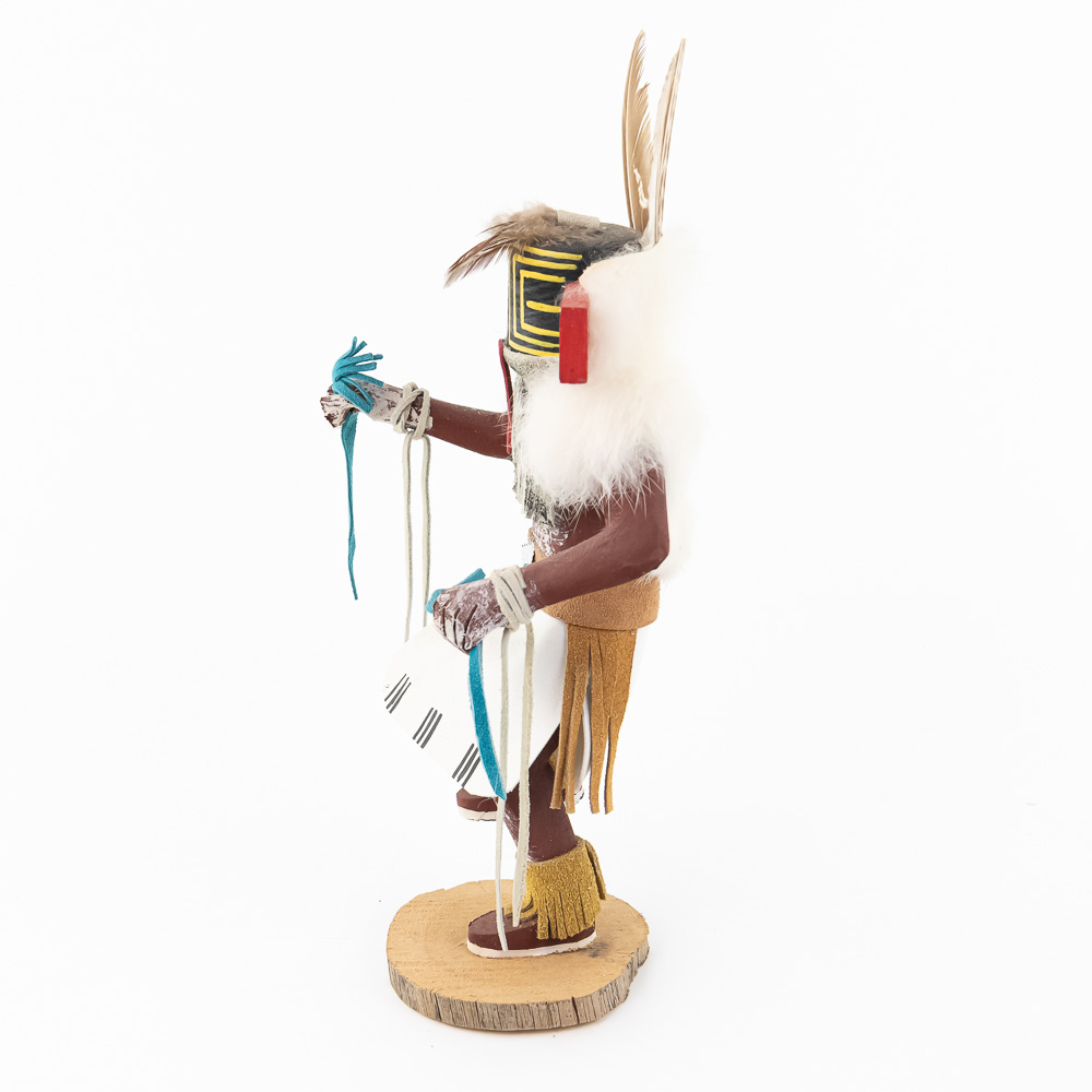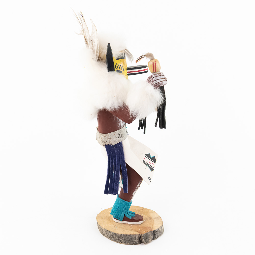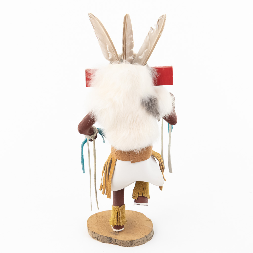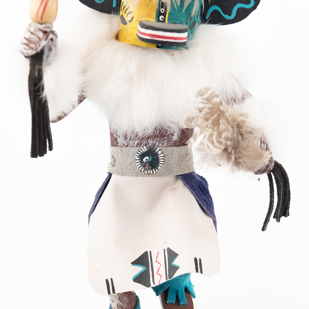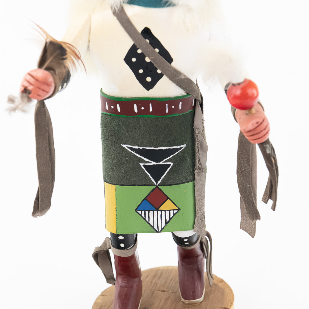 An excellent grouping of three contemporary Hopi Kachina dolls (or Katsina dolls), each hand-carved, painted, and decorated with natural materials such as fur, feathers, and leather/suede accents. The figures are mounted on round, natural-cut wooden bases. The underside of each base is marked, identifying the figures from left to right as “Buffalo,” “Hototo Kachina,” and “HILILI KACHINA” (or possibly HILIUT YACHINA/KACHINA, the script is slightly ambiguous, but HILILI is more common). Each base is also signed “L. Ramoos” (or similar, possibly L. Ramos), indicating they were created by the same artist. These are detailed and vibrant examples of this significant Native American art form, representing the spiritual beings of the Hopi people. Overall, the condition appears Very Good; the dolls show minor shelf wear and slight movement or shedding of the natural fiber decorations, consistent with age and display, but no major chips, cracks, or paint loss are visible. H 13″, W 5″, D 5″. From the Native American display in Donley’s Wild West Town.