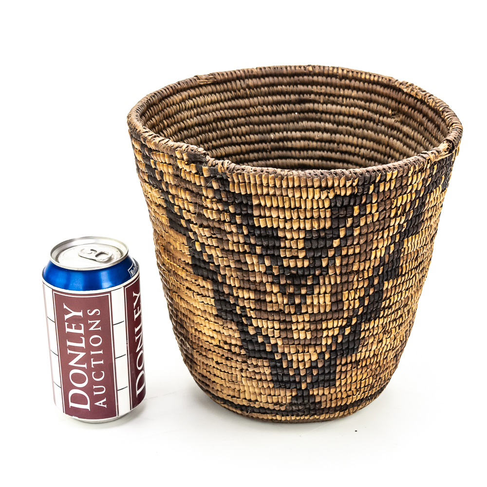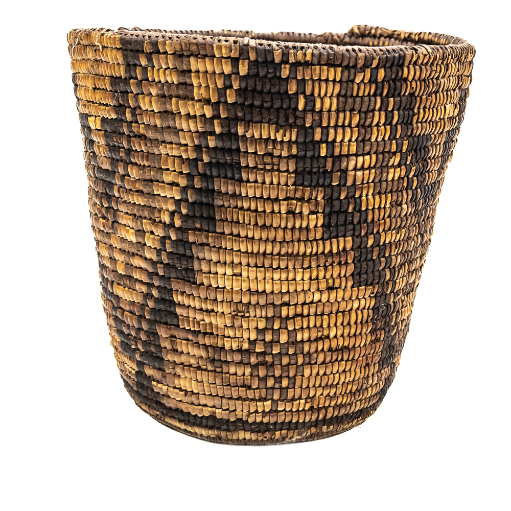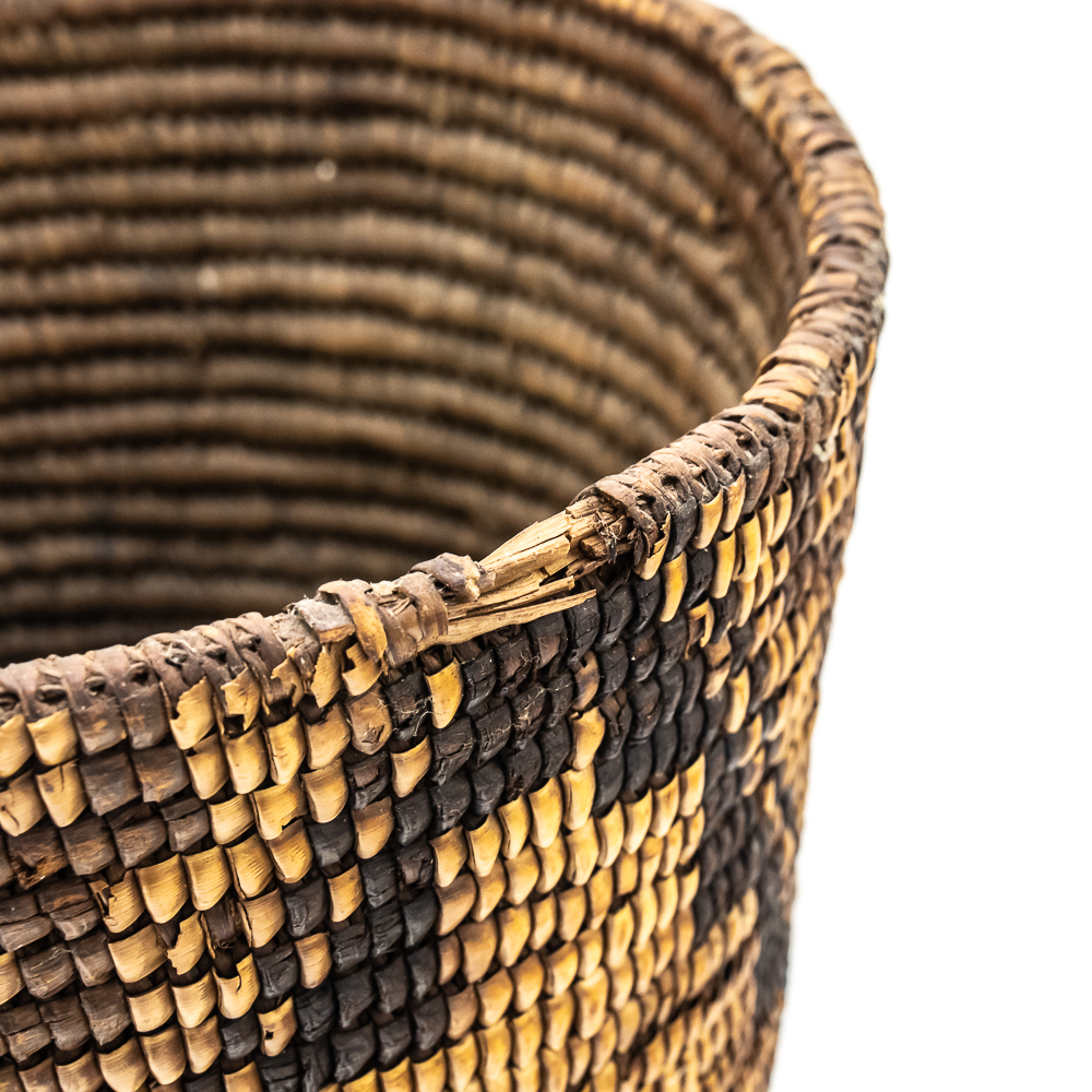 Rigid hand coiled cylindrical Salish basket circa 1940s. It’s constructed from natural materials of a rigid nature. It features a geometric design created through imbrication of inverted triangles around the entire exterior wall of the basket. There is no decoration on the interior of the basket. There is some damage 2 the ram which is minimal. Dimensions: 8.75“ rim diameter x8.5” tall. Flat base diameter approximately 5”. See photos.