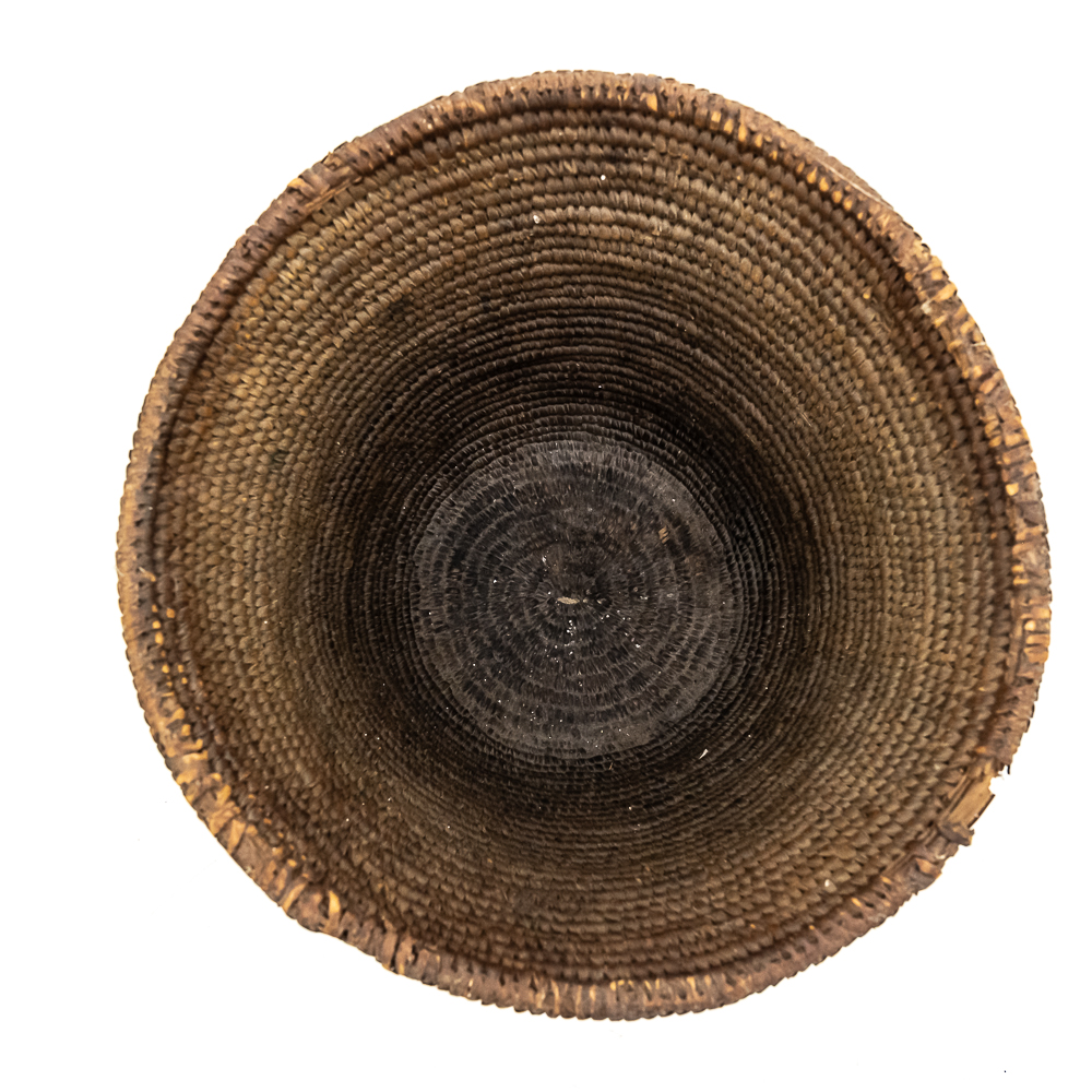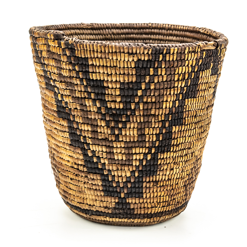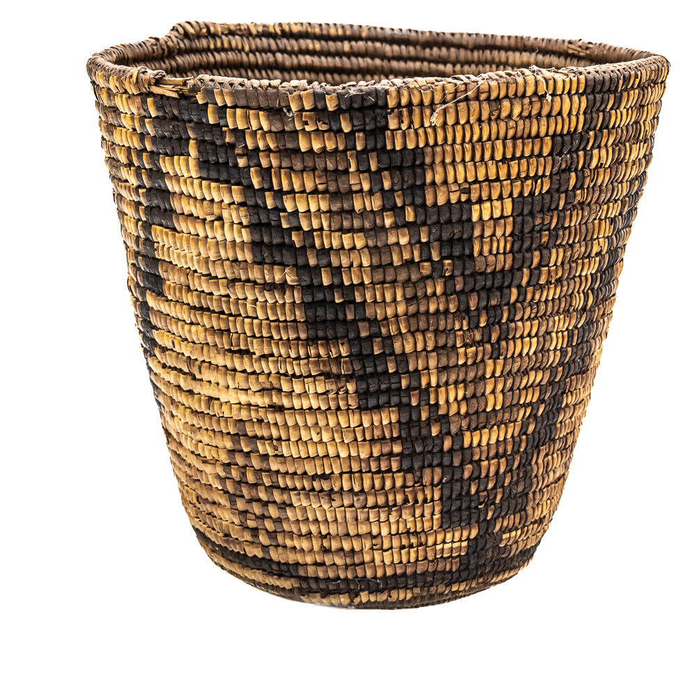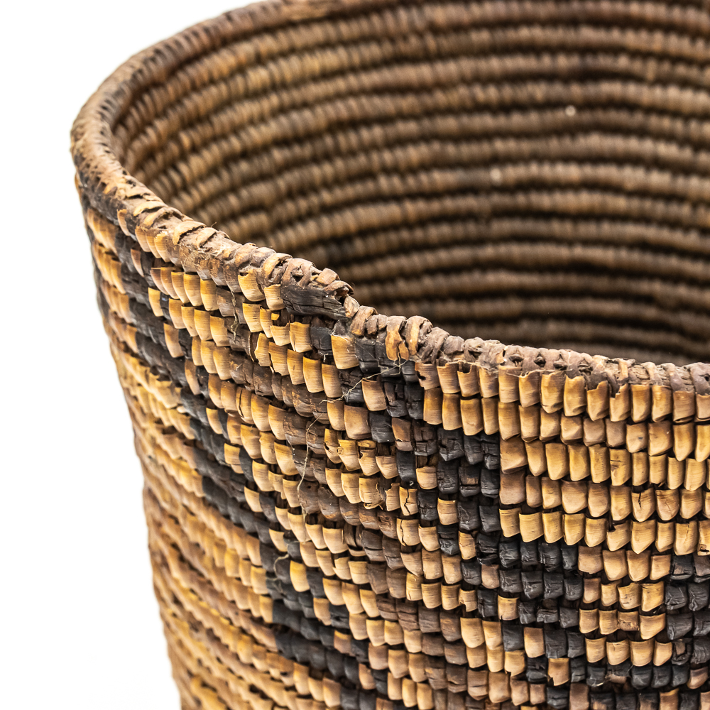 Rigid hand coiled cylindrical Salish basket circa 1940s. It’s constructed from natural materials of a rigid nature. It features a geometric design created through imbrication of inverted triangles around the entire exterior wall of the basket. There is no decoration on the interior of the basket. There is some damage 2 the ram which is minimal. Dimensions: 8.75“ rim diameter x8.5” tall. Flat base diameter approximately 5”. See photos.