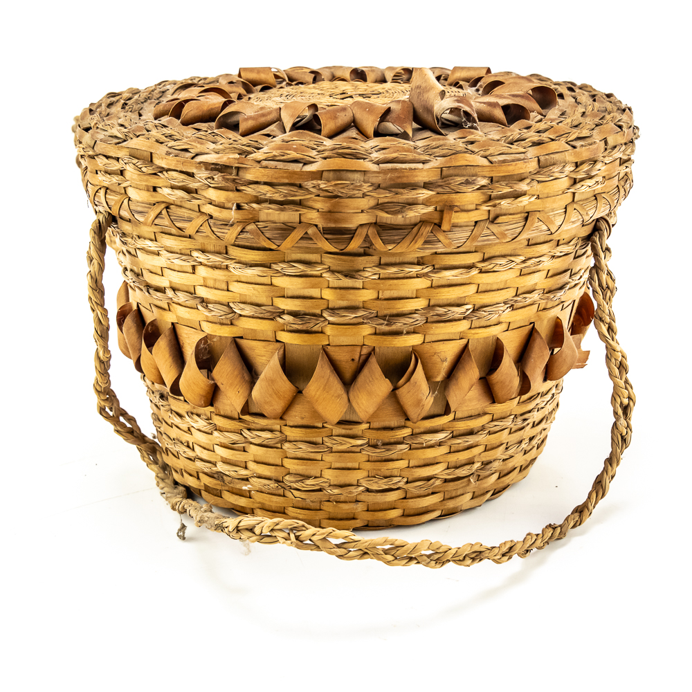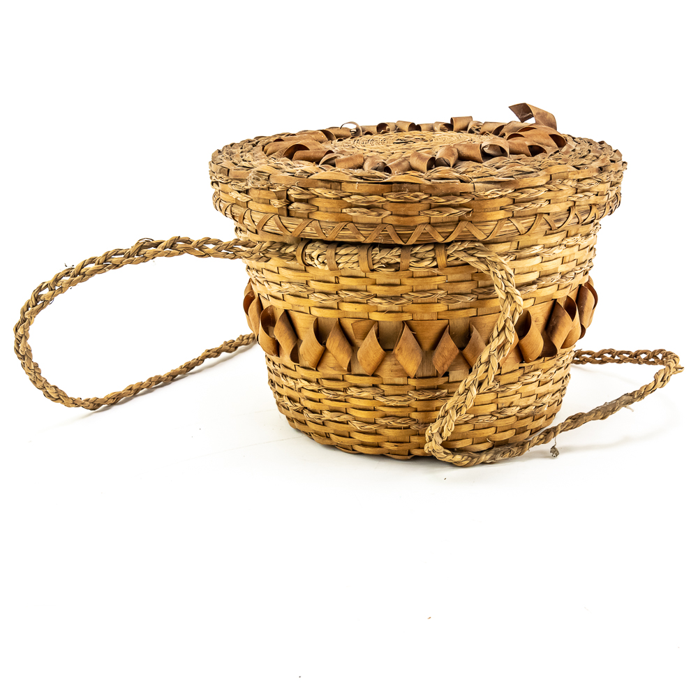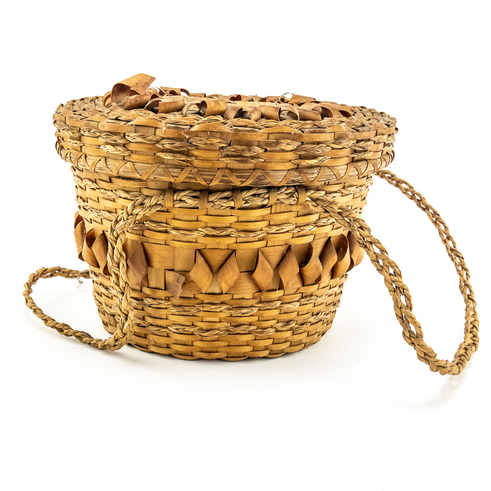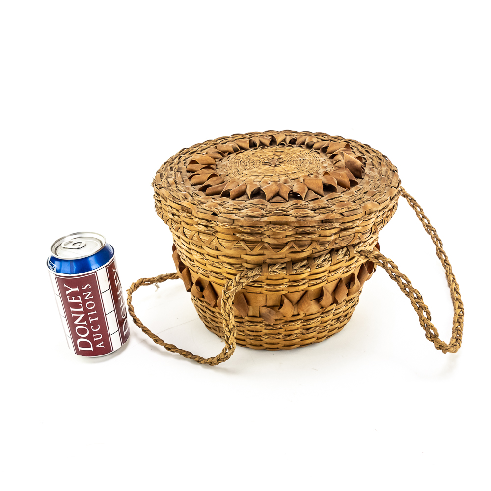This is a Penobscot basket circa 1940s crafted from ash splints and sweet grass. It features a round shape with a fitted lid, adorned with distinctive porcupine or curly cue weave pattern on both the lid and around the central portion of the body. It has woven handles as part of the body. On the interior are two strips that are red in color. The lid also has two ring strips of red dyed material. Affixed to the basket is a metal rimmed red tag with βPenobscot Maineβ written on it. Dimensions: 10β diameter x 7β tall. Base approximately 7β diameter. See photos.