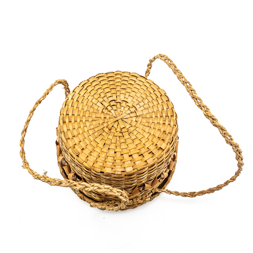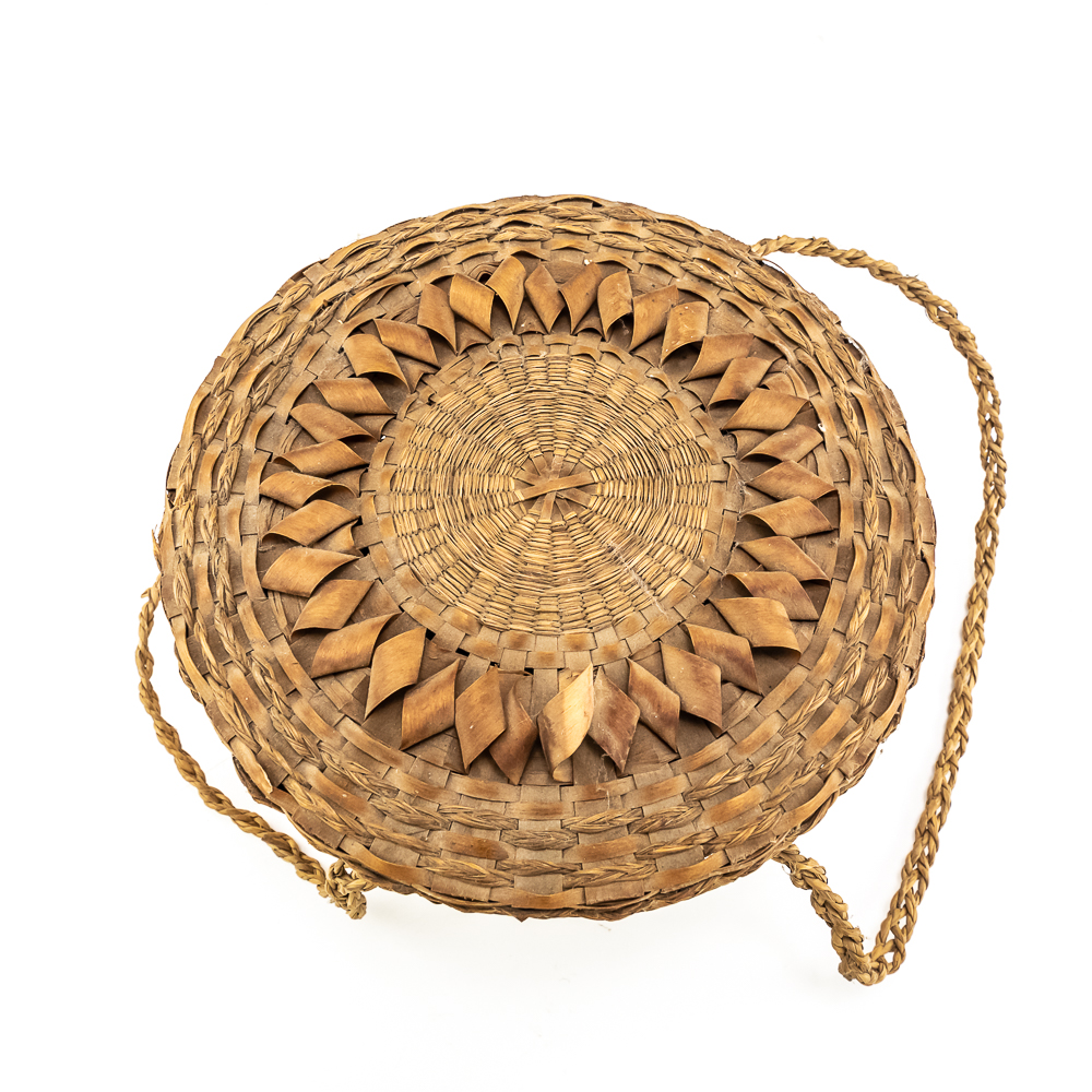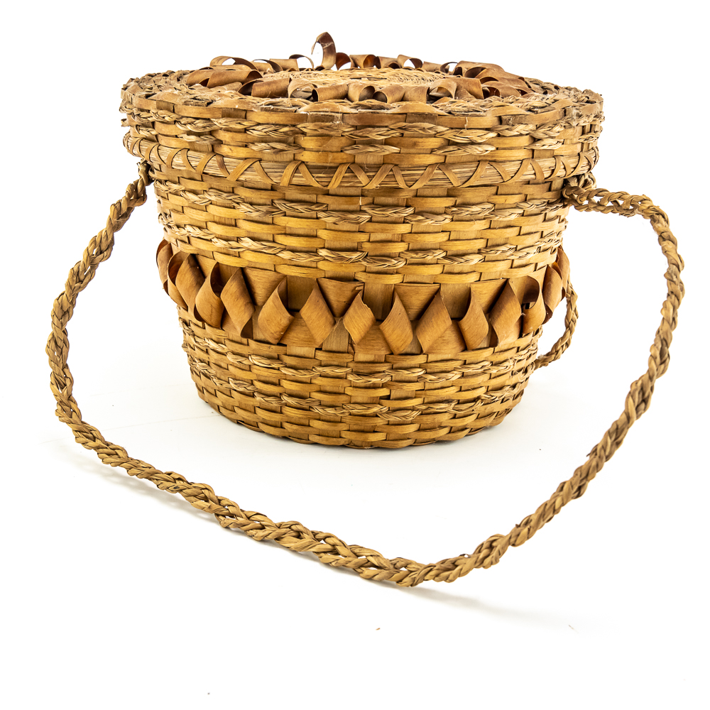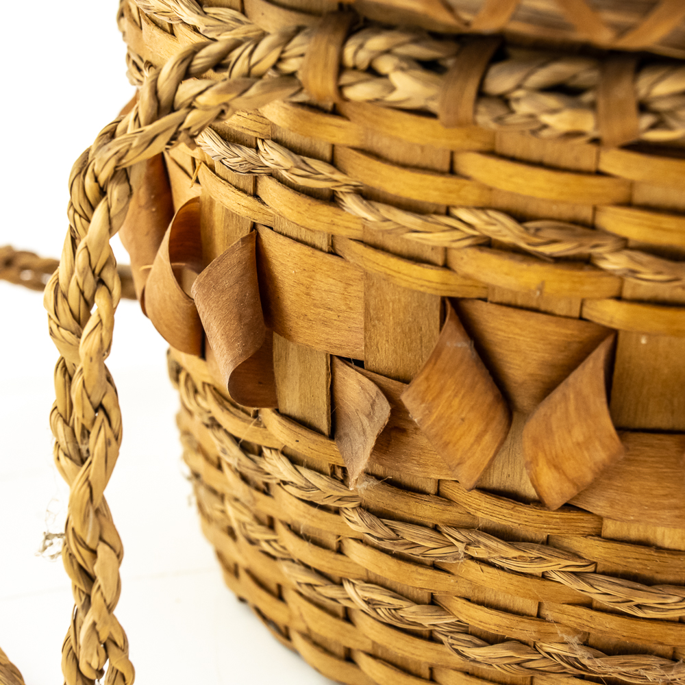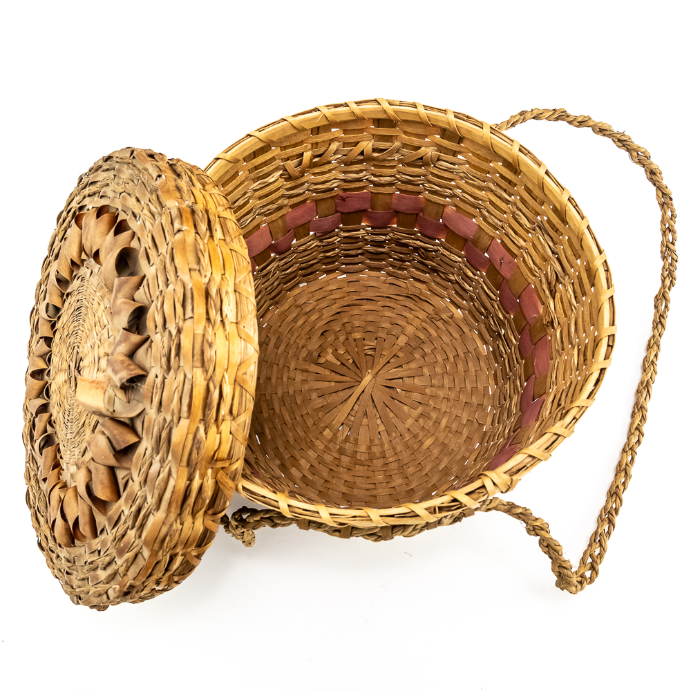 This is a Penobscot basket circa 1940s crafted from ash splints and sweet grass. It features a round shape with a fitted lid, adorned with distinctive porcupine or curly cue weave pattern on both the lid and around the central portion of the body. It has woven handles as part of the body. On the interior are two strips that are red in color. The lid also has two ring strips of red dyed material. Affixed to the basket is a metal rimmed red tag with βPenobscot Maineβ written on it. Dimensions: 10β diameter x 7β tall. Base approximately 7β diameter. See photos.
