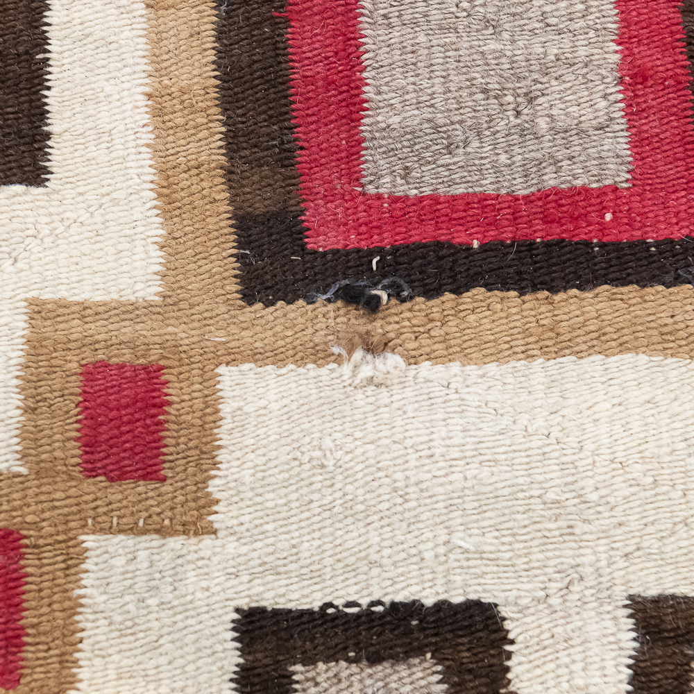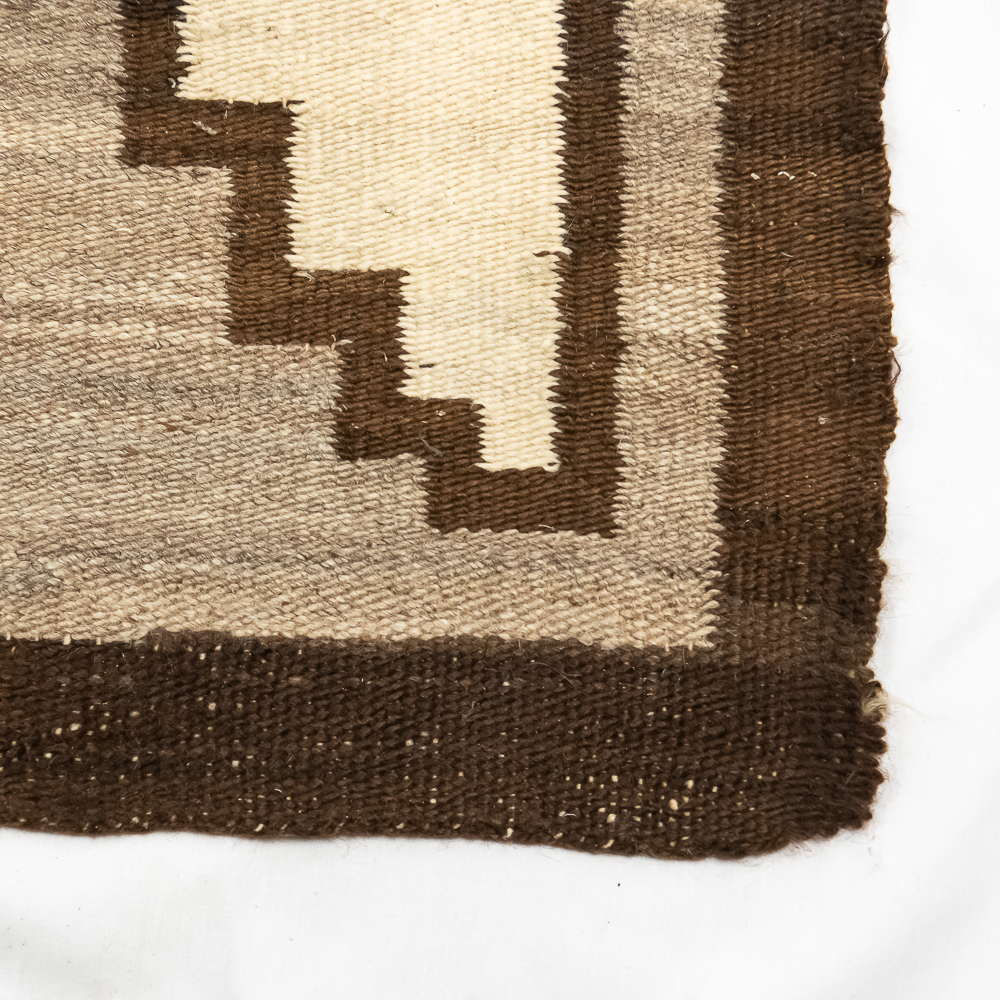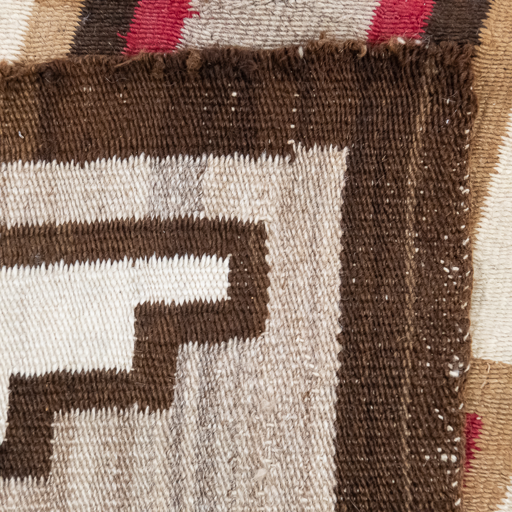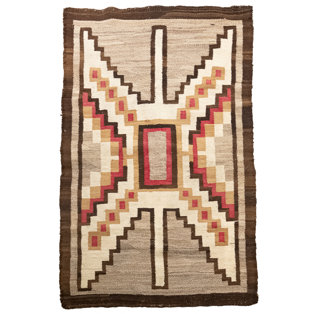 Mid-Century Navajo Storm Pattern blanket/rug circa 1940s. Classic storm pattern design featuring central and corner motifs connected by a diagonal lines. Woven wool with natural dyes and shades of tan brown, gray and red. In good condition with wear commensurate with age. A fine example of mid-20th century Navajo weaving. Dimensions: 61βx38β. See photos.