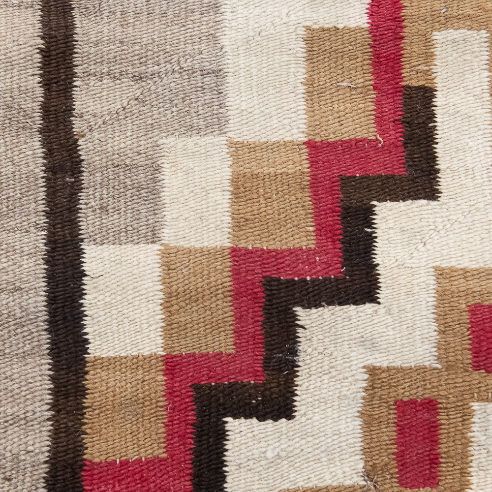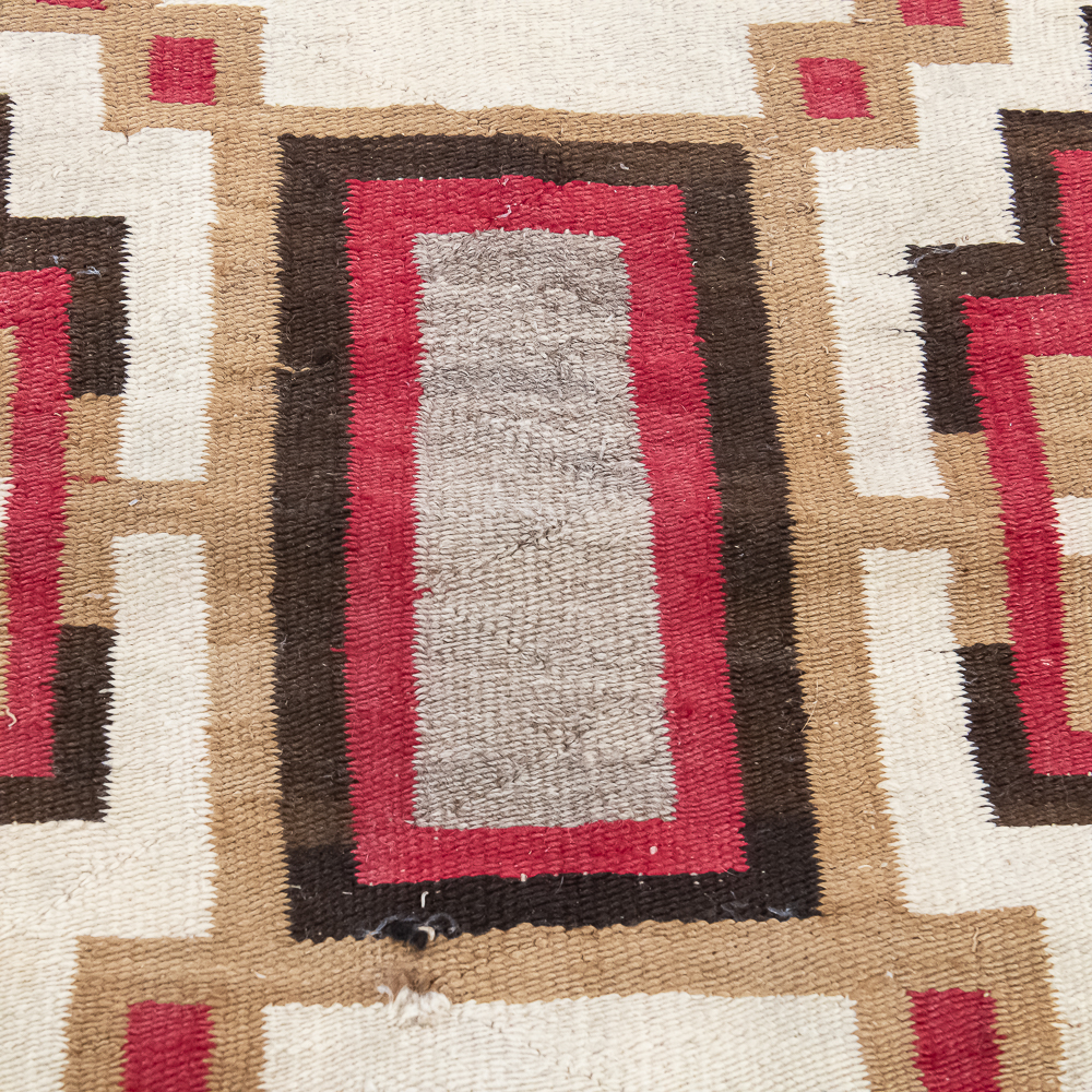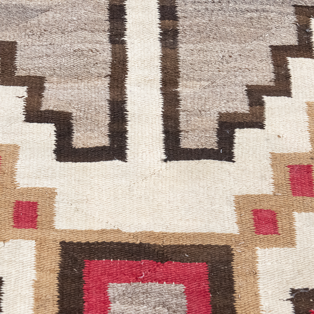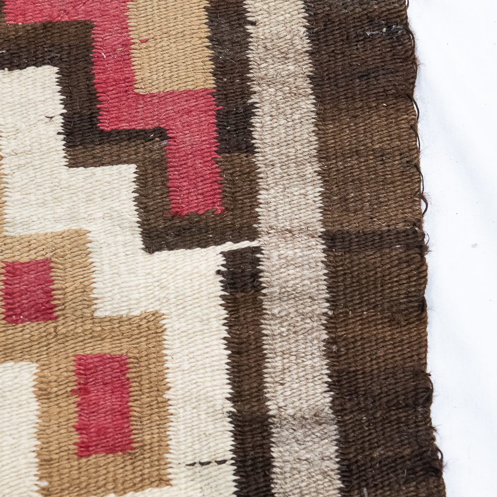 Mid-Century Navajo Storm Pattern blanket/rug circa 1940s. Classic storm pattern design featuring central and corner motifs connected by a diagonal lines. Woven wool with natural dyes and shades of tan brown, gray and red. In good condition with wear commensurate with age. A fine example of mid-20th century Navajo weaving. Dimensions: 61βx38β. See photos.