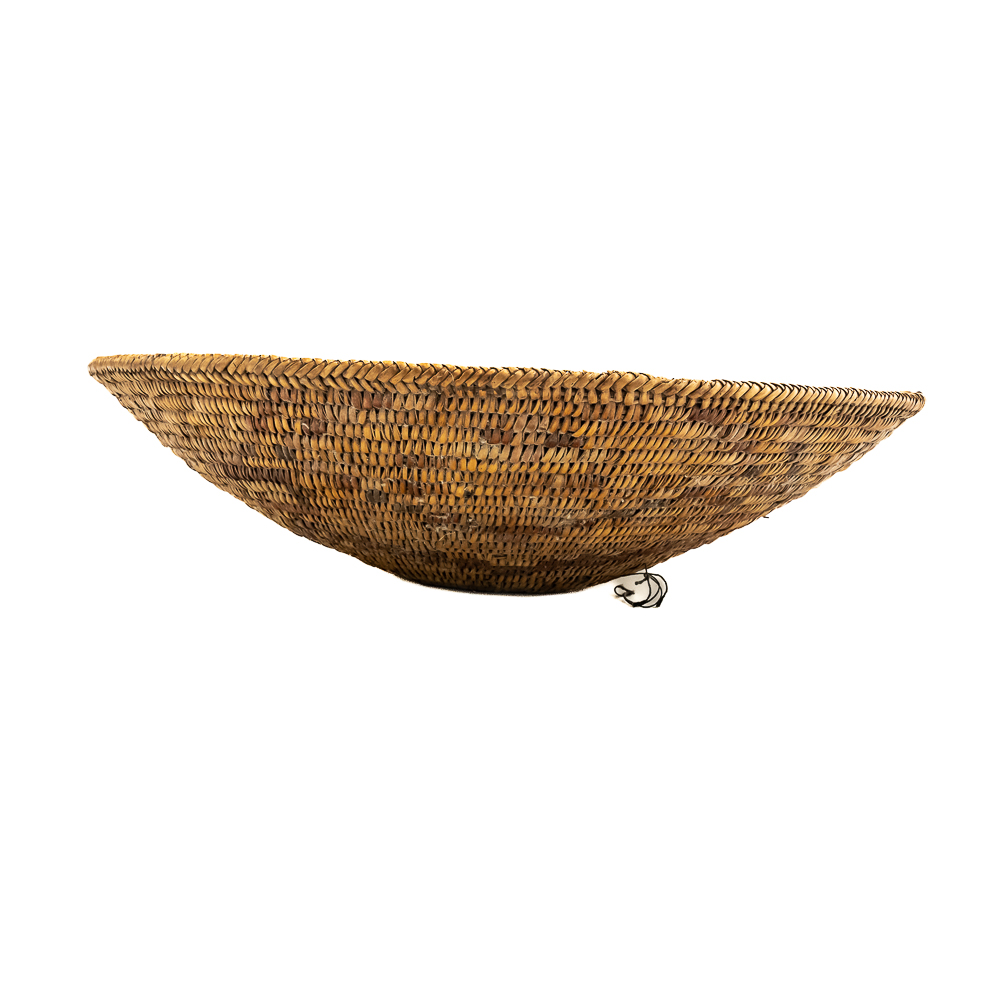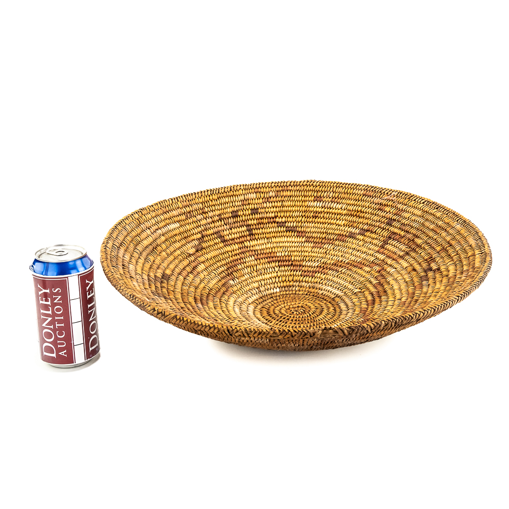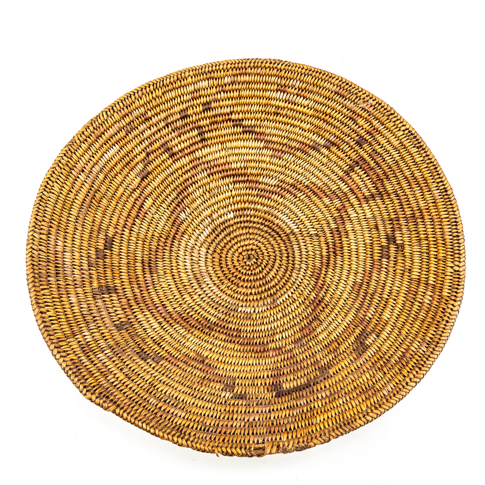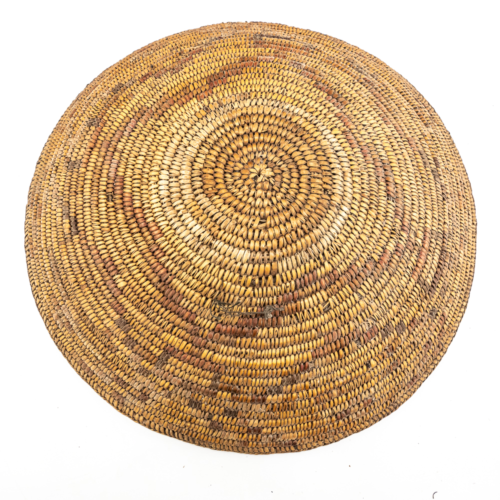 This Jicarilla Apache basket tray dates from the 1920s. It is made of natural fibers using a coil weave technique. The basket features concentric dark circles emanating from the center with some geometric designs, faintly visible in the background. The splints are possibly dyed with aniline dyes and red and darker shades. Jicarilla Apache baskets were traditionally used for winnowing grain or storing food. They are highly regarded as a celebrated art form within the Apache. Small damage to rim. Dimensions: 17.5” diameter x 4.25” tall. Base diameter approximately 4”. String through back for hanging. Please see photos.
