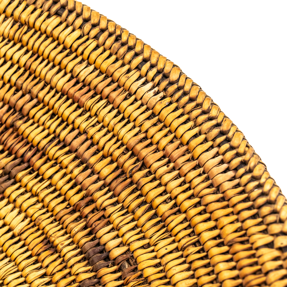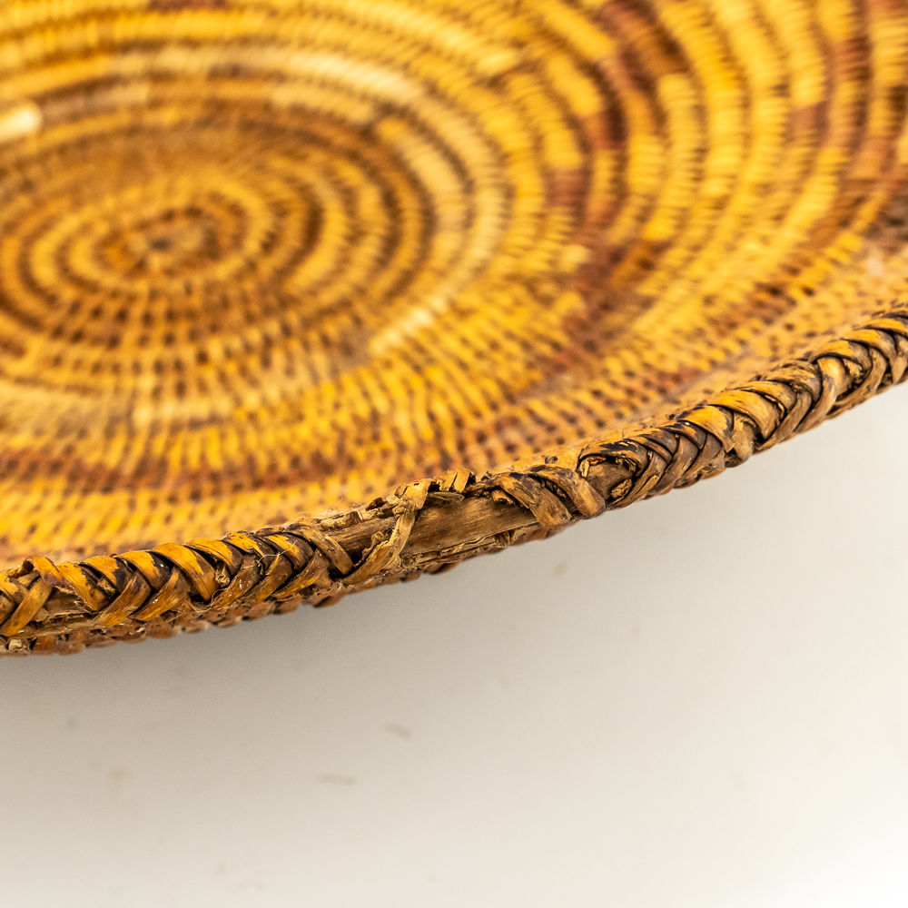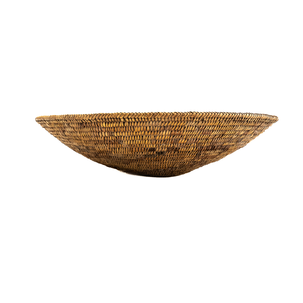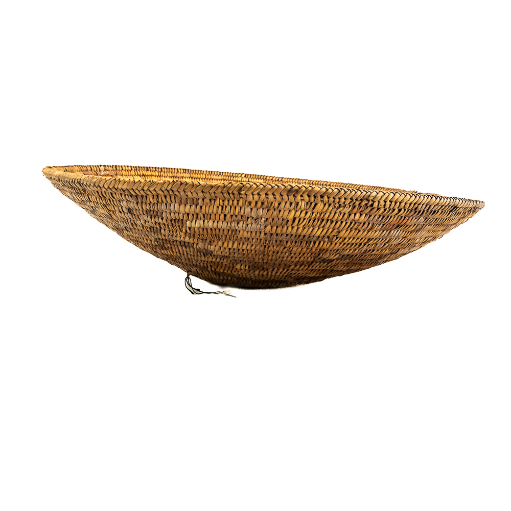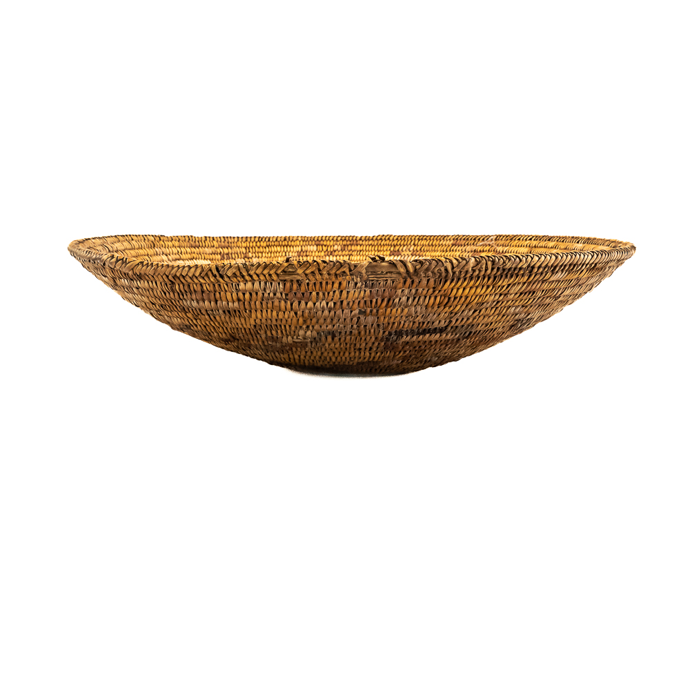 This Jicarilla Apache basket tray dates from the 1920s. It is made of natural fibers using a coil weave technique. The basket features concentric dark circles emanating from the center with some geometric designs, faintly visible in the background. The splints are possibly dyed with aniline dyes and red and darker shades. Jicarilla Apache baskets were traditionally used for winnowing grain or storing food. They are highly regarded as a celebrated art form within the Apache. Small damage to rim. Dimensions: 17.5” diameter x 4.25” tall. Base diameter approximately 4”. String through back for hanging. Please see photos.